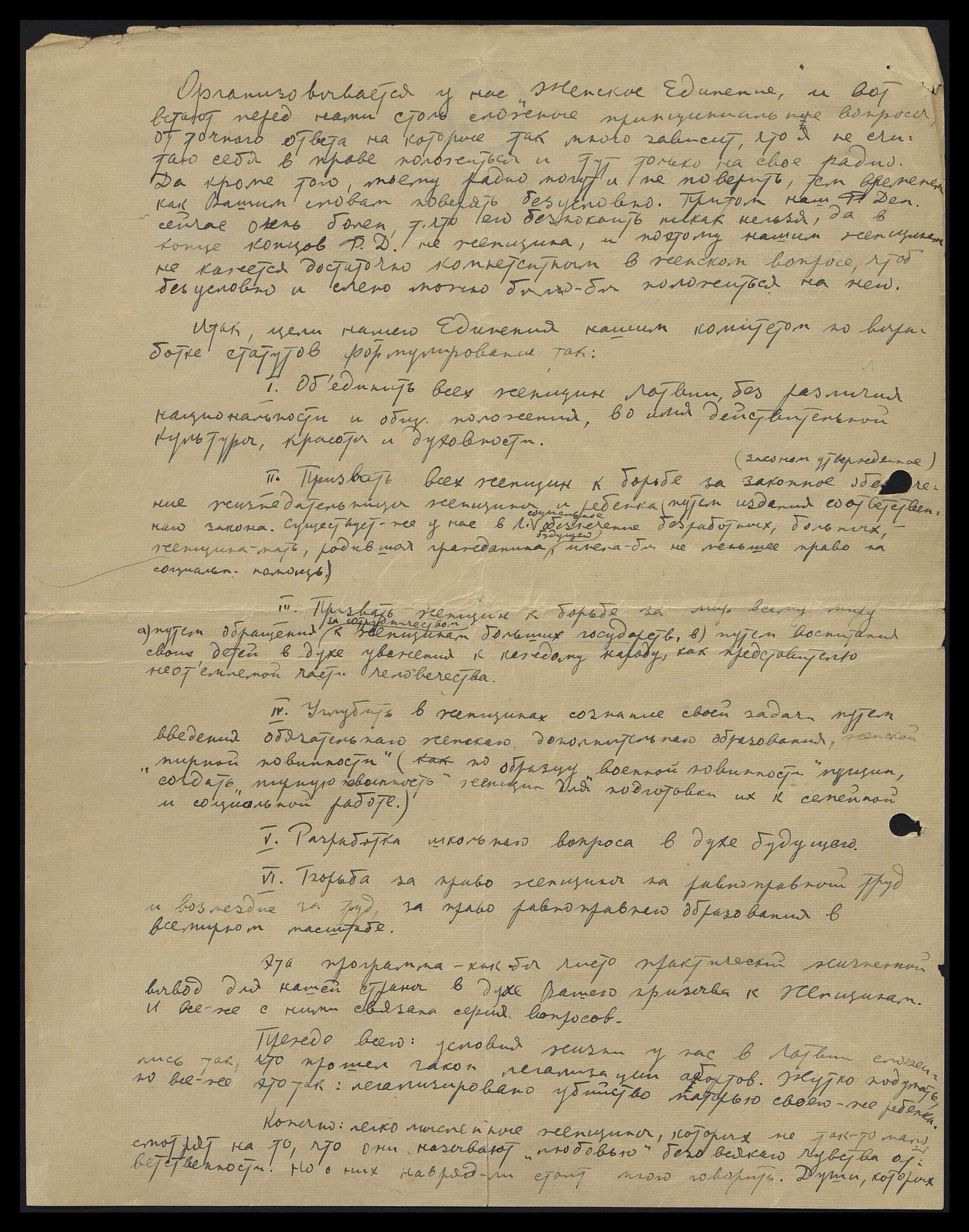 I. Объединить всех женщин Латвии без различия национальности и общественного положения во имя действительной культуры, красоты и духовности.