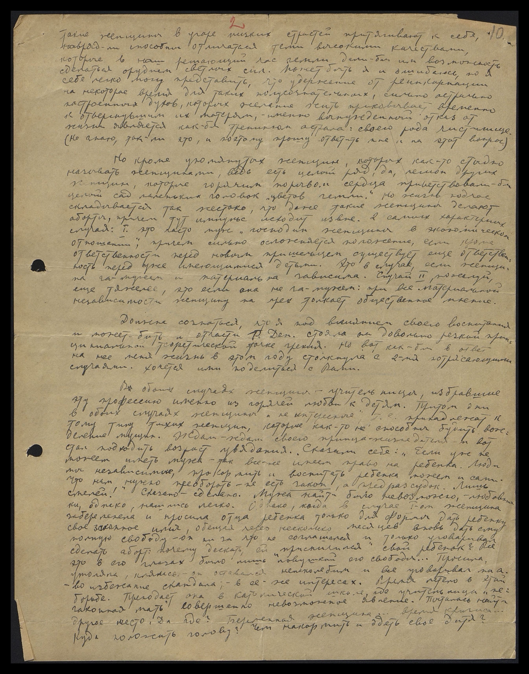 Говорят, что она всё читала "Сестру Беатриса" Метерлинка. После IV месяца я о ней ничего больше не слыхала и лишь недавно случайно узнала, что она преподает всё в той же школе, и всё по-прежнему считается безнадежной старой девой. Видно, ее рассудок взял верх над сердцем. А мой рассудок был готов осудить, но сердце за неё плачет, неумолчно вопрошает: прав ли рассудок? И тут, как ответ на вопрос, жизнь столкнула со случаем II. Начало, как упомянуто, такое же, но тут вопрос о "легализации" со стороны отца совершенно отпадал, ибо отец − женатый человек. Но вместе с тем оказался очень хорошим другом, понимающим и сочувствующим. Эта женщина своего ребенка выносила и родила с радостью. Но свою службу на основании этого потеряла, ибо "безнравственная женщина" и в городской школе не может быть учительницей. В нужде и унижении растет ребенок. Любит его мать крепко. Но одной любовью не накормить и не одеть дитя. За эту женщину еще больше болит сердце, но вместе с тем горит глубоким уважением. Но опять-таки рассудок спрашивает: в праве ли сердце? Ведь тут приходится ответить на коренной вопрос: имеет ли каждая женщина право на ребенка, т.е. является ли каждая женщина по существу своему законной открывательницей врат жизни для стремящихся к воплощению. Если ответить да, то этим ставится вопросительный знак под понятии семьи.