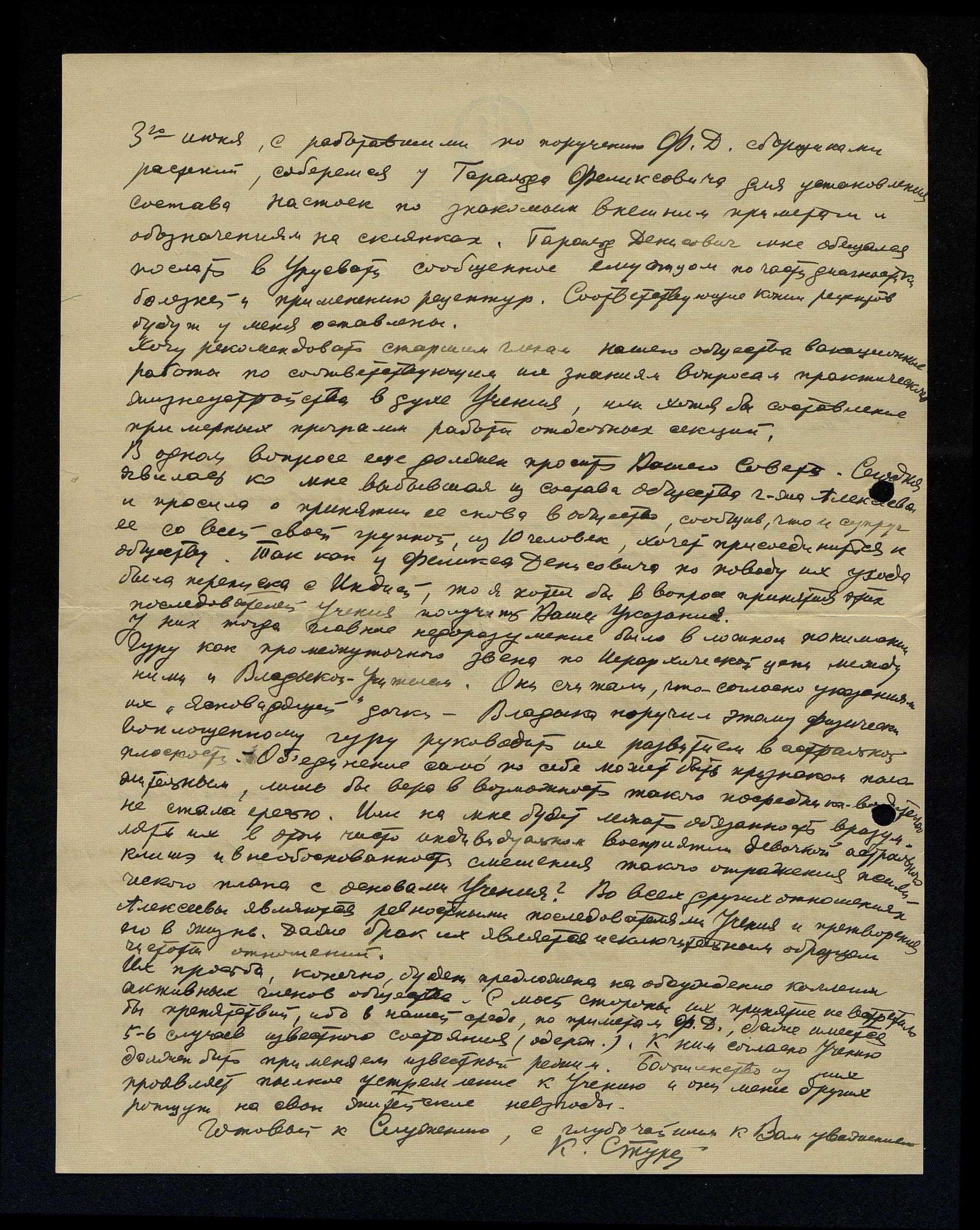 В одном вопросе ещё должен просить Вашего совета. Сегодня явилась мне выбывшая из состава общества г-жа Алексеева и просила о принятии её снова в общество, сообщив, что и супруг её со всей своей группой из 10 человек хочет присоединиться к обществу. Так как у Феликса Денисовича по поводу их ухода была переписка с Индией, то я хотел бы в вопросах принятия этих последователей Учения получить Ваши указания. У них тогда главное недоразумение было в ложном понимании Гуру как промежуточного звена по Иерархической цепи между ними и Владыкой-Учителем. Они считали, что согласно указаниям их "ясновидящей" дочки, Владыка поручил этому физически воплощённому гуру руководить их развитием в астральной плоскости. Объединение само по себе может быть признаком положительным, лишь бы вера в возможность такого посредника водителя не стало ересью. Или на мне будет лежать обязанность вразумлять их в этом чисто индивидуальном восприятии девочки астрального клише и в необоснованности смешения такого отражения психического плана с основами Учения? Во всех других отношениях Алексеевы являются ревностными последователями Учения и претворения его в жизнь. Даже брак их является исключительным образом чистоты отношений.