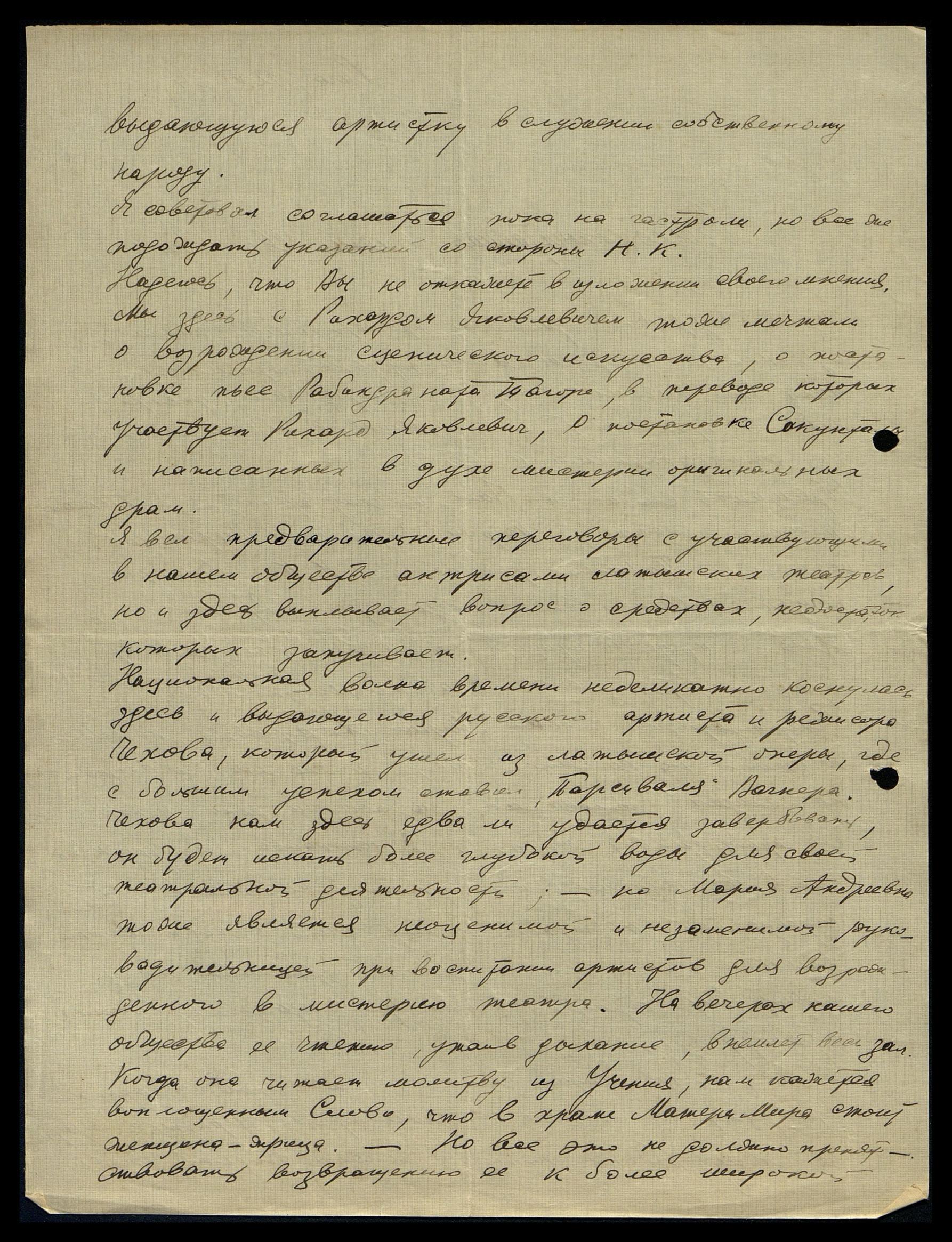 Надеюсь, что Вы не откажете в изложении своего мнения. Мы здесь с Рихардом Яковлевичем тоже мечтали о возрождении сценического искусства, о постановке пьес Рабиндраната Тагора, в переводе которых участвует Рихард Яковлевич, в постановке Сакунталы и написанных в духе мистерии оригинальных драм.