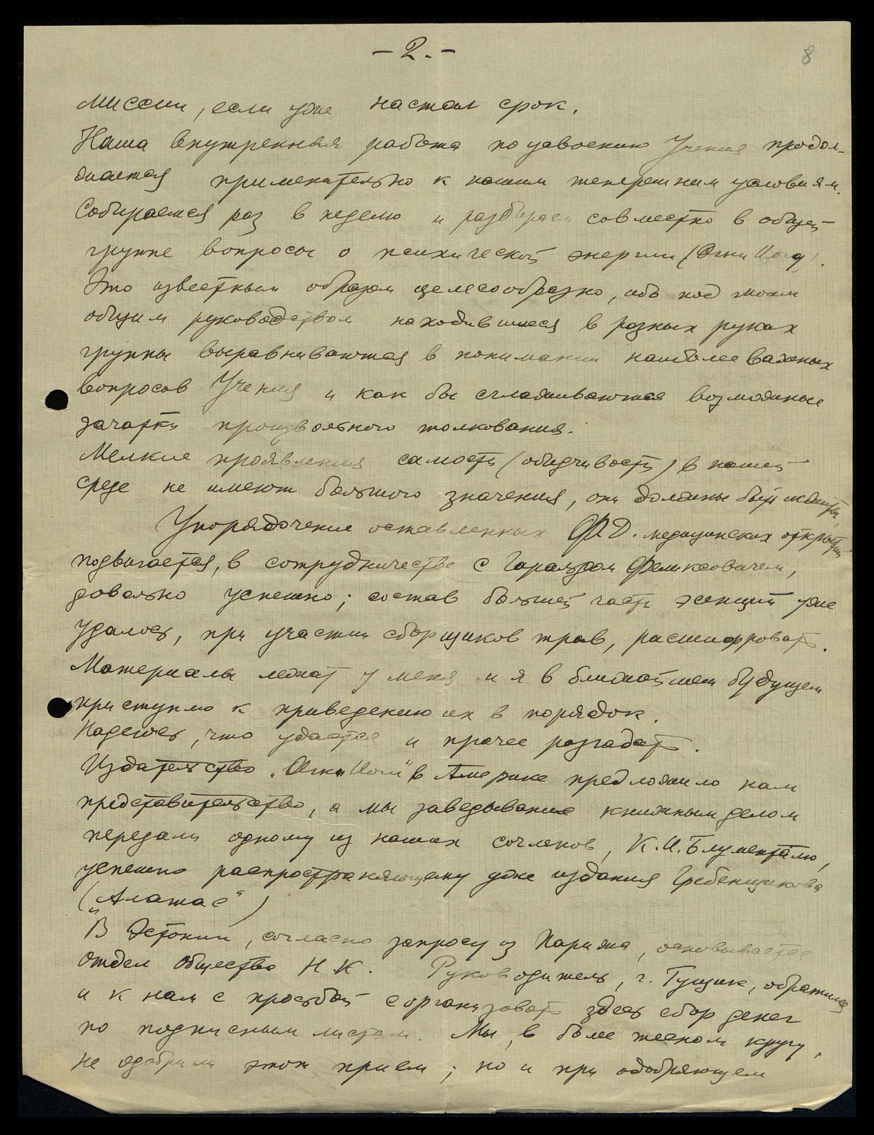 Брошюры "Знамя Преподобного Сергия", "Пути Благословления", биография Н.К.Рериха Дювернуа и прочие мы отправили и в Эстонию, и Литву, и в Чехословакию, и Югославию, с представителями прозревших кружков коих стран, поддерживающих переписку. Пишет мне и г. Тарасов из Франции и через посредство третьего лица просит о высылке книжки, о которой Владимир Анатольевич [Шибаев] писал Рихарду Яковлевичу [Рудзитису]. Экземпляры этой книжки, насколько мне удалось определённо выяснить, уничтожены, за исключением одного, взятого с собой г. Кардашевским. Я избегаю об этом в Францию писать. В случае непосредственного запроса отвечу, что этого издания у нас не имеется.
