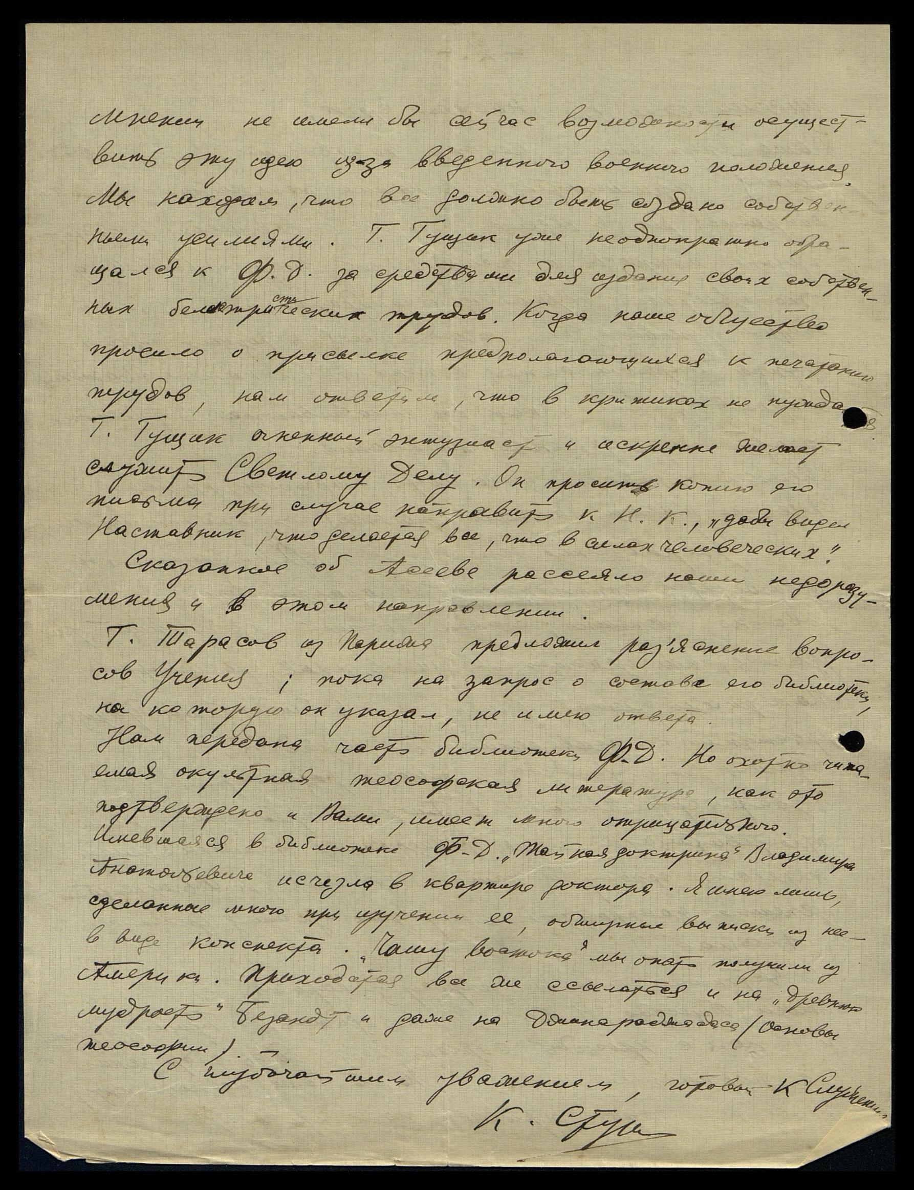 Нам передана часть библиотеки Ф.Д. Но охотно читаемая оккультная теософская литература, как это подтверждается Вами, имеет много отрицательного. Имевшаяся в библиотеке Ф.Д. "Тайная Доктрина" Владимира Анатольевича [Шибаева] исчезла в квартире доктора. Я имею лишь сделанные мною при изучении её обширные выписки из неё в виде конспекта. "Чашу Востока" мы опять получили из Америки. Приходится всё же ссылаться на "Древнюю мудрость" Безант и даже на Джинараджадаса (основы теософии).