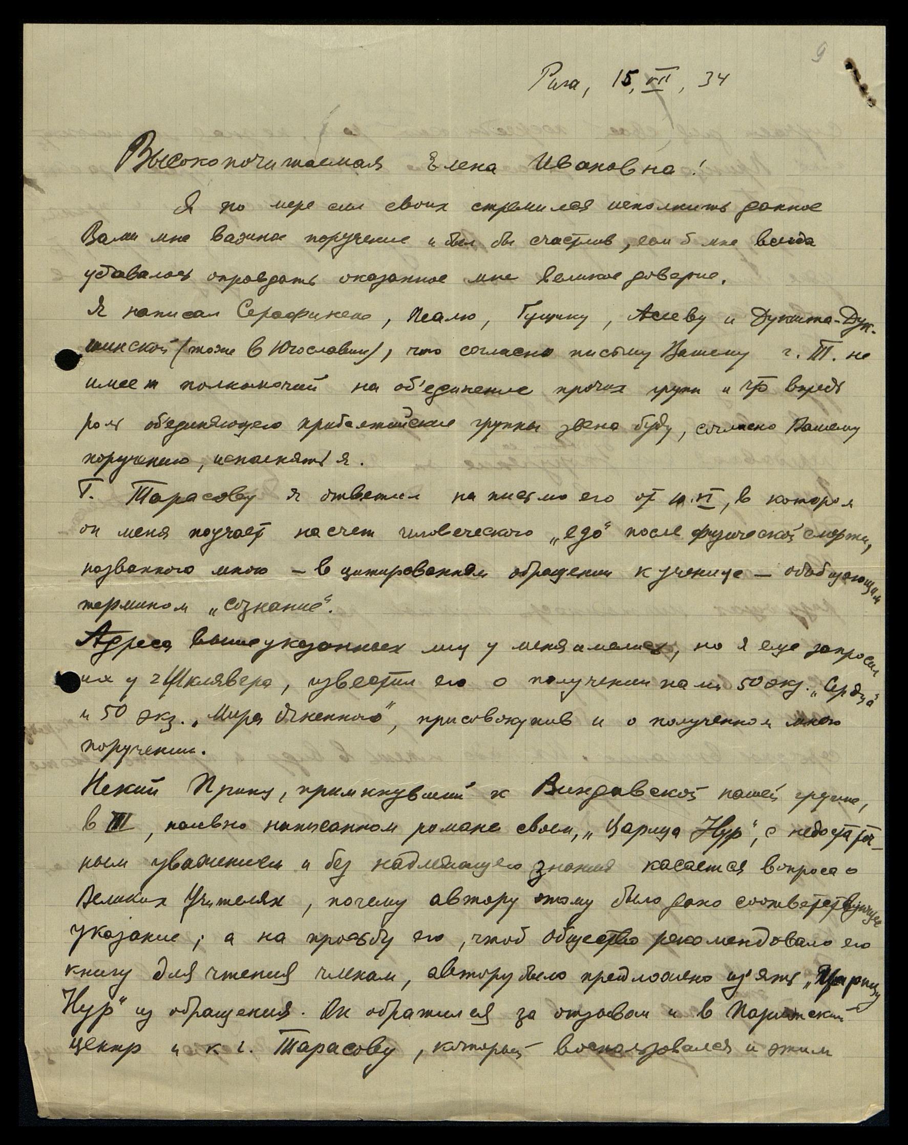 Я написал Серафинене, Пеалю, Гущику, Асееву и Дукшта-Дукшинской (тоже в Югославии), что согласно письму Вашему г-н Тарасов* не имеет полномочий на объединение прочих групп и что впредь роль объединяющего прибалтийские группы звена буду, согласно Вашему поручению, исполнять я.