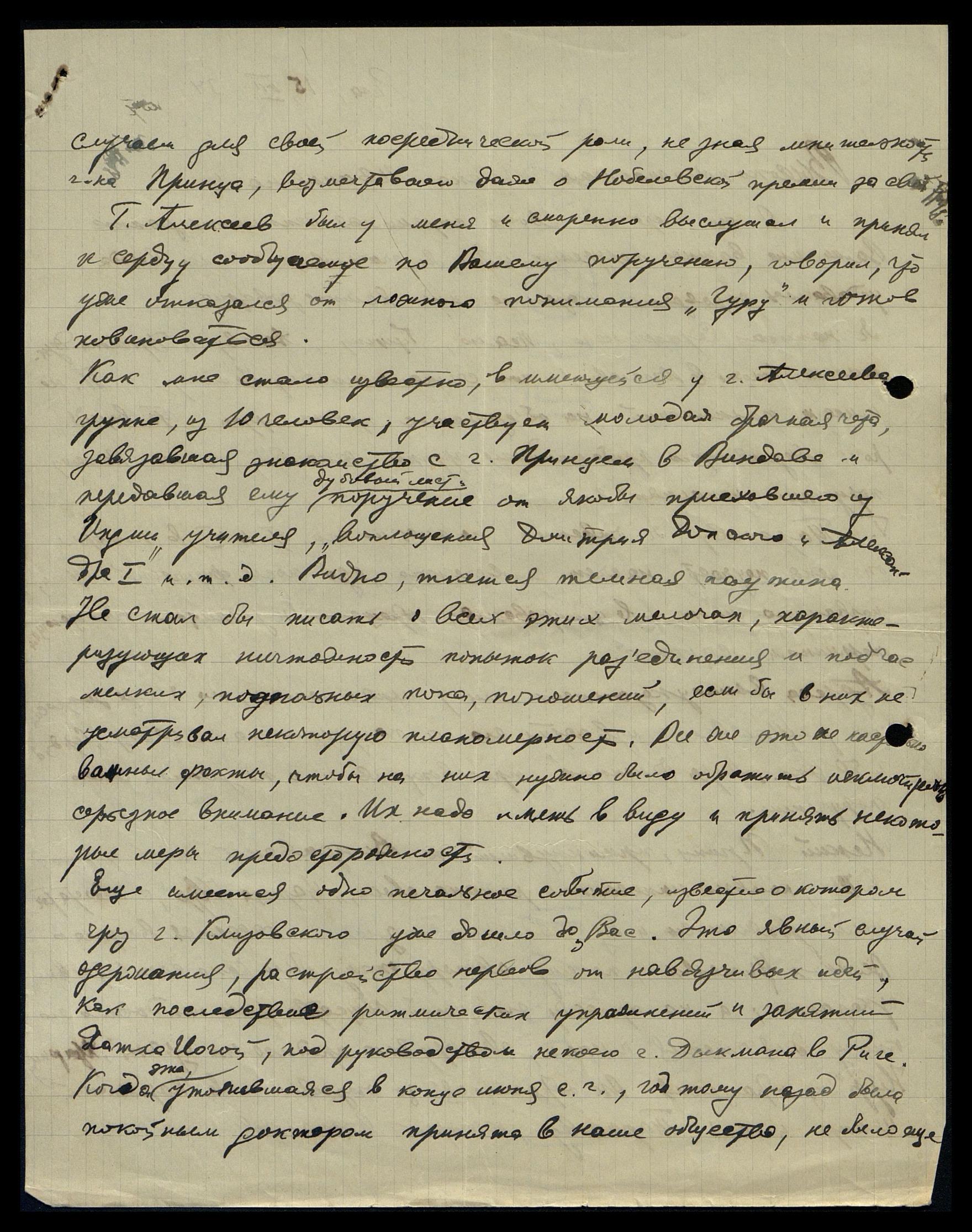 случаем для своей посреднической роли, не зная мнительности г-на Принца, возмечтавшего даже о Нобелевской премии за свой труд. Г-н Алексеев был у меня, и смиренно выслушал и принял к сердцу сообщаемое по Вашему поручению, говорил, что уже отказался от ложного понимания "Гуру" и готов повиноваться.