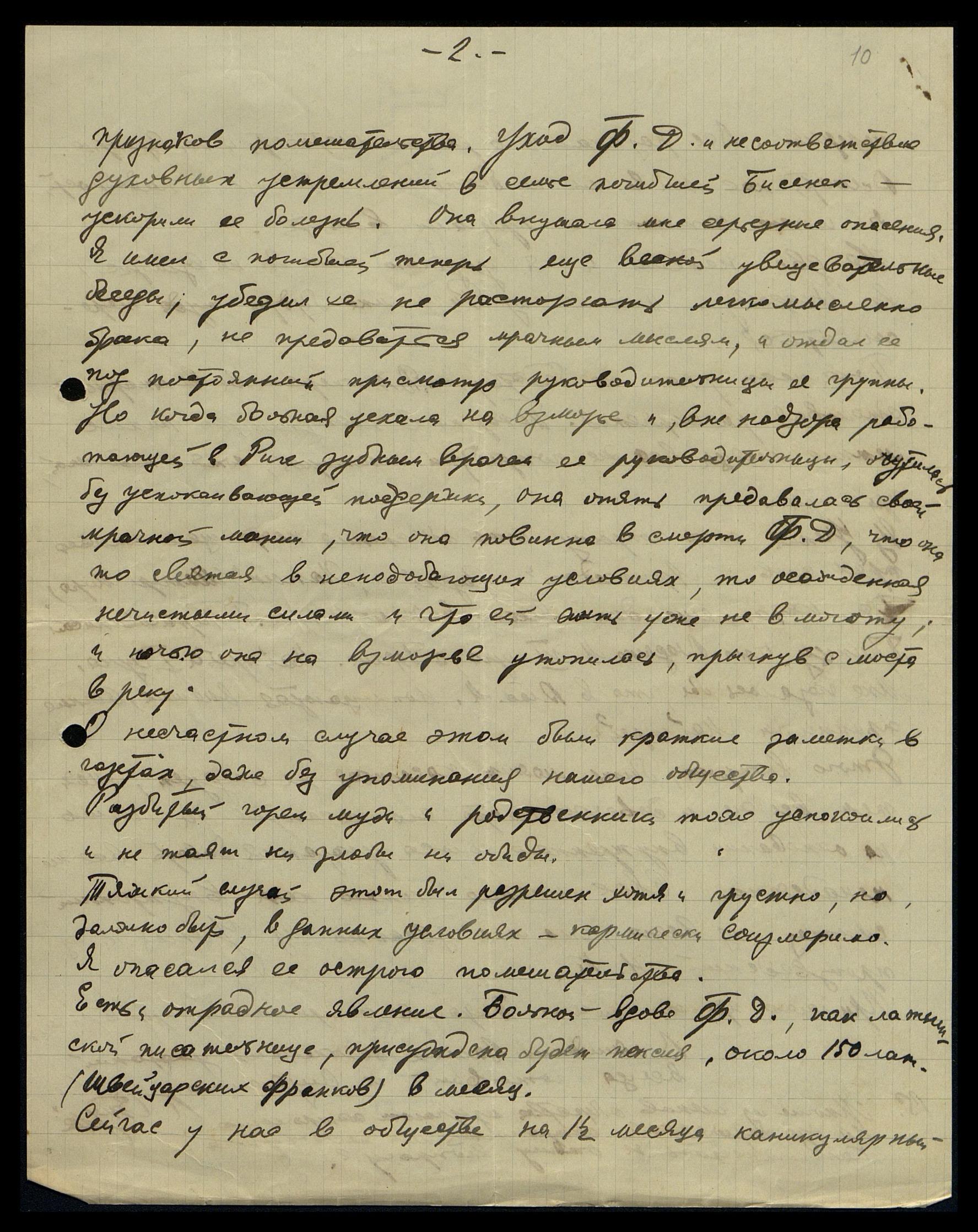 признаков помешательства. Уход Ф.Д и несоответствие духовных устремлений в семье погибшей Бисенек ускорили её болезнь. Она внушала мне серьёзные опасения. Я имел с погибшей ещё весной увещевательные беседы; убедил её не расторгать легкомысленно брака, не предаваться мрачным мыслям, и отдал её под постоянный присмотр руководительницы её группы. Но когда больная уехала на взморье и вне надзора работающей в Риге зубным врачом её руководительницы осталась без успокаивающей поддержки, она опять предавалась своей мрачной мании, что она повинна в смерти Ф.Д,, что она то святая в неподобающих условиях, то осаждённая нечистыми силами и что ей жить уже невмоготу; и ночью она на взморье утопилась, прыгнув с моста в реку.