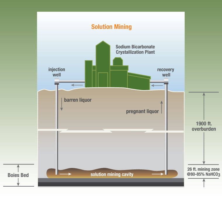 Природная сода восстанавливает бикарбонат натрия с помощью процесса, известного как добыча раствора. Это включает в себя закачку горячей воды примерно на 1900 футов [580 метров] под землю для растворения нижележащих слоев нахколита и возврата воды, насыщенной бикарбонатом, на поверхность. Насыщенный рассол перекачивается обратно на перерабатывающий комплекс, где извлекается бикарбонат натрия.