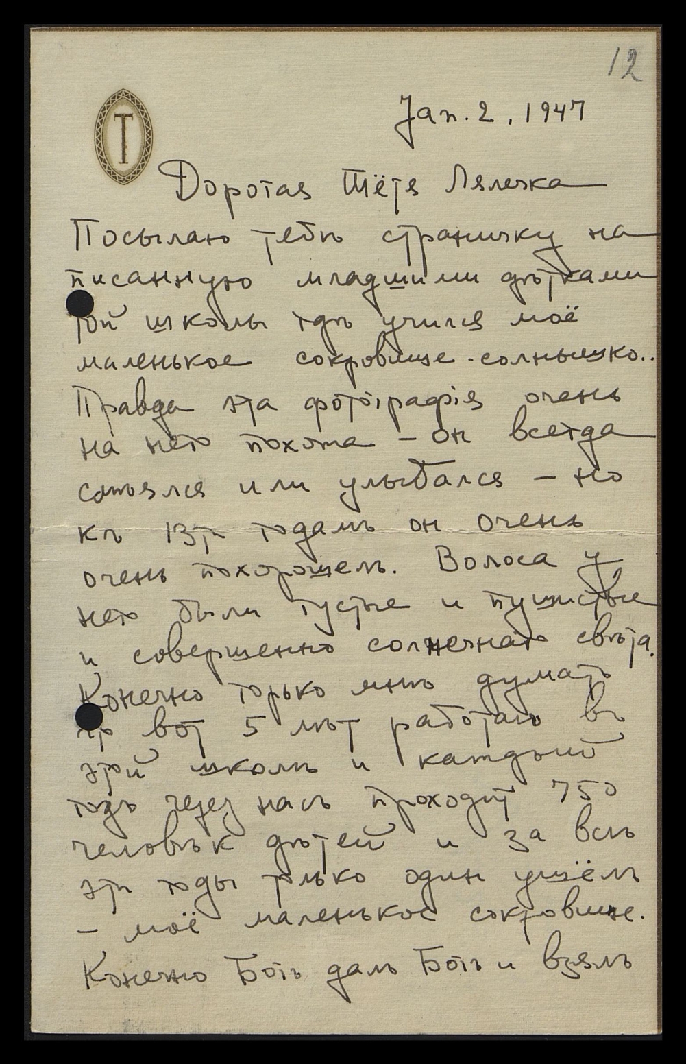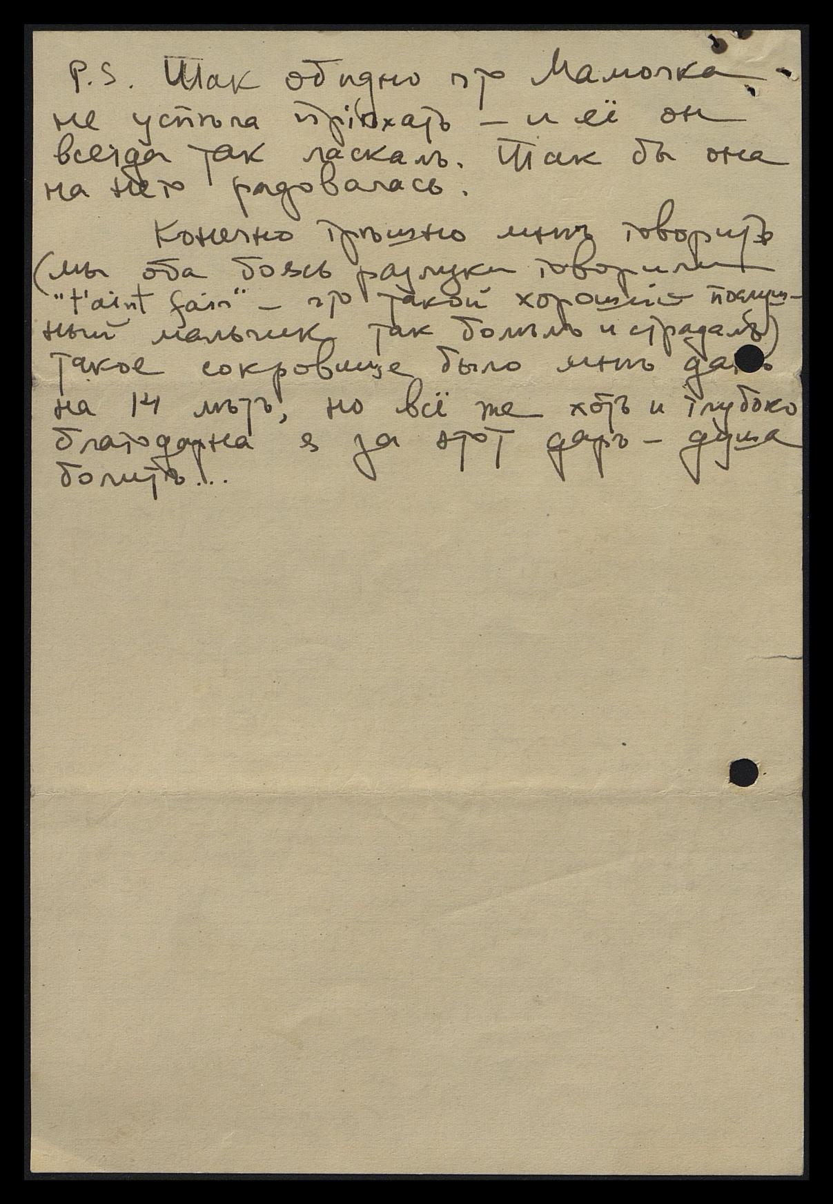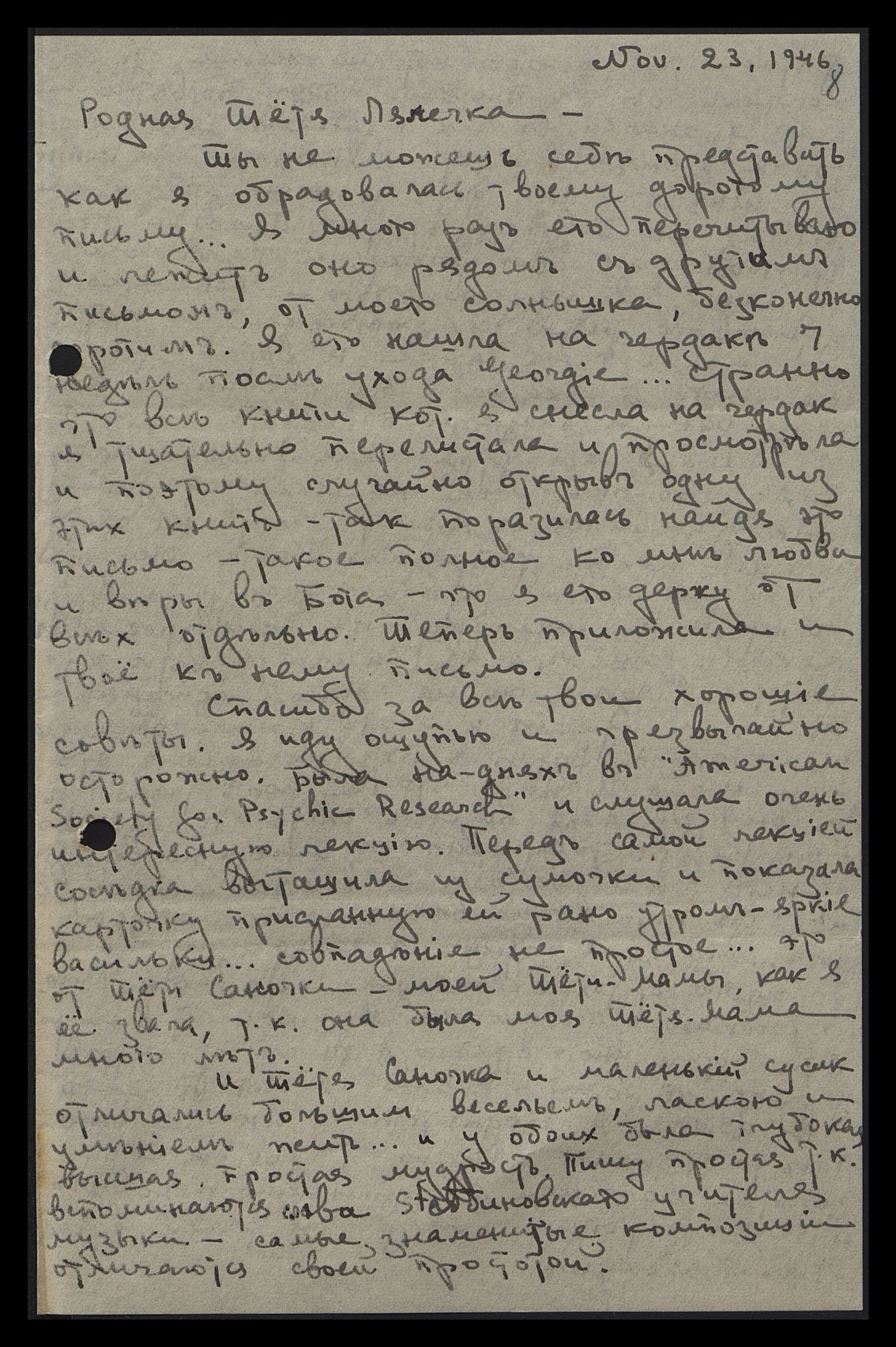 Ты не можешь себе представить, как я обрадовалась твоему дорогому письму... Я много раз его перечитываю, и лежит оно рядом с другим письмом от моего солнышка, бесконечно дорогим. Я его нашла на чердаке 7 недель после ухода Georgie... странно, что все книги, кот[орые] я снесла на чердак, я тщательно перелистала и просмотрела, и поэтому случайно открыла одну из этих книг. Так поразилась, найдя это письмо, такое полное ко мне любви и веры в Бога, что я его держу от всех отдельно. Теперь приложила твоё к нему письмо.