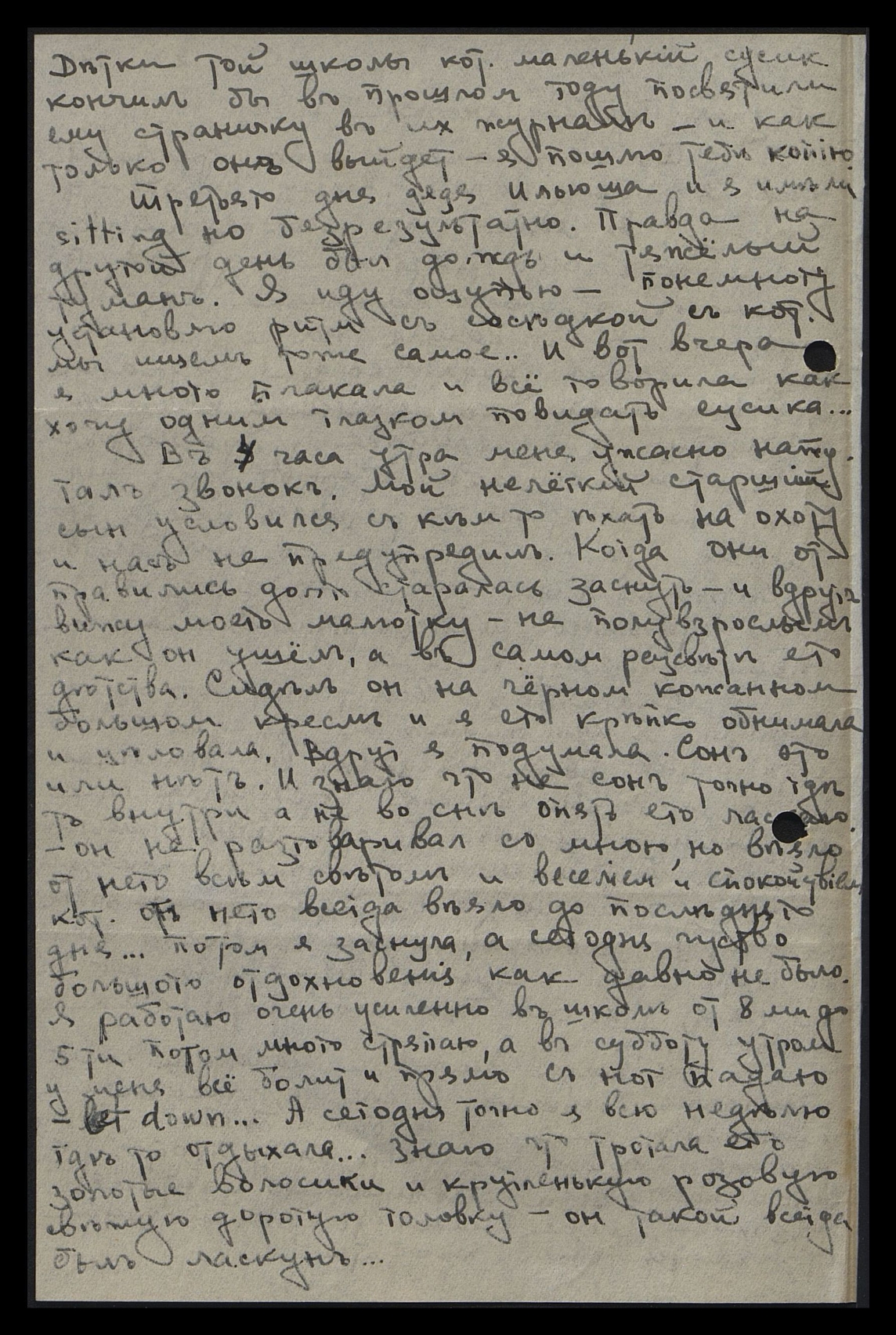 В 4 часа утра меня ужасно напугал звонок. Мой нелёгкий старший сын условился с кем-то ехать на охоту и нас не предупредил. Когда они отправились, долго старалась заснуть и вдруг вижу моего малютку не полувзрослым, как ушёл, а в самом расцвете его детства. Сидел он на чёрном кожаном большом кресле, и я его крепко обнимала и целовала. Вдруг я подумала — сон это или нет. И знаю, что не сон точно где-то внутри, а не во сне опять его ласкаю, он не разговаривал со мною, но веяло от него всем светом и весельем, и спокойствием, кот[орым] от него всегда веяло до последнего дня... Потом я заснула, а сегодня чувство большого отдохновения, как давно не было. Я работаю очень усиленно в школе от 8-ми до 5-ти, потом много стряпаю, а в субботу утром у меня всё болит и прямо с ног падаю, get dоwn [англ.: спускаюсь]... А сегодня точно я всю неделю отдыхала. Знаю, что трогала его золотые волосики и кругленькую, розовую, свежую, дородную головку, он такой всегда был ласкун...