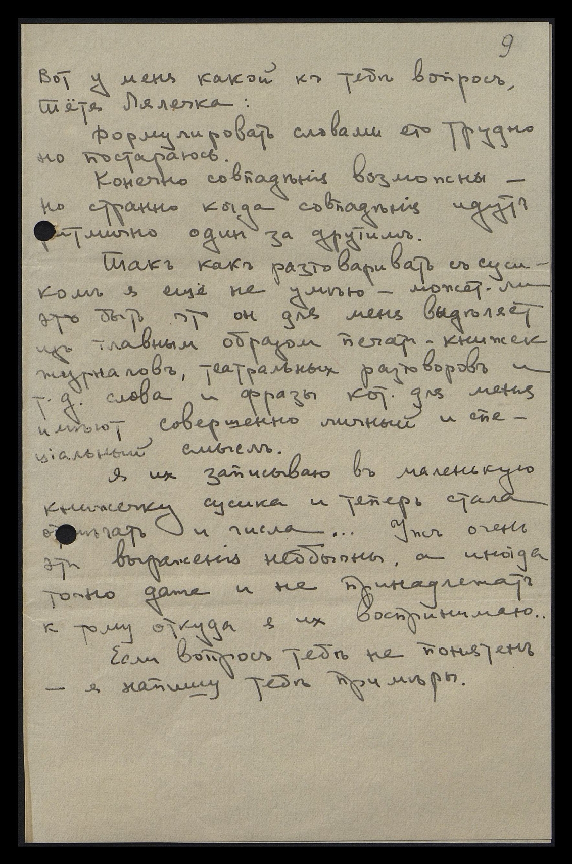 Так как разговаривать с сусиком я ещё не умею, может ли это быть, что он для меня выделяет из, главным образом, печати, книжек, журналов, театральных разговоров и т.д. слова и фразы, кот[орые] для меня имеют совершенно личный и специальный смысл. Я их записываю в маленькую книжечку сусика и теперь стала отмечать и числа... Уж очень эти выражения необычны, а иногда точно даже и не принадлежат к тому, откуда я их воспринимаю...