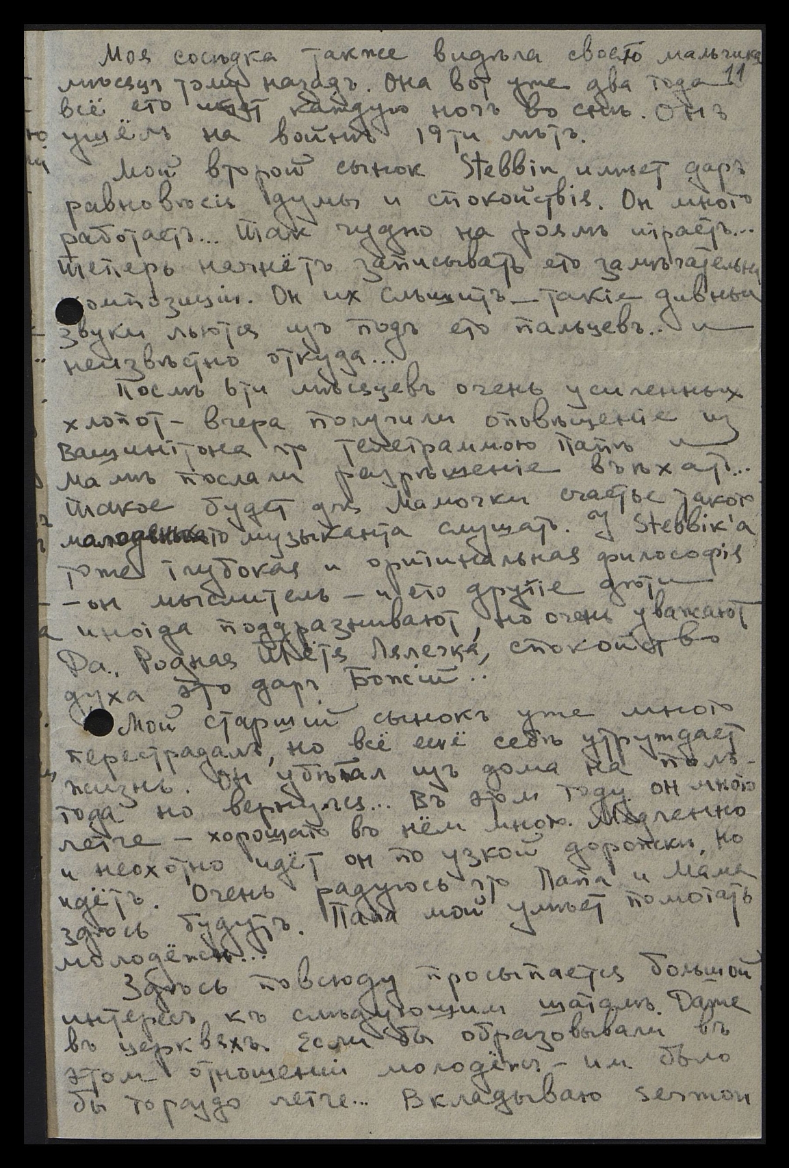 После 6-ти месяцев очень усиленных хлопот, вчера получили оповещение из Вашингтона, что телеграммою папе и маме послали разрешение въехать... Такое будет для мамочки счастье такого молоденького музыканта слушать. У Stebbiк'a тоже глубокая и оригинальная философия, он - мыслитель, и его другие дети иногда поддразнивают, но очень уважают. Да, Родная Тётя Лялечка, спокойствие духа - это дар Божий...