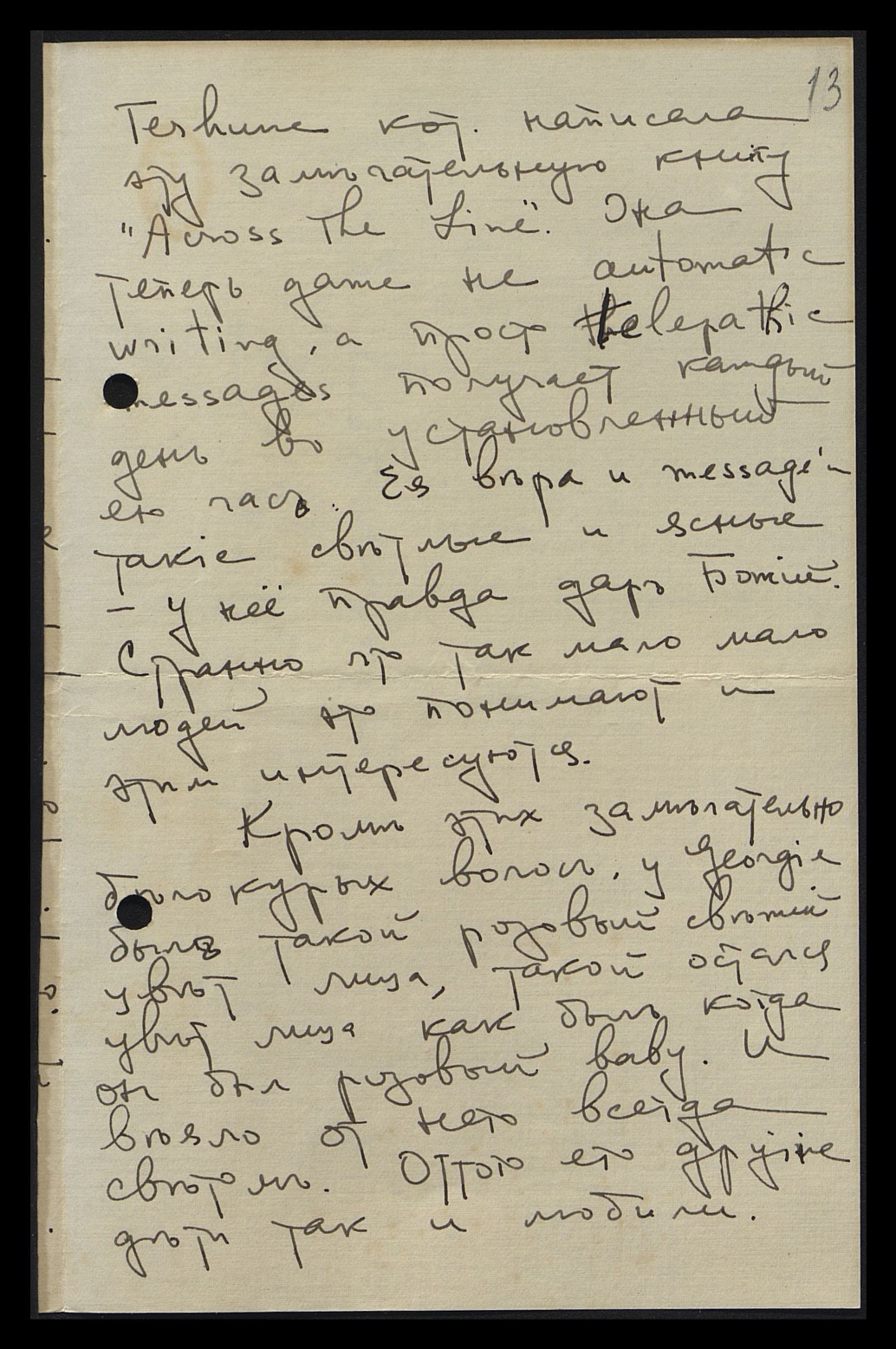 Teshune, кот[орая] написала эту замечательную книгу "Across the Line". Она теперь даже не automatic writing [англ.: автоматическое письмо], а просто Telepatic messages [англ.: телепатические послания] получает каждый день, в установленный ею час. Её вера и message's такие светлые и ясные, у неё правда дар Божий. Странно, что так мало, мало людей это понимают и этим интересуются.