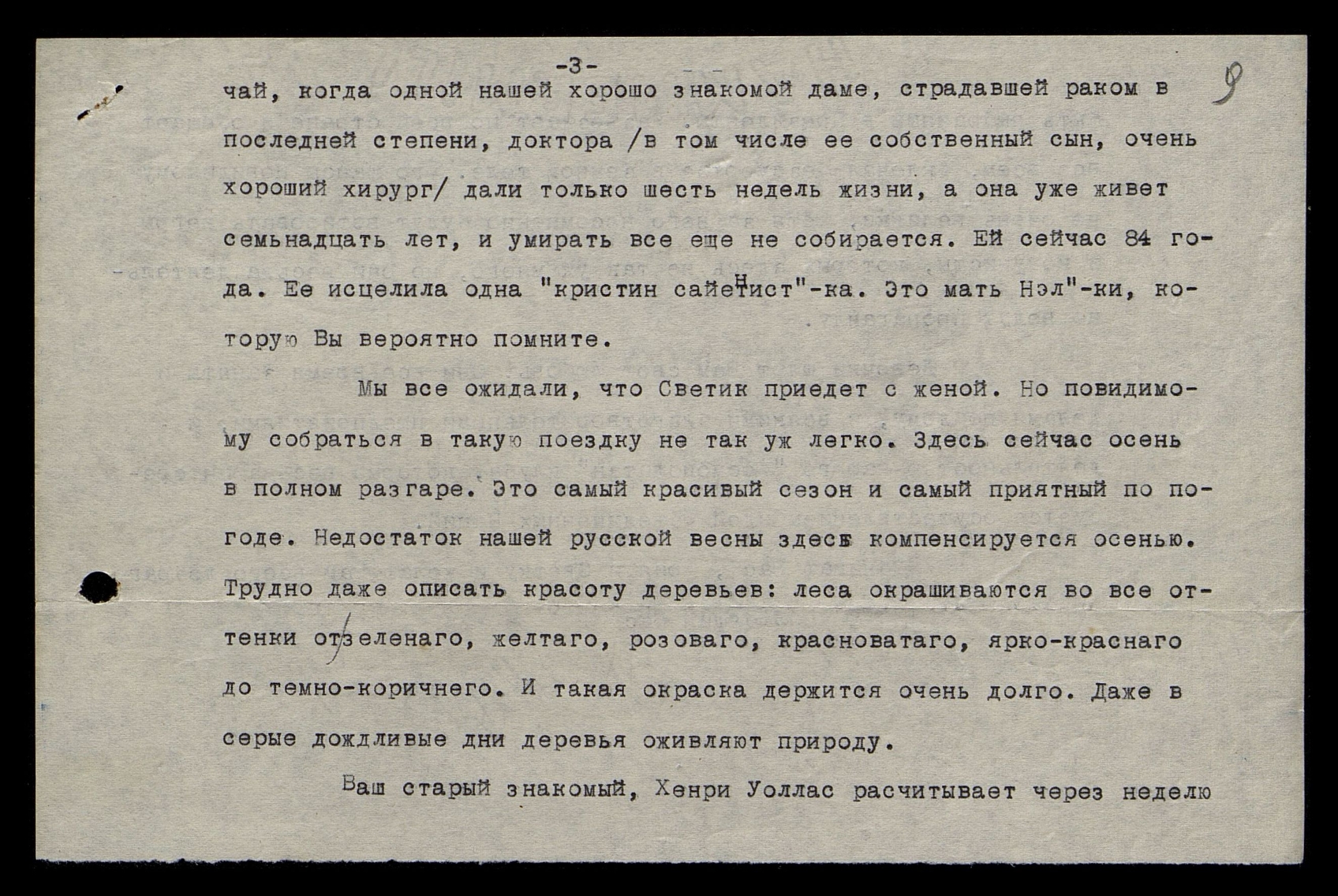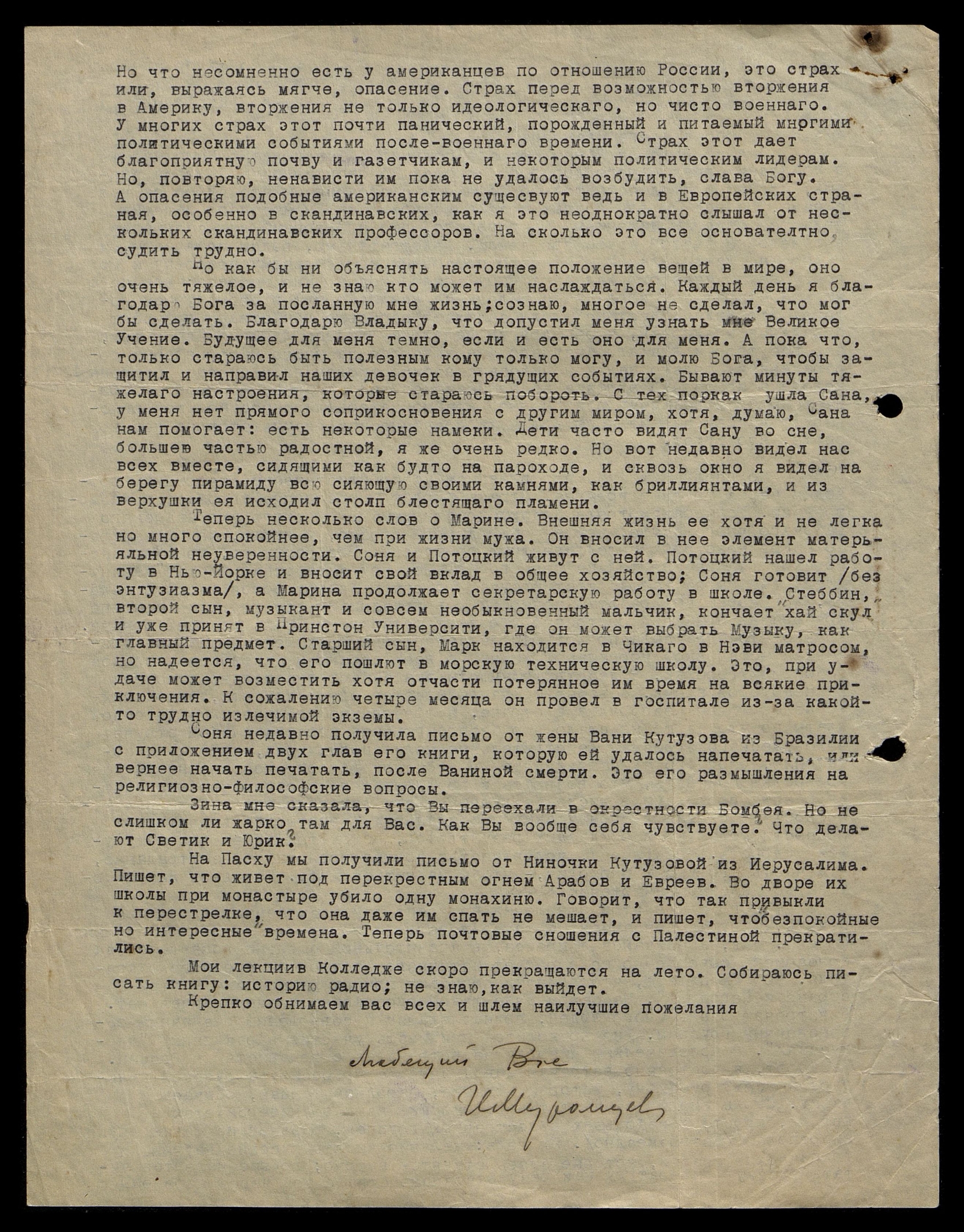 От Зины узнал, что Вы были серьёзно больны, но что, слава богу, теперь Вы поправились. Как Вы себя чувствуете? Как хорошо, что там, где Вы теперь поселились, не жарко. Я ведь тоже не люблю жары, и с годами эта нелюбовь, по-видимому, делается хуже... Давно уже не имеем от Вас вестей прямых. Ваши письма для нас всегда такое удовольствие... Недавно я разбирал свои дела и перечитывал письма за старые годы от Вас и от Ник[олая] Конст[антиновича]. Как переменилась обстановка, как изменился мир. Мне прошлое, даже сравнительно недавнее, кажется таким счастливым. Разбор моих писем тоже напомнил мне, что с 1924 года я не имел вестей ни от моих братьев, ни от сестры, ни от племянниц, которые тогда ещё жили в Москве и учились. Может быть, их никого уж нет в живых. Также почти 20 лет не было прямых сведений ни от Коки, ни от Бобы. Последнее, что мы имели, были расписки от Люды перед войной. Подумайте, такие средневековые результаты в наше время с громадным развитием средств сообщения. Из близких только и остались Марина, да Соня и Дима. Сын Марины Стеббин, о котором я Вам писал несколько раз, − замечательно славный юноша − только что окончил среднюю школу и осенью пойдёт в Принстонский университет. Теперь попасть туда страшно трудно, благодаря громадной конкуренции. А попадёшь туда, жить там трудно − дорого. Но вот благодаря энергии Марины, выхлопотавшей ему "сколаршип", и благодаря замечательным отзывам учителей школы и рекомендации "министра" церкви, к которой он принадлежит, его не только приняли, но дадут ему там какую-то работу, чтобы он смог оплачивать свою жизнь в Принстоне и учение. Старший сын Марины Марк ("Туки"), который было бежал из дому, бродил и не [о]кончил школы, слава богу, по-видимому, угомонился, попал в "Неви". Внесемейная дисциплина и отсутствие дурных влияний, которым он подвергался здесь, по-видимому, повлияли на него хорошо. Он даже мечтает − и не без надежды на выполнение − попасть в Морской Корпус в Аннаполисе,