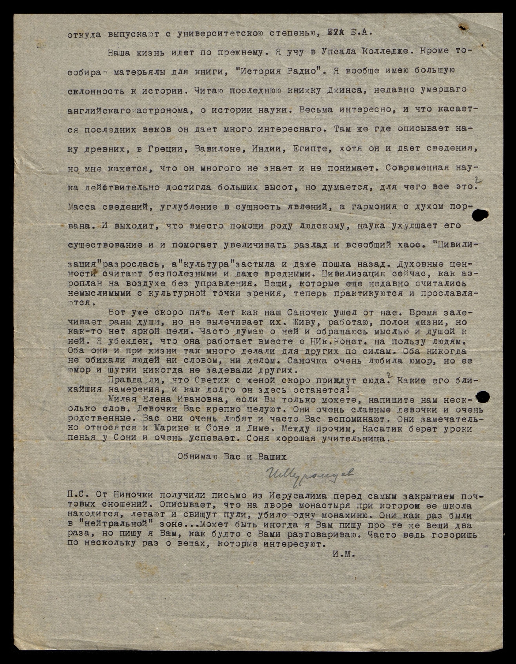 Живём мы здесь в напряжённой атмосфере, как перед грозой. Люди стараются делать вид, что всё обстоит благополучно, но у всех в душе больной вопрос, что будет? Положение в Европе ясно показывает, что одна из сторон ищет войны. У многих мысль на уме, что, быть может, это будет последняя война перед гибелью цивилизации. Ведь были же в прошлом цивилизации, от которых даже воспоминание изгладилось на многие столетия и даже тысячелетия. В книге Тойнби, модного английского историка, он перечисляет 21 цивилизацию, исчезнувших и только недавно обнаруженных раскопками. А если теперешняя цивилизация исчезнет, может быть, и откапывать нечего будет. Но будь что будет, отдельные люди сейчас помочь не в силах; а всё-таки жаль, что люди сговориться не могут. Лично я стараюсь не думать о том, чему помочь не могу и сколько можно, погружаюсь в свою работу. Мне нравится учить молодёжь и нравится моя историческая работа, хотя я и не знаю, будет ли она кому-нибудь нужна, да и увидит ли она когда-нибудь свет. Я очень люблю рыться с библиотечных книгах, некоторые из них давно забытые и никем не читаемые. Находишь иногда, что разные важные научные мысли приписываются не их настоящим авторам, а других незаслуженно забывают. Моя история, если ей суждено когда-нибудь появиться, не будет историей строго технической, с подробным описанием разных аппаратов, а [будет] историей мысли в избранной области: как наука и техника пришла к современным полезным достижениям. Например, в отношении радиоволн существует определённое понятие, что