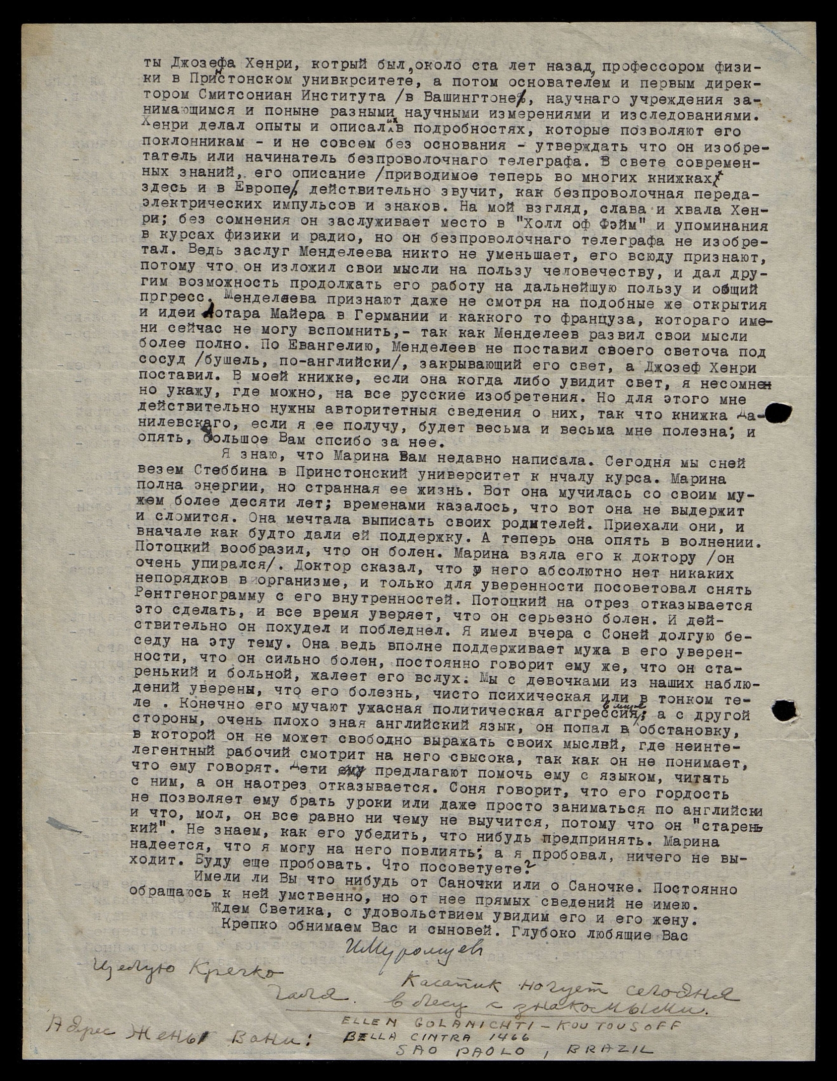 Большое Вам спасибо за книгу Данилевского, которую Вы мне рекомендовали и хотите подарить. Я думаю, что она для меня будет весьма ценная. Я ведь уже читал раз лекцию о русской науке в одном техническом обществе. К сожалению, Сов. Пр[авительство] делает из этого политический вопрос, и наряду с весьма интересными сведениями, в газетах появляются чрезмерные требования. Ведь "айрон кэртон" трудного языка существовала всегда; [д]а к тому же многие работы даже не публиковались в своё время, а много позже. Таким образом, они, хотя несомненно, являются знаками русского гениями, но не могли повлиять на общий ход развития наук в других странах. Мало оправданные требования подрывают доверие к другим сведениям. Ведь такие же случаи встречаются и в иностранной науке и технике. Так, например, не так давно были разобраны докумен-