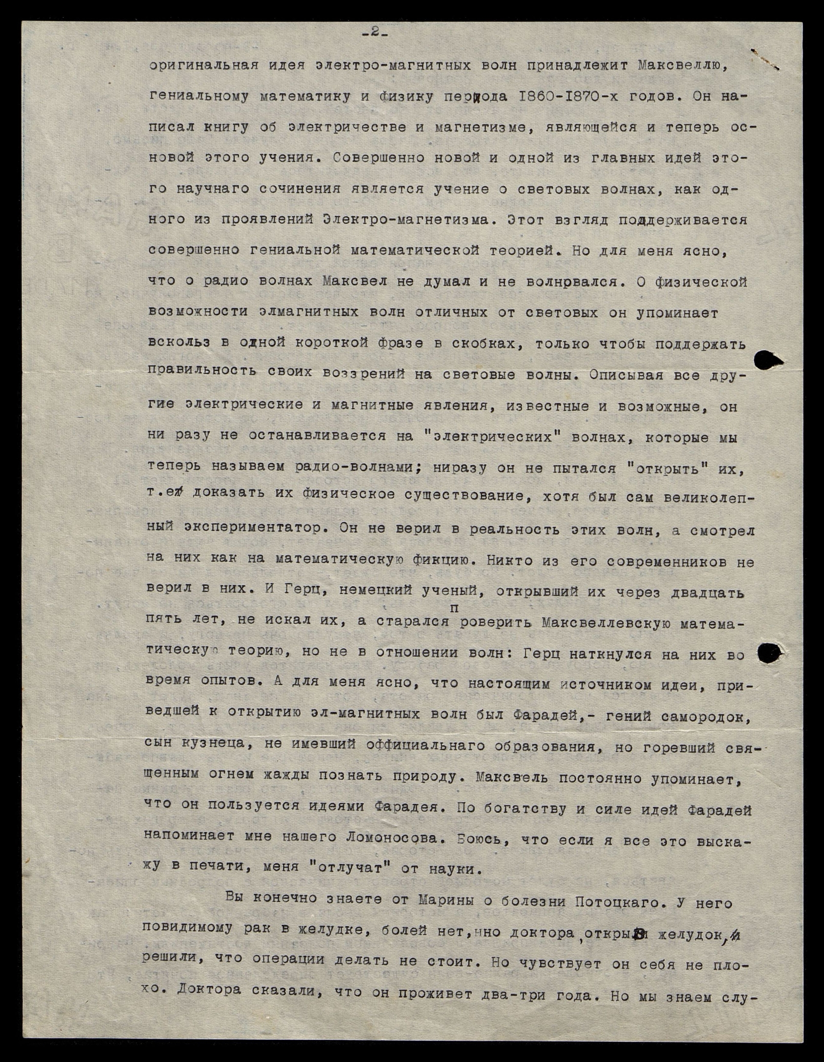 оригинальная идея электромагнитных волн принадлежит Максвеллю, гениальному математику и физику, периода 1860−1870-х годов. Он написал книгу об электричестве и магнетизме, являющуюся и теперь основой этого учения. Совершенно новой и одной из главных идей этого научного сочинения является учение о световых волнах как одном из проявлений электромагнетизма. Этот взгляд поддерживается совершенно гениальной математической теорией. Но для меня ясно, что о радиоволнах Максвелл не думал и не волновался. О физической возможности эл[ектро]магнитных волн, отличных от световых, он упоминает вскользь в одной короткой фразе в скобках, только чтобы поддержать правильность своих воззрений на световые волны. Описывая все другие электрические и магнитные явления, известные и возможные, он ни разу не останавливается на "электрических" волнах, которые мы теперь называем радиоволнами; ни разу он не пытался "открыть" их, т[о] е[сть] доказать их физическое существование, хотя был сам великолепный экспериментатор. Он не верил в реальность этих волн, а смотрел на них как на математическую фикцию. Никто из его современников не верил в них. И Герц − немецкий учёный, открывший их через двадцать пять лет − не искал их, а старался проверить Максвеллевскую математическую теорию, но не в отношении волн: Герц наткнулся на них во время опытов. А для меня ясно, что настоящим источником идеи, приведшей к открытию эл[ектро]магнитных волн, был Фарадей − гений, самородок, сын кузнеца, не имевший официального образования, но горевший священным огнём жажды познать природу. Максвелл постоянно упоминает, что он пользуется идеями Фарадея. По богатству и силе идей Фарадей напоминает мне нашего Ломоносова. Боюсь, что если я всё это выскажу в печати, меня "отлучат" от науки.