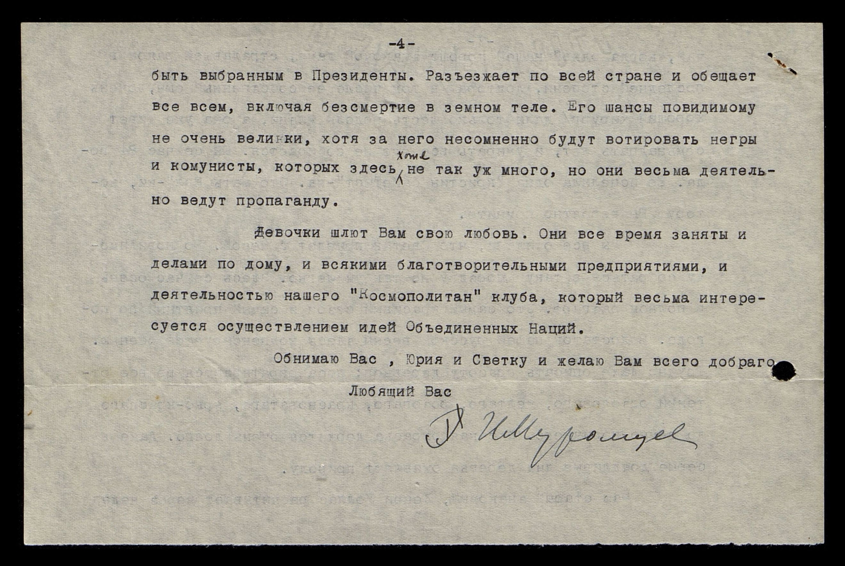 Девочки шлют Вам свою любовь. Они всё время заняты делами по дому и всякими благотворительными предприятиями, и деятельностью нашего "Космополитан" клуба, который весьма интересуется осуществлением идей Объединённых Наций.