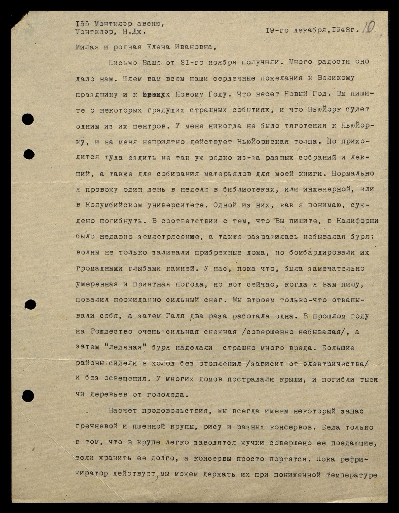Письмо Ваше от 21-го ноября получили. Много радости оно дало нам. Шлём вам всем наши сердечные пожелания к Великому празднику и к Новому году. Что несёт Новый год? Вы пишите о некоторых грядущих страшных событиях и что Нью-Йорк будет одним из их центров. У меня никогда не было тяготения к Нью-Йорку, и на меня неприятно действует Нью-Йоркская толпа. Но приходится туда ездить не так уж редко из-за разных собраний и лекций, а также для собирания материалов для моей книги. Нормально я провожу один день в неделю в библиотеках: или инженерной, или в Колумбийском университете. Одной из них, как я понимаю, суждено погибнуть. В соответствии с тем, что Вы пишете, в Калифорнии было недавно землетрясение, а также разразилась небывалая буря: волны не только заливали прибрежные дома, но бомбардировали их громадными глыбами камней. У нас, пока что, была замечательно-умеренная и приятная погода, но вот сейчас, когда я вам пишу, повалил неожиданно сильный снег. Мы втроём только что откапывали себя, а затем Галя два раза работала одна. В прошлом году на Рождество очень сильная снежная (совершенно небывалая), а затем "ледяная" буря наделала страшно много вреда. Большие районы сидели в холод без отопления (зависит от электричества) и без освещения. У многих домов пострадали крыши, и погибли тысячи деревьев от гололёда.