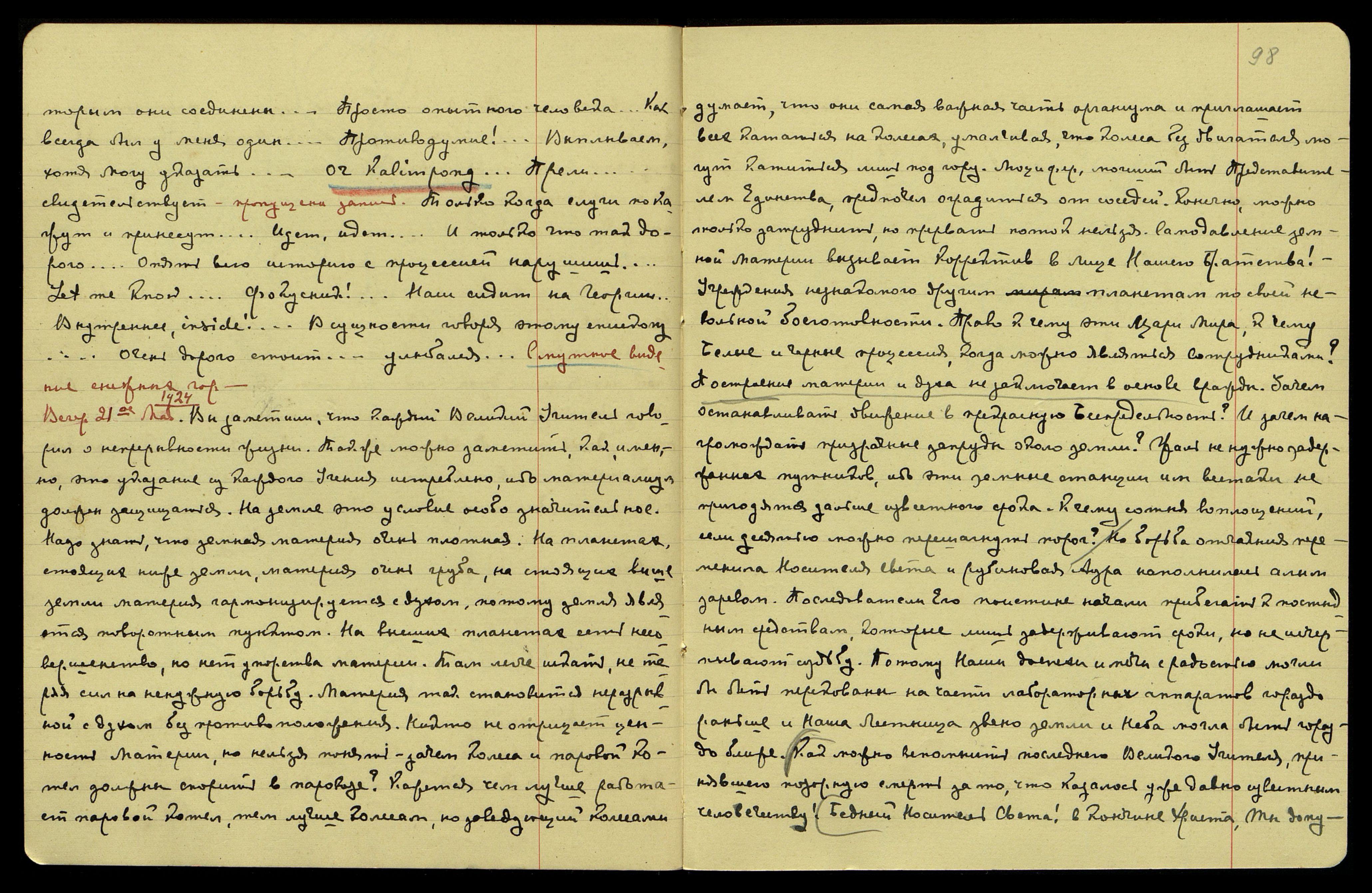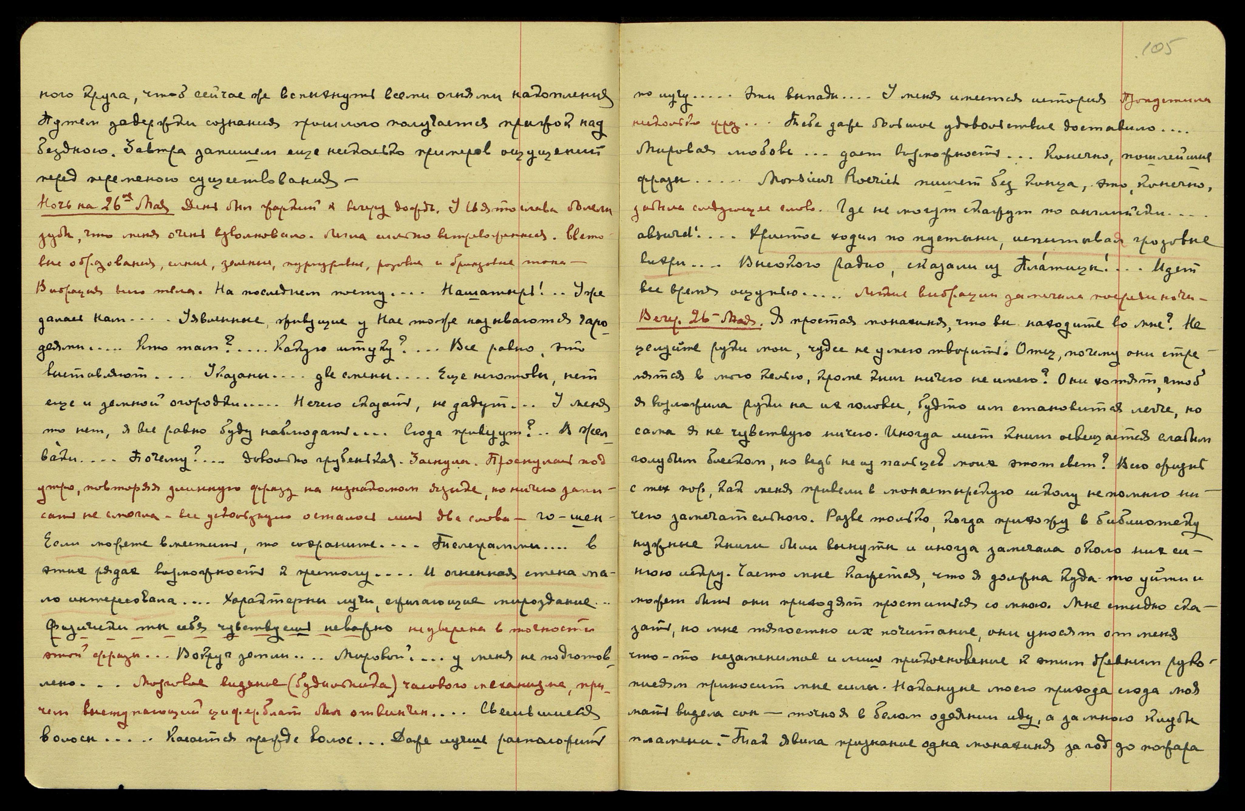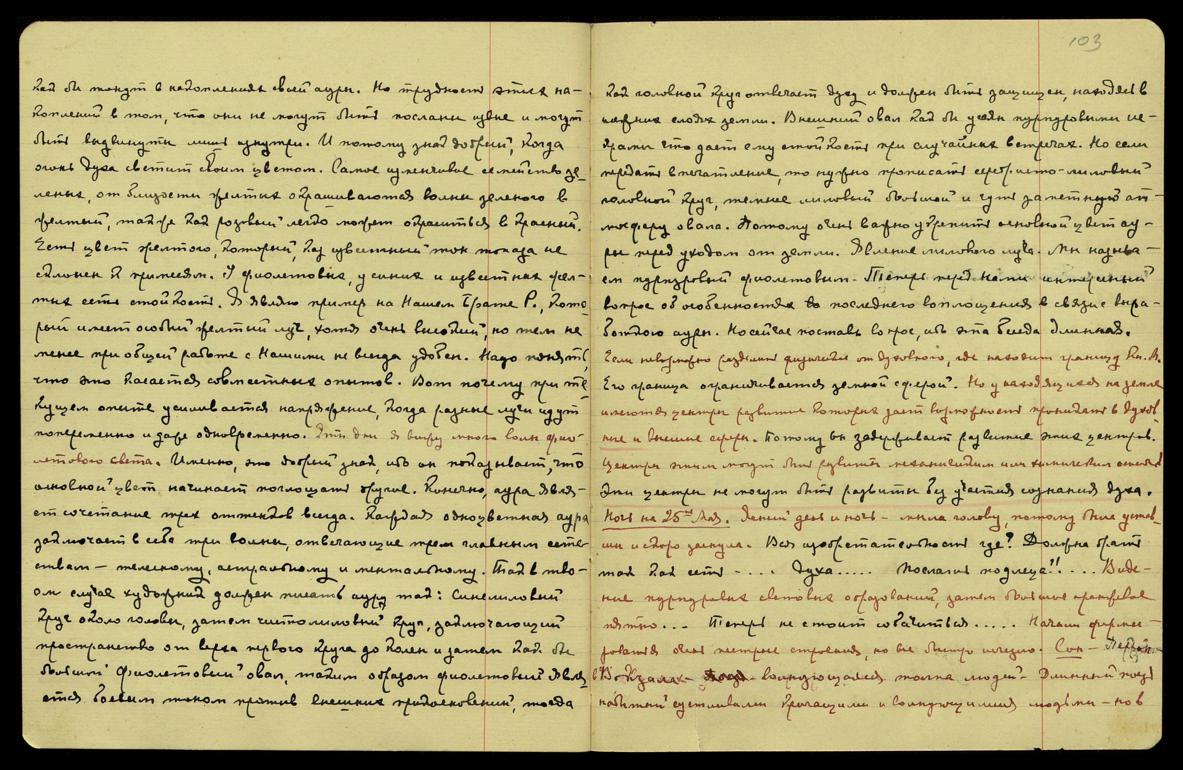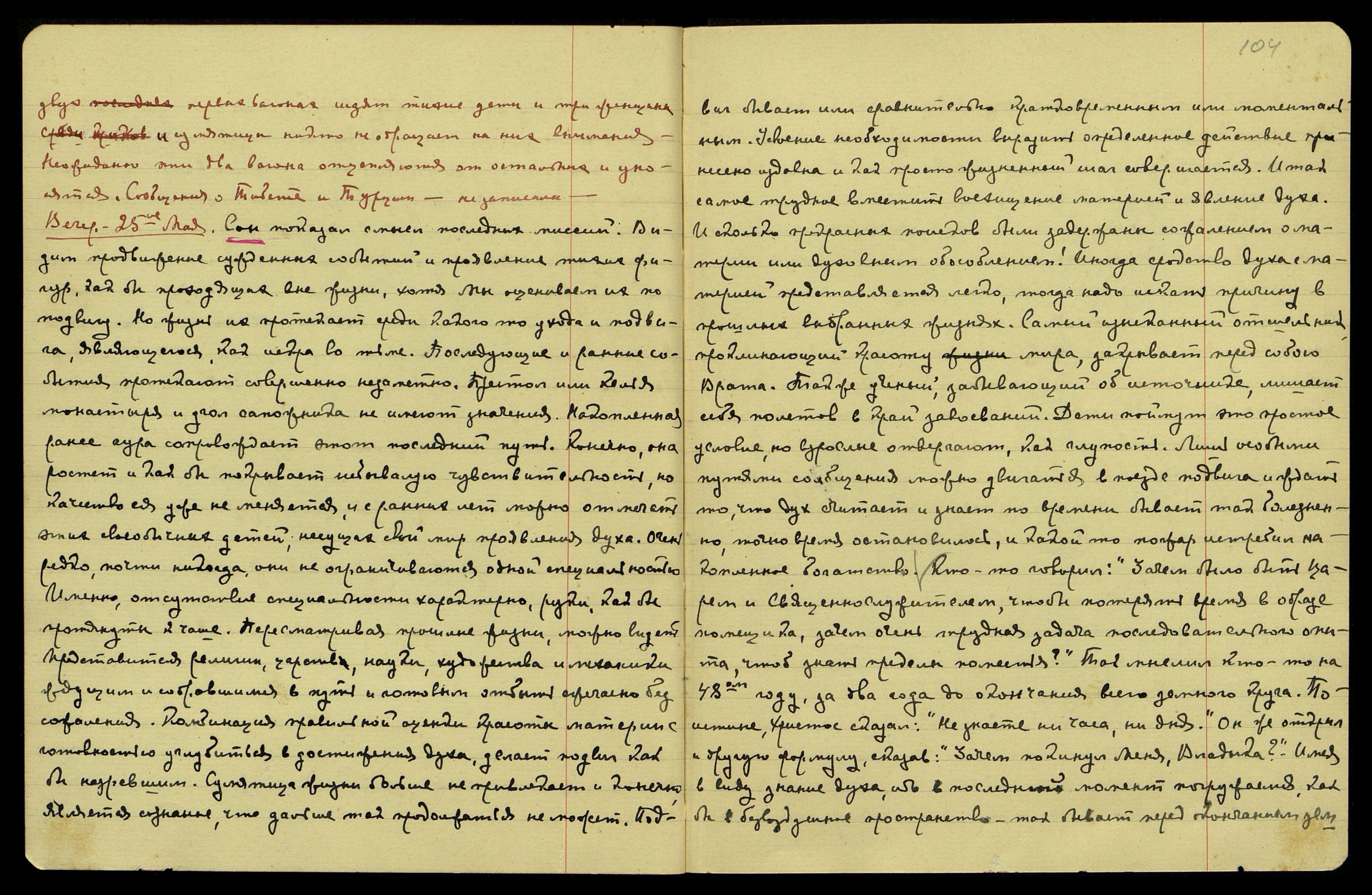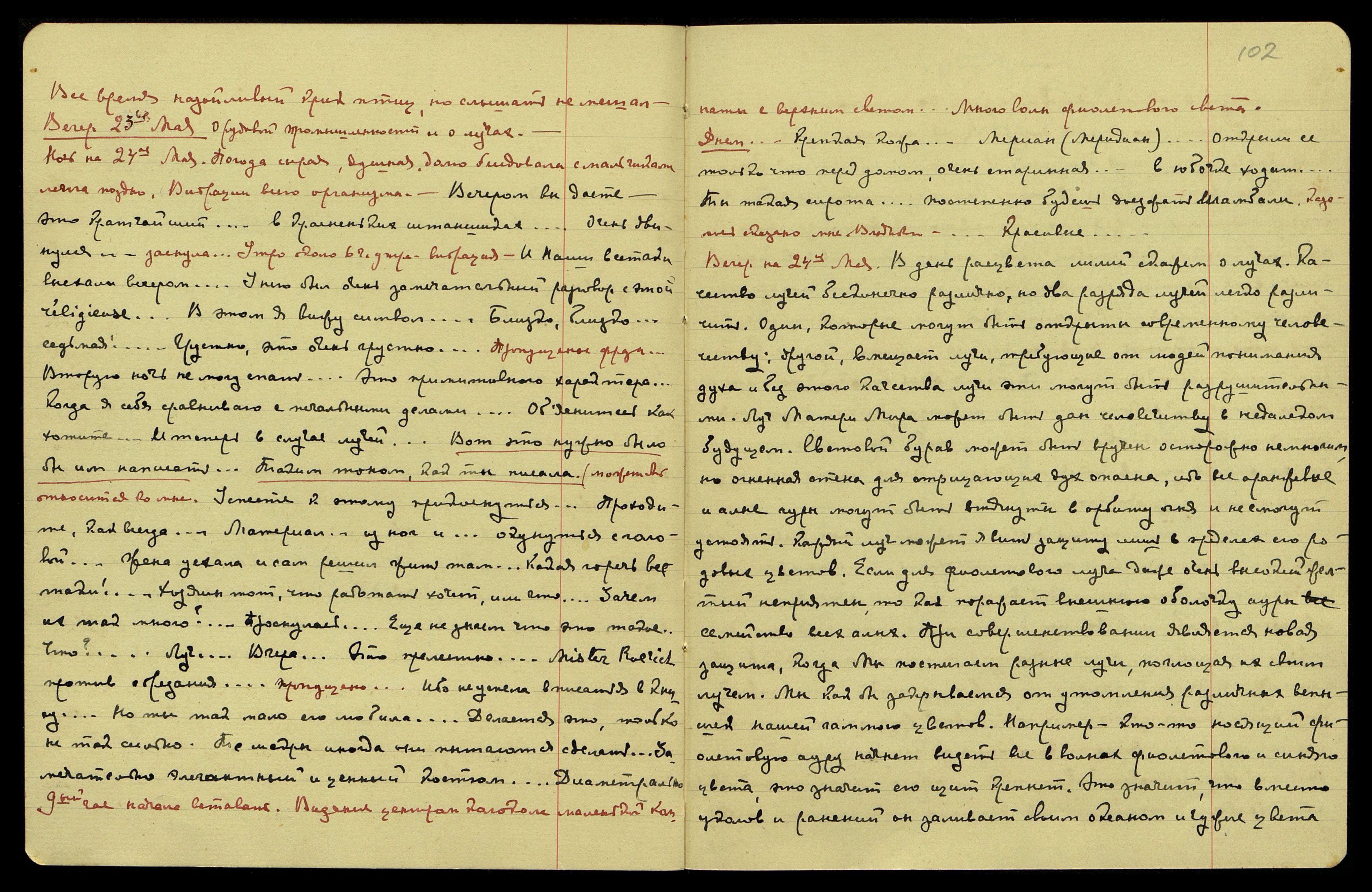 Ночь на 24-ое мая. Погода сырая, душная, долго беседовала с мальчиками, легла поздно. Вибрации всего организма. "Вечером вы даёте − это кратчайший... в красненьких штанишках... очень двинулся..." Заснула. Утро, около 6 ч[асов] утра − вибрация. "И наши всё-таки выехали вечером... У него был очень замечательный разговор с этой religieuse [англ.: монахиней]... В этом я вижу символ... Близко, близко... седьмая!.. Грустно, это очень грустно..." Пропущены фразы. "Вторую ночь не могу спать... Это примитивного характера... Когда я себя сравниваю с печальными делами... Объяснитесь, как хотите... И теперь в случае лучей... Вот это нужно было бы им написать... Таким тоном, как ты писала", − может быть, относится ко мне. "Успеете к этому прикоснуться... Проходите, как всегда... Материал... из ног и... окунуться с головой... Жена уехала и сам решил жить там... Какая горечь всё-таки!.. Хозяин тот, что работать хочет, или что... Зачем их так много?.. Проснулась... Ещё не знаем, что это такое... Что?.. Луч... Вчера... Это прелестно... Mister Roerich против обрезания..." − пропущено, − "ибо не успела вписаться в книгу... Но ты так мало его любила... Делается это, только не так сильно. Те [одно слово неразборчиво] иногда они пытаются сделать... Замечательно элегантный и ценный костюм... Диаметрально". 9-ый час, начала вставать. Видение центром колокола маленькой комнаты с верхним светом. Много волн фиолетового света.