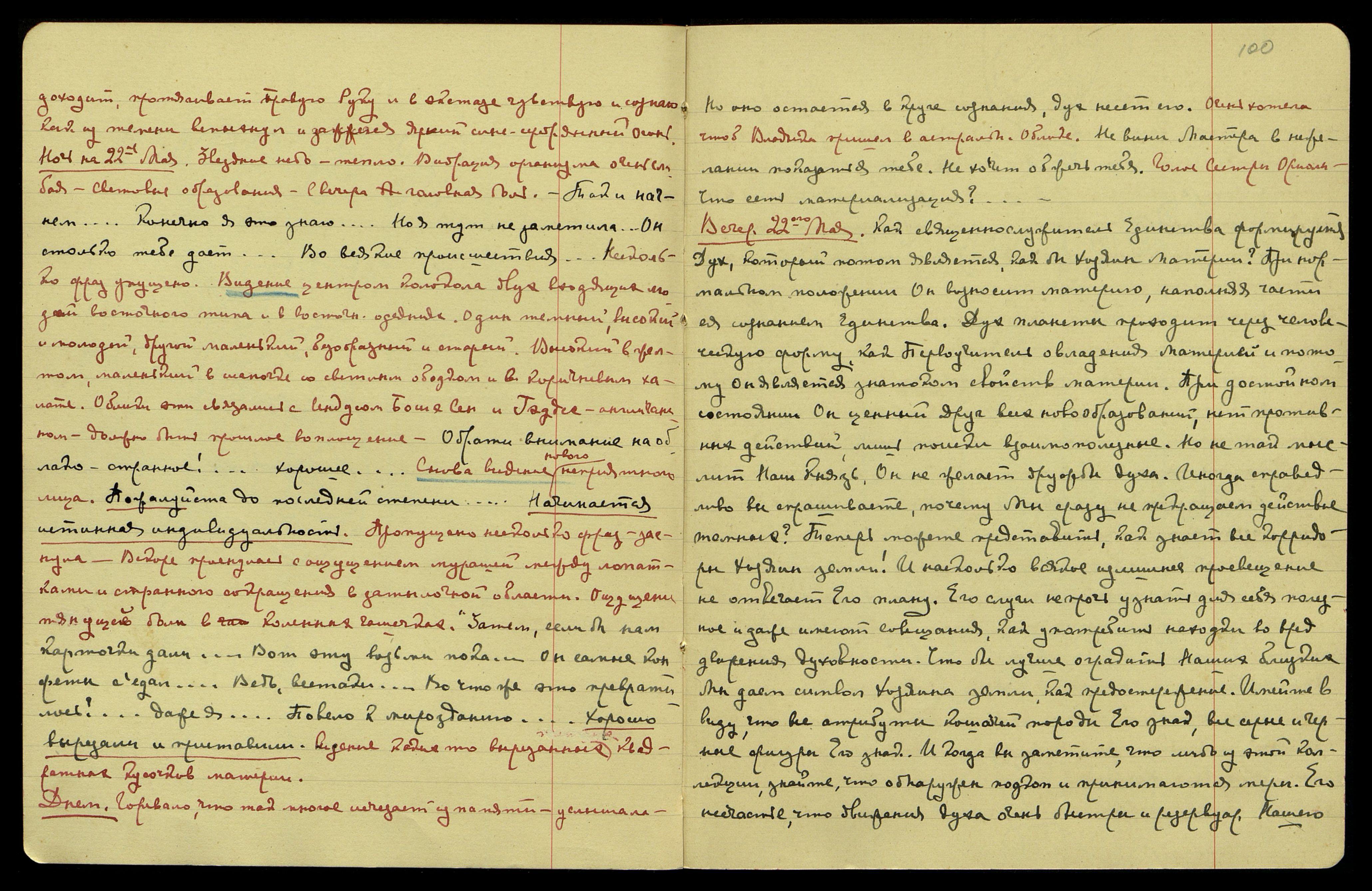 Ночь на 22-ое мая. Звёздное небо, тепло. Вибрация организма очень слабая, световые образования, с вечера − головная боль. "Так и начнём... Конечно, я это знаю... Но я тут не заметила... Он столько тебе даёт... Во всякие происшествия..." Несколько фраз упущено. Видение центром колокола двух входящих людей восточного типа и в восточн[ых] одеяниях. Один − тёмный, высокий и молодой, другой − маленький, безобразный и старый. Высокий − в жёлтом, маленький − в шапочке со светлым ободком и в коричневом халате. Облики эти связались с Бошэ Сен и [одно слово неразборчиво] − англичанином, должно быть, прошлое воплощение. "Обрати внимание на облако − странное!.. хорошее..."Снова видение нового неприятного лица. "Пожалуйста, до последней степени... Начинается истинная индивидуальность". Пропущено несколько фраз − заснула. Вскоре проснулась с ощущением мурашей между лопатками и странного сокращения в затылочной области. Ощущение тянущей боли в коленных чашечках. "Затем, если бы нам карточки дали... Вот эту возьми пока... Он самые конфеты съедал... Ведь, всё-таки... Во что же это превратилось?.. даже я... Повело к мирозданию... Хорошо вырезали и приставили". Видение каких-то вырезанных квадратных кусочков материи.