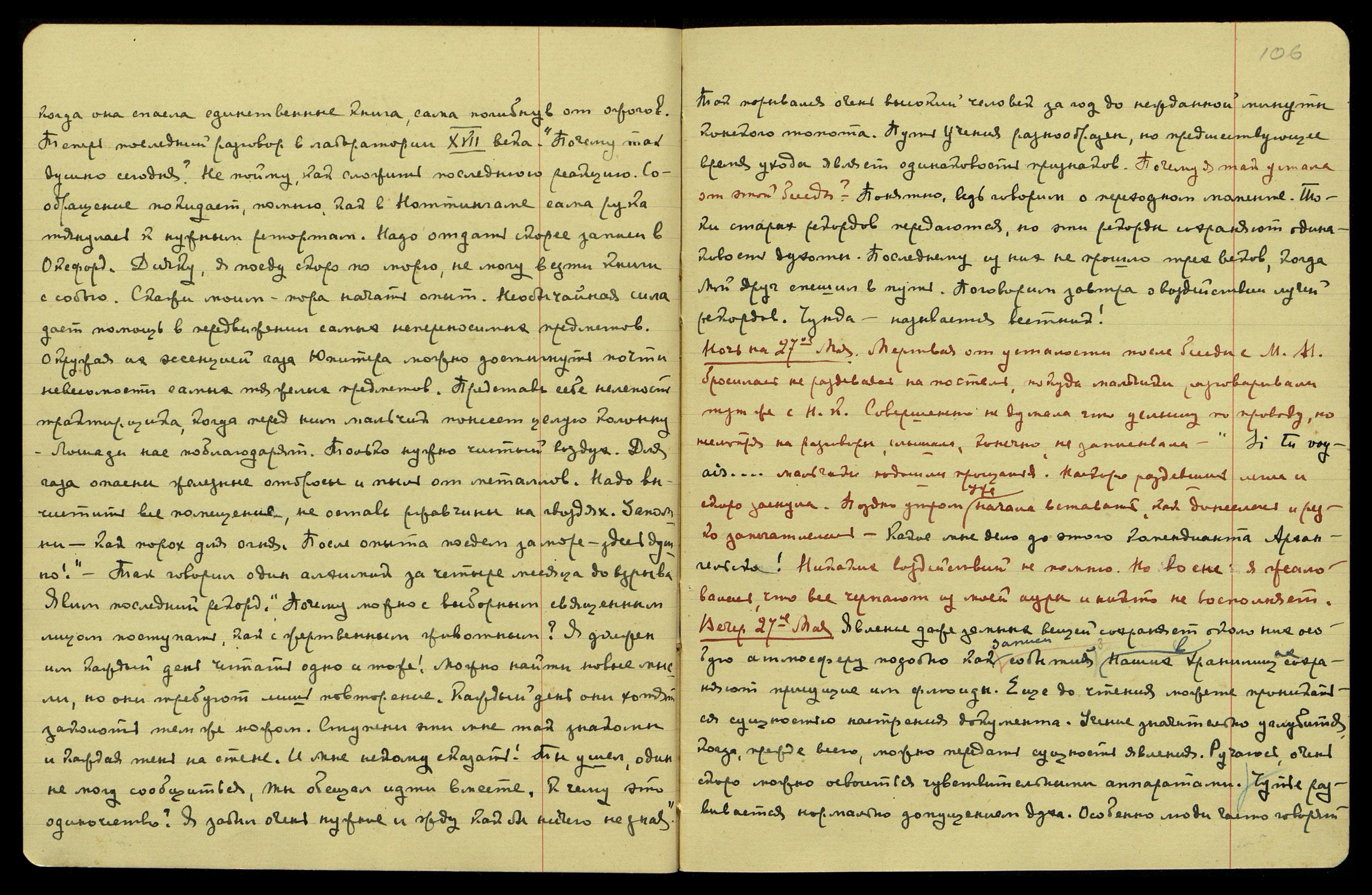 Ночь на 27-ое мая. Мёртвая от усталости после беседы с М[ахатмой] М[орией]. Бросилась, не раздеваясь на постель, покуда мальчики разговаривали тут же с Н[иколаем] К[онстантиновичем]. Совершенно не думала, что услышу по проводу, но несмотря на разговоры, слышала, конечно, но не записывала: "Si Tu voyais [франц.: Если бы вы увидели]..." Мальчики подошли прощаться. Наскоро раздевшись легла и скоро заснула. Поздно утром уже начала вставать, как донеслось и резко запечатлелось: "Какое мне дело до этого комедианта Архангельского!" Никаких воздействий не помню. Но во сне я жаловалась, что все черпают из моей ауры и никто не восполняет.