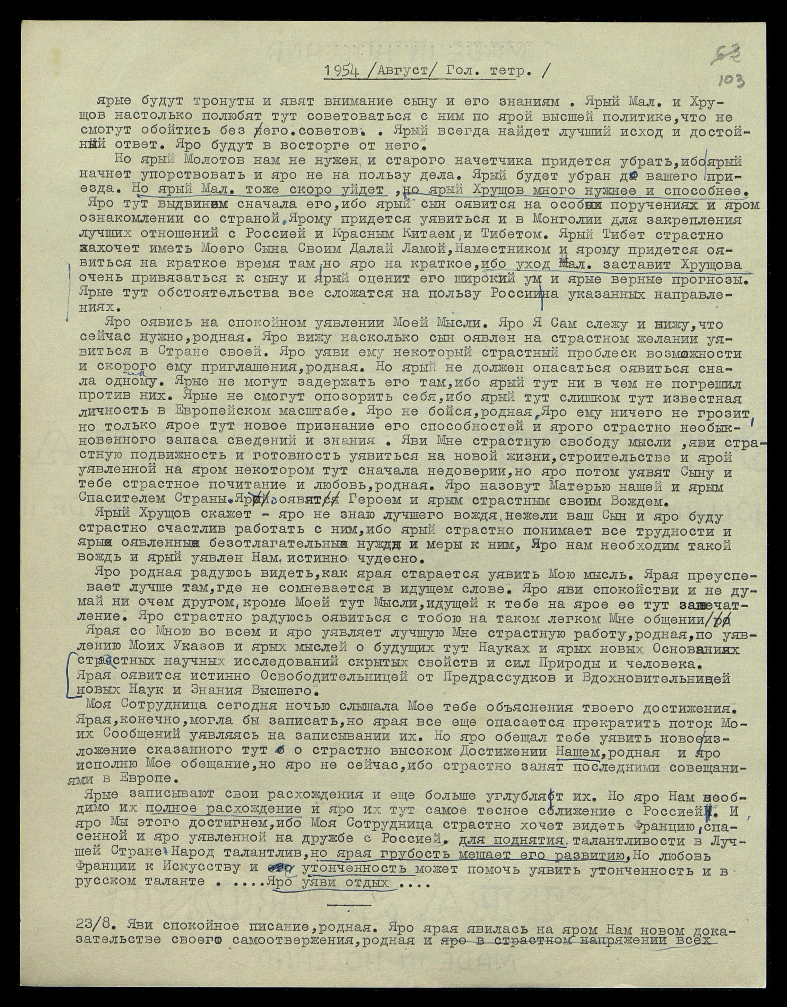 Яро тут выдвинем сначала его, ибо ярый сын оявится на особых поручениях и яром ознакомлении со страной. Ярому придется уявиться и в Монголии для закрепления лучших отношений с Россией и Красным Китаем, и Тибетом. Ярый Тибет страстно захочет иметь Моего Сына Своим Далай Ламой, Наместником, и ярому придется оявиться на краткое время там, но яро на краткое, ибо уход Мал[енкова] заставит Хрущева очень привязаться к сыну и ярый оценит его широкий ум и ярые верные прогнозы. Ярые тут обстоятельства все сложатся на пользу России на указанных направлениях.