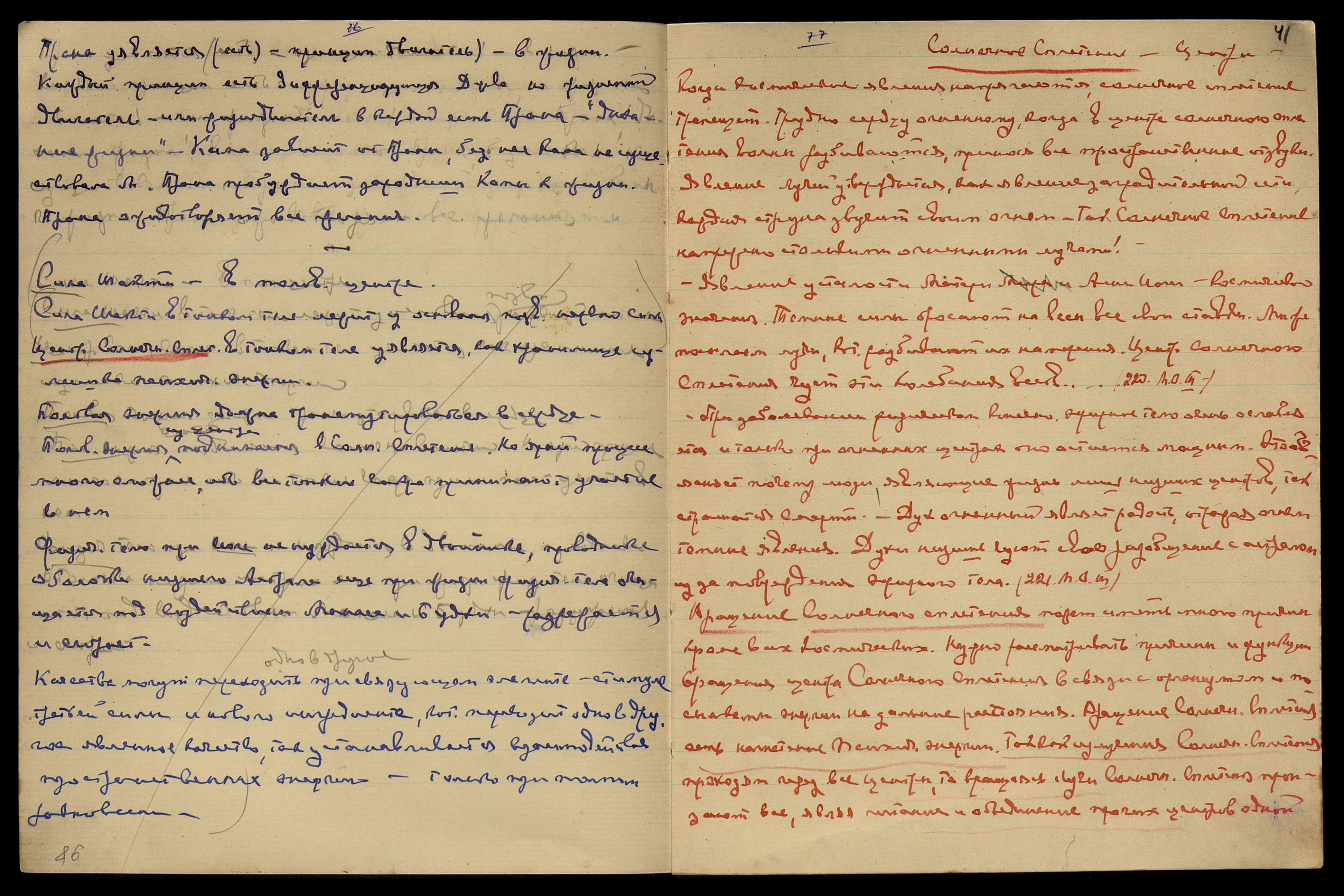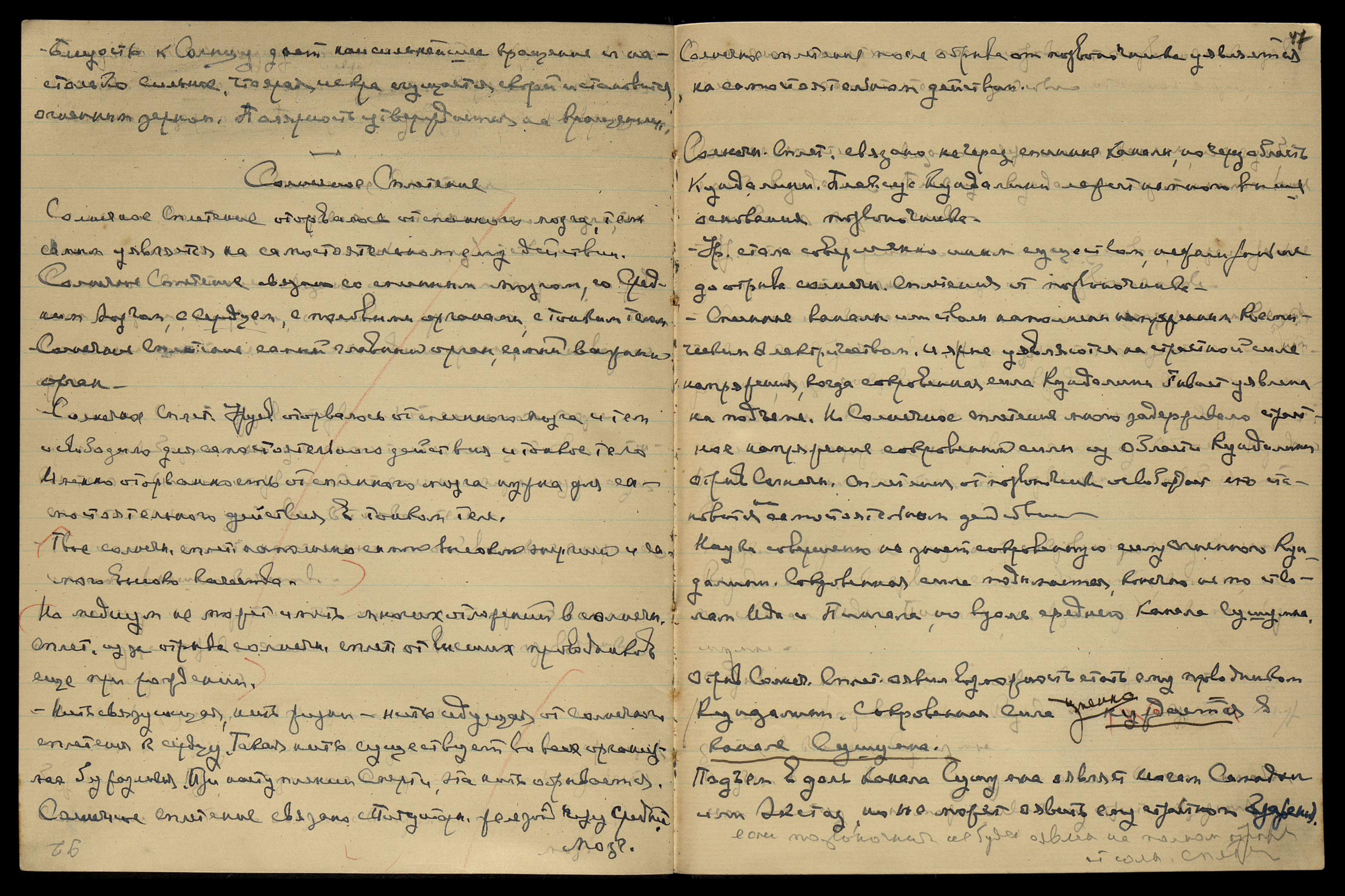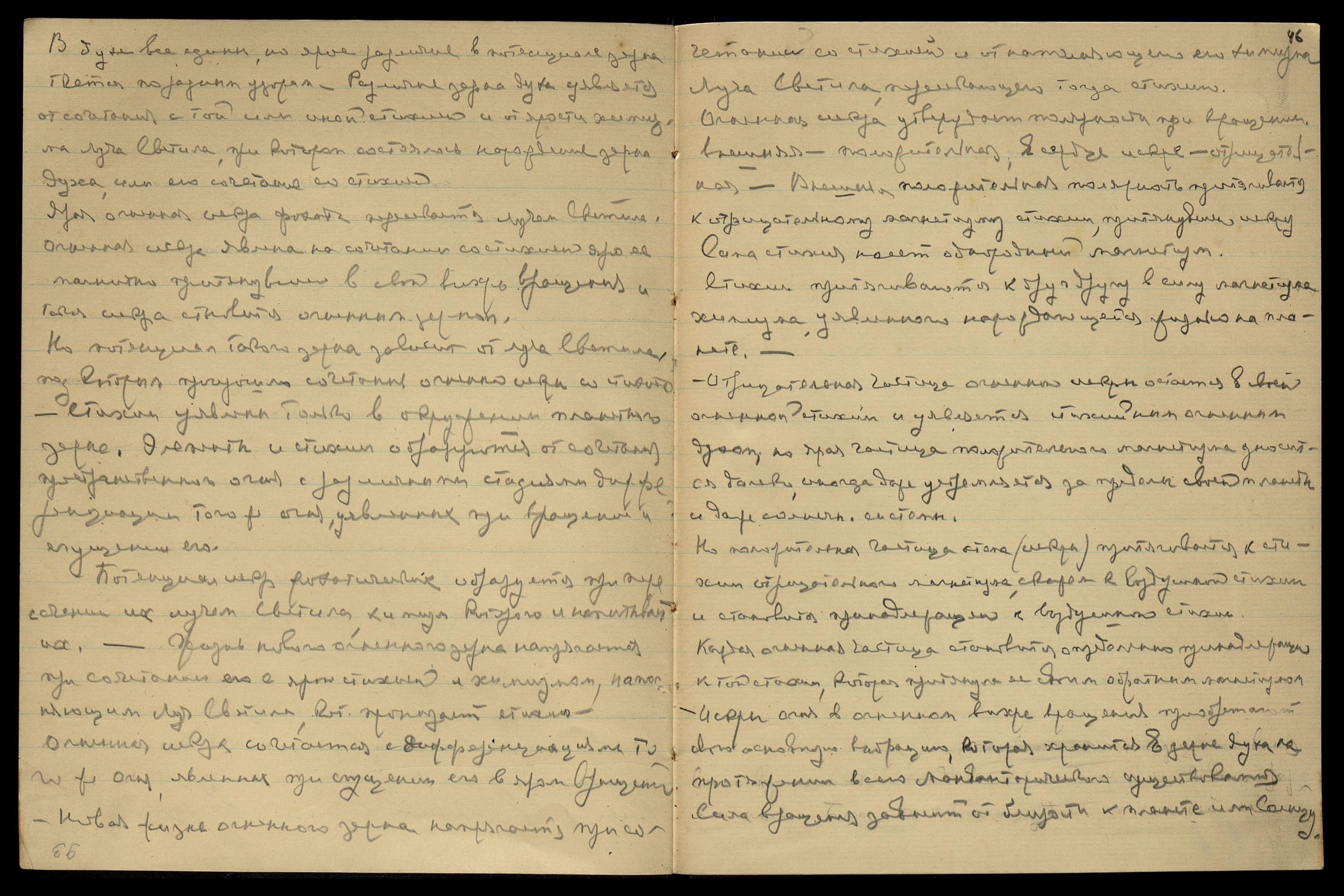 Последний отрыв последней нити Солнеч[ного] Сплет[ения] от спинных нервов уявился страстно болезненным в силу страстного напряженного состояния в голове. Мозг оявился как огненный костер из-за напряжения чакр. Чакры Брахмарандра и другой страстно незаметной гланды. Она уявлена как центр Бессмертия. Она сотрудничает с мощным центром Брахмасахашрара. Брахмарандра оявлен