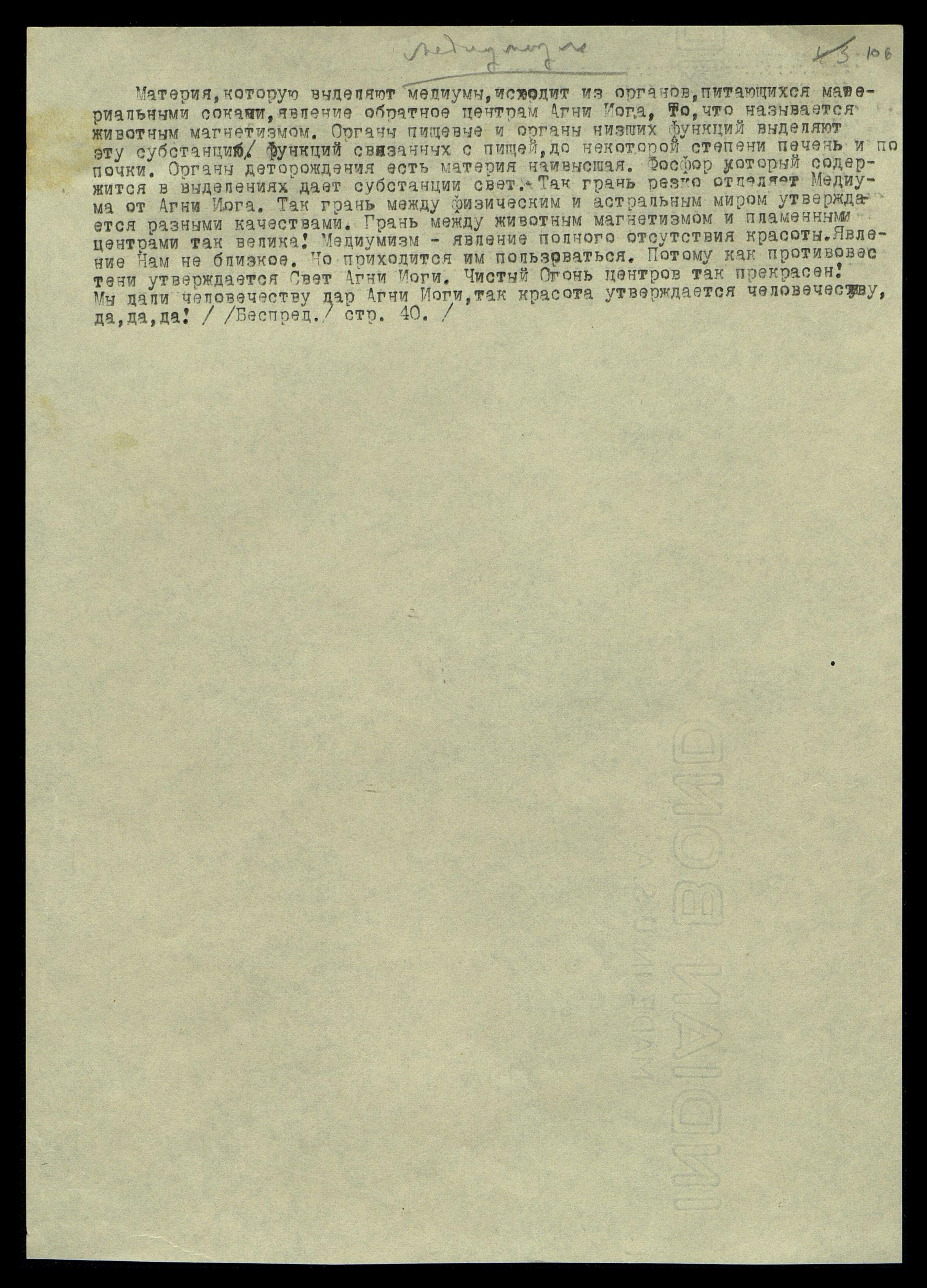 Материя, которую выделяют медиумы, исходит из органов, питающихся материальными соками, явление обратное центрам Агни Йога, то, что называется животным магнетизмом. Органы пищевые и органы низших функций выделяют эту субстанцию, функций, связанных с пищей, до некоторой степени печень и почки. Органы деторождения есть материя наивысшая. Фосфор, который содержится в выделениях, даёт субстанции свет. Так грань резко отделяет Медиума от Агни Йога. Так грань между физическим и астральным миром утверждается разными качествами. Грань между животным магнетизмом и пламенными центрами так велика! Медиумизм — явление полного отсутствия красоты. Явление Нам не близкое. Но приходится им пользоваться. Потому, как противовес тени, утверждается Свет Агни Йоги. Чистый Огонь центров так прекрасен! Мы дали человечеству дар Агни Йоги, так красота утверждается человечеству — да, да, да! (Беспредельность, стр. 40).
