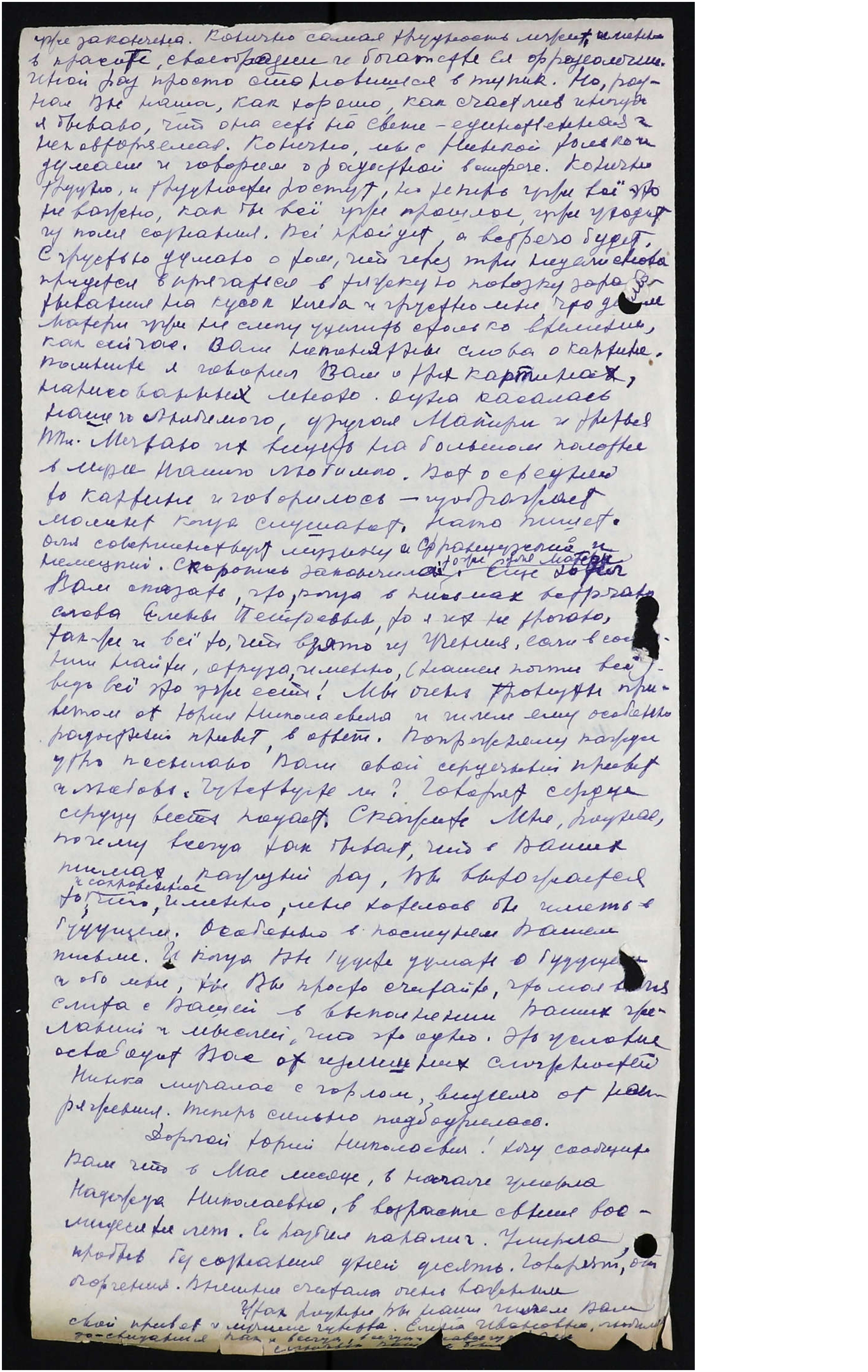 Дорогой Юрий Николаевич! Хочу сообщить Вам, что в мае месяце в начале умерла Надежда Николаевна в возрасте свыше восьмидесяти лет. Её разбил паралич. Умерла, пробыв без сознания дней десять. Говорят от огорчения. Внешнее считала очень важным.