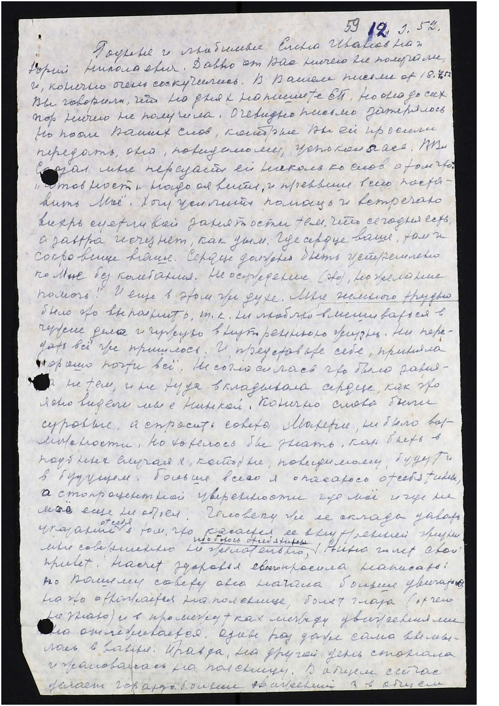 Родные и любимые Елена Ивановна и Юрий Николаевич. Давно от Вас ничего не получали, и, конечно, очень соскучились. В вашем письме от 18.7.1952 Вы говорили, что на днях напишете Екатерина Петровна [Инге]. Но она до сих пор ничего не получила. Очевидно письмо затерялось. Но после Ваших слов, которые Вы ей просили передать, она, по-видимому, успокоилась. В[еликий] Вл[адыка] Сказал мне передать ей несколько слов о том что: "Готовность надо оявить, и превыше всего поставить Моё. Хочу усилить помощь и встречаю вихрь суетливой занятости тем, что сегодня есть, а завтра исчезнет, как дым. Где сердце ваше, там и сокровище ваше. Сердце должно быть устремлено ко Мне без колебания. Не осуждение (это), но желание помочь". И ещё в этом же духе. Мне немного трудно было это выполнить, т.к. не люблю вмешиваться в чужие дела и чужую внутреннюю жизнь. Но передать всё же пришлось. И, представьте себе, приняла хорошо почти всё. Не согласилась, что была занята не тем, и не туда вкладывала сердце, как это ясно видели мы с Нинкой. Конечно, слова были суровые, а спросить совета Матери не было возможности. Но хотелось бы знать, как быть в подобных случаях, которые, по-видимому, будут и в будущем. Больше всего я опасаюсь отсебятины, а стопроцентной уверенности, где моё и где не моё, еще не обрел. Человеку же её склада давать указания от себя в том, что касается её внутренней жизни, мне совершенно нежелательно, ибо боюсь отсебятины. Нина шлет свой привет. Насчет здоровья своего просила написать: по Вашему совету она начала больше двигаться, но это отражается на пояснице, болят глаза (от чего не знаю) и в промежутках между движениями она отлеживается. Один раз даже сама вымылась в ванне. Правда, на другой день стонала и жаловалась на поясницу. В общем сейчас делает гораздо больше движений и в общем