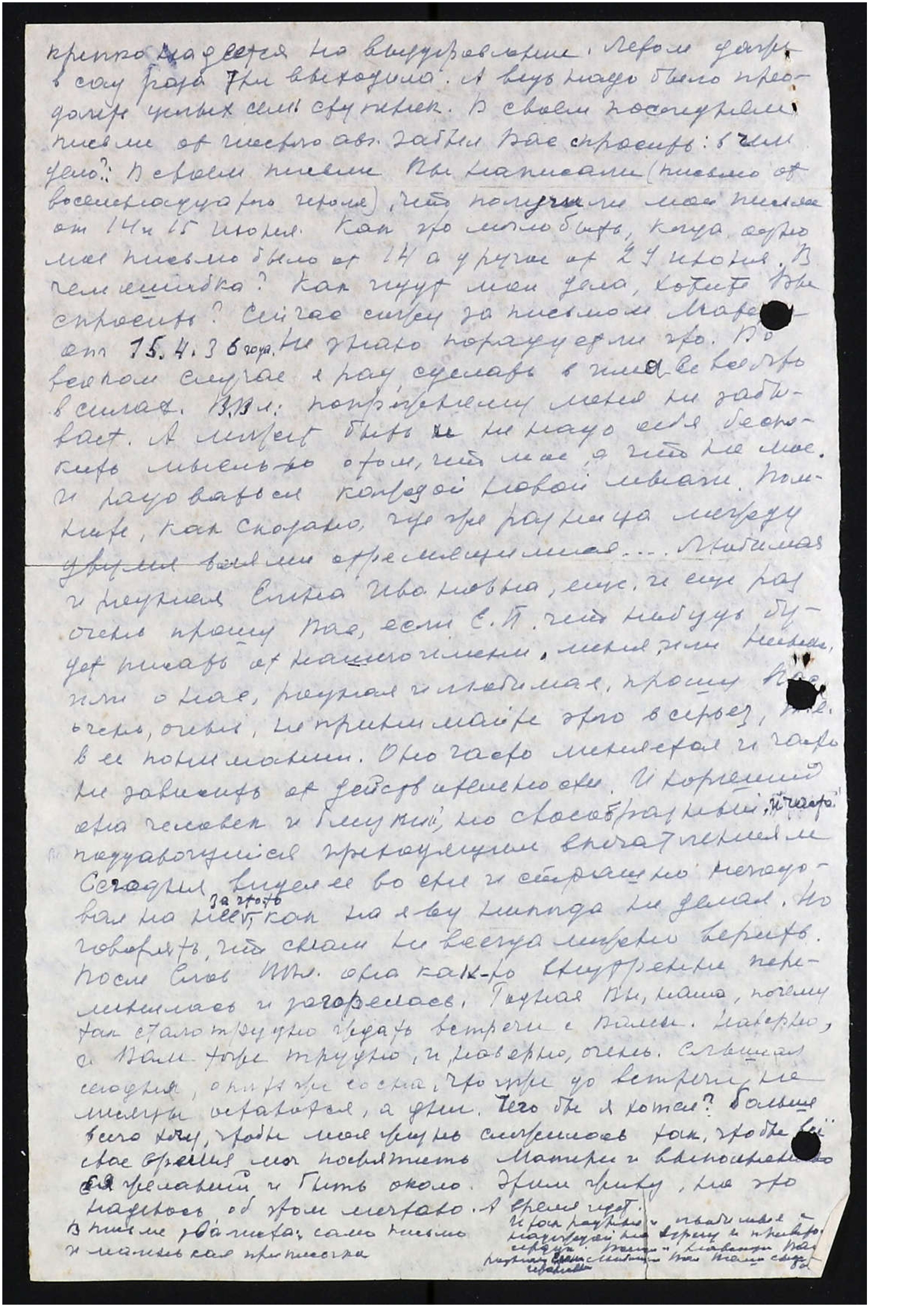 крепко надеется на выздоровление. Летом даже в сад раза три выходила. А ведь надо было преодолеть целых семь ступенек. В своем последнем письме от шестого авг[уста] забыл Вас спросить: в чем дело? В своем письме Вы написали (письмо от восемнадцатого июля), что получили мои письма от 14 и 15 июня. Как это могло быть, когда одно моё письмо было от 14, а другое от 29 июня. В чем ошибка? Как идут мои дела, хотите Вы спросить? Сейчас сижу за письмом Матери от 15.4.36 года. Не знаю, порадует ли это. Во всяком случае я рад, сделать во имя её всё, что в силах. В[еликий] Вл[адыка] по-прежнему меня не забывает. А может быть и не надо себя беспокоить мыслью о том, что моё, а что не мое. И радоваться каждой новой мысли. Помните, как Сказано, где же разница между двумя волями стремящимися... Любимая и родная Елена Ивановна, ещё и ещё раз очень прошу Вас, если Екатерина Петровна [Инге] что-нибудь будет писать от нашего имени, меня или Нинки, или о нас, родная и любимая, прошу Вас очень-очень не принимайте этого всерьез, т.е. в её понимании. Оно часто меняется и часто не зависит от действительности. И хороший она человек, и близкий, но своеобразный, и часто поддающийся преходящим впечатлениям. Сегодня видел её во сне и страшно негодовал на неё за что-то, как наяву никогда не делал. Но говорят, что снам не всегда можно верить. После слов В[еликого] Вл[адыки] она как-то внутренне переменилась и разгорелась. Родная Вы наша, почему так стало трудно ждать встречи с Вами. Наверное, и Вам тоже трудно, и, наверное, очень. Слышал сегодня опять же со сна, что уже до встречи не месяцы остаются, а дни. Чего бы я хотел? Больше всего хочу, чтобы моя жизнь сложилась так, чтобы всё свое время мог посвятить Матери и выполнению её желаний, и быть около. Этим живу, на это надеюсь, об этом мечтаю. А время идет. В письме два листа, само письмо и маленькая приписочка. Итак, родная и любимая, с надеждой на встречу и привет от сердца. Всегда и навсегда Ваш, родная Елена Ивановна, любящий Вас,