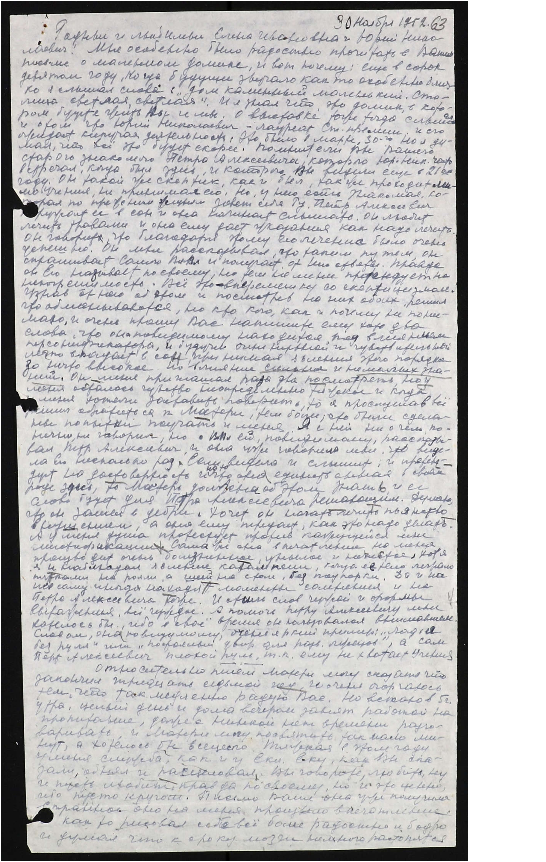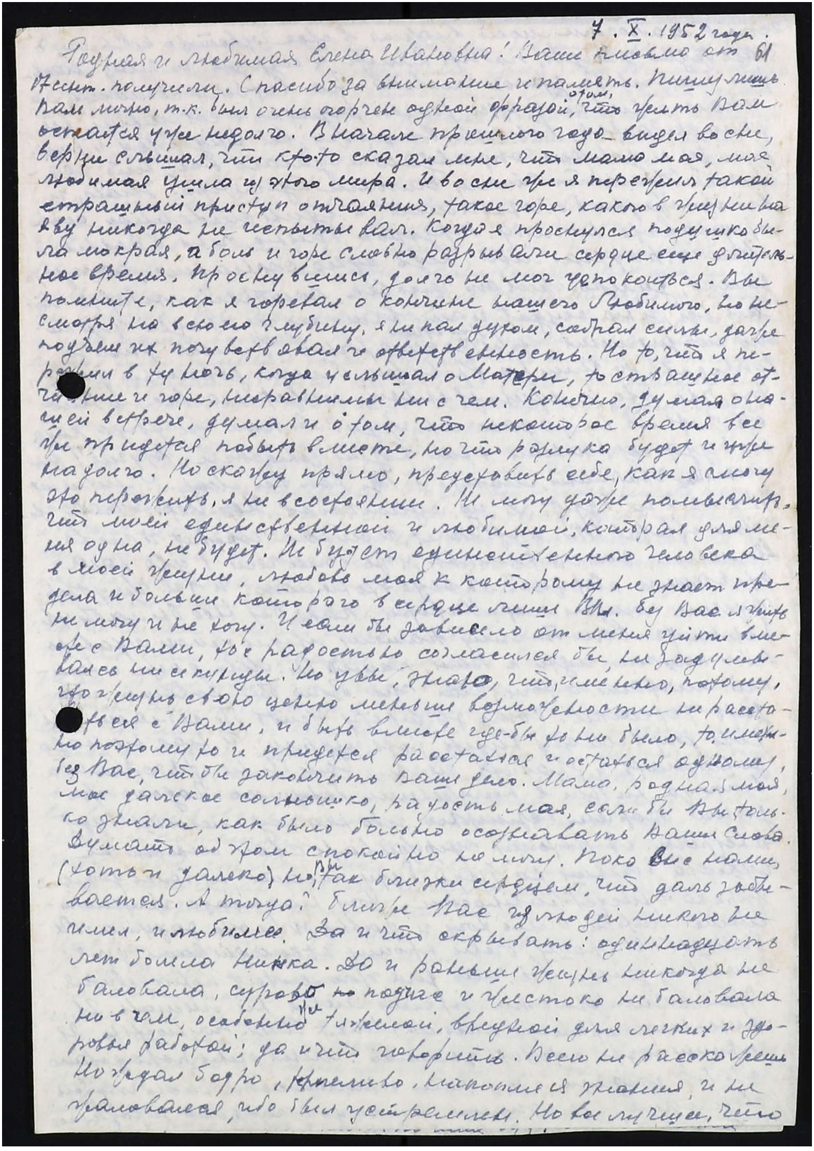 Родная и любимая Елена Ивановна! Ваше письмо от 17 сент[ября] получили. Спасибо за внимание и память. Пишу лишь Вам лично, т.к. был очень огорчен одной фразой о том, что жить Вам остается уже недолго. В начале прошлого года видел во сне, вернее слышал, что кто-то сказал мне, что мама моя, моя любимая, ушла из этого мира. И во сне же я пережил такой страшный приступ отчаяния, такое горе, какого в жизни наяву никогда не испытывал. Когда я проснулся, подушка была мокрая, а боль и горе словно разрывали сердце еще длительное время. Проснувшись, долго не мог успокоиться. Вы помните, как я горевал о кончине Нашего Любимого, но несмотря на всю его глубину, я не пал духом, собрал силы, даже подъем их почувствовал и ответственность. Но то, что я пережил в ту ночь, когда услышал о Матери, то страшное отчаяние и горе, несравнимы ни с чем. Конечно, думая о нашей встрече, думал и о том, что некоторое время все же придется побыть вместе, но что разлука будет и уже надолго. Но скажу прямо, представить себе, как я смогу это пережить, я не в состоянии. Не могу даже помыслить, что моей единственной и любимой, которая для меня одна, не будет. Не будет единственного человека в моей жизни, любовь моя к которому не знает предела, и больше которого в сердце лишь В[еликий] Вл[адыка]. Без Вас я жить не могу и не хочу. И если бы зависело от меня уйти вместе с Вами, то с радостью согласился бы, не задумываясь ни секунды. Но увы, знаю, что именно потому, что жизнь свою ценю меньше возможности не расставаться с Вами, и быть вместе где бы то ни было, то именно поэтому-то и придется расстаться, и остаться одному, без Вас, чтобы закончить Ваше дело.