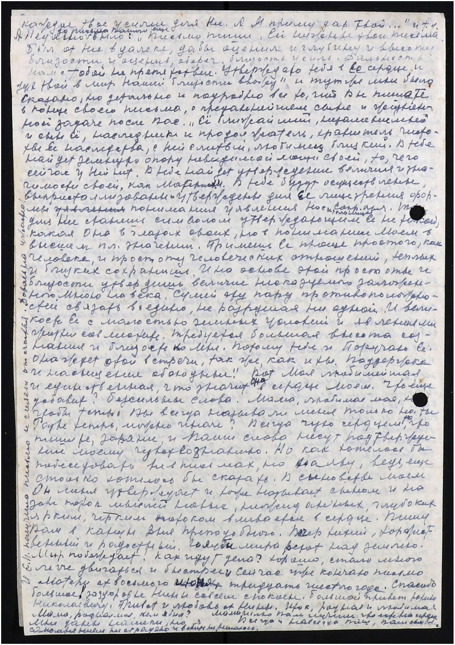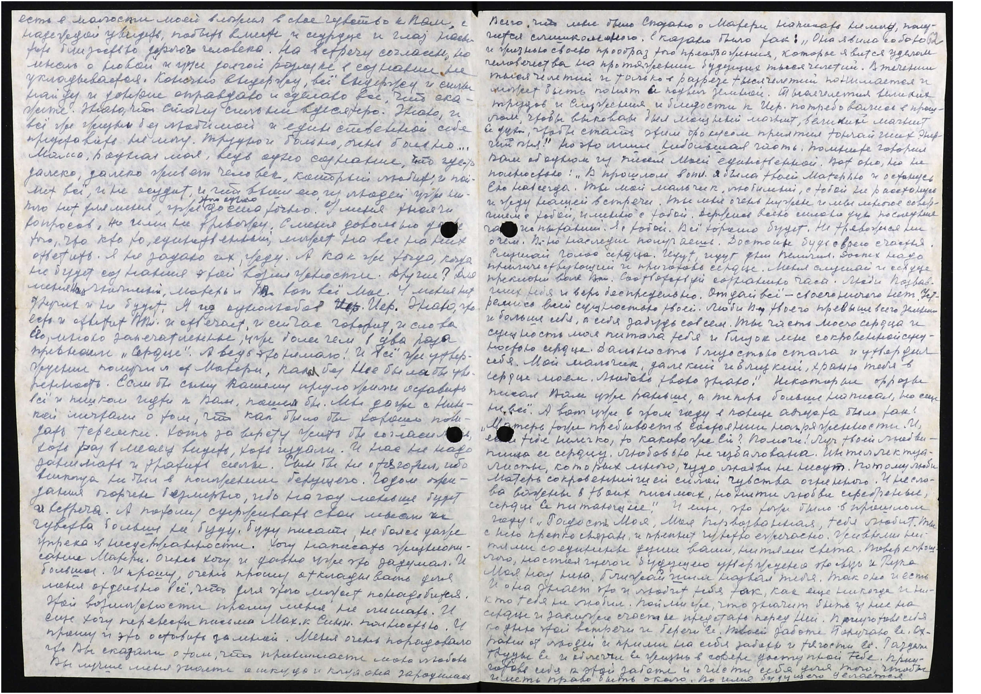 есть в малости моей, вложил в своё чувство к Вам с надеждой увидеть, побыть вместе, и сердце, и глаз насытить близостью дорогого человека. На встречу согласен, но мысль о новой и уже долгой разлуке в сознании не укладывается. Конечно, выдержу, всё выдержу и силы найду, и доверие оправдаю, и сделаю всё, что скажете. Знаю, что стану сильнее вдесятеро. Знаю, и всё же жизни без любимой и единственной себе представить не могу. Трудно и больно, очень больно... Мама, родная моя, ведь одно сознание, что где-то далеко, далеко живет человек, который любит, и поймет всё, и не осудит, и что выше его, из людей уже никого нет для меня, уже этого одного достаточно. У меня тысячи вопросов, но ими не тревожу. С меня довольно даже того, что кто-то единственный, может на все на них ответить. Я не задаю их, жду. А как же тогда, когда не будет сознания этой возможности. Другие? Для меня наш Любимый, Матерь и В[еликий] Вл[адыка] − вот всё моё. У меня нет других и не будут. Я из однолюбов Иер[архии]. Знаю, что есть и ответит В[еликий] Вл[адыка], и отвечает, и сейчас говорит, и слова Его, мною запечатленные, уже более чем в два раза превысили «Сердце». А ведь это не мало! И всё же утверждение получил от Матери, какая без Неё была бы уверенность. Если бы сыну Вашему предложили оставить всё и пешком идти к Вам, пошел бы. Мы даже с Нинкой мечтали о том, что как было бы хорошо повидать теремки. Хоть за версту жить бы согласился, хоть раз в месяц видеть, хоть издали. И нас не надо занимать и тратить силы. Сын бы не отяготил, ибо никогда не был в положении берущего. Годом ожидания огорчен чрезмерно, ибо на год меньше будет и встреча. А потому сдерживать свои мысли и чувства больше не буду, буду писать, не боясь даже упрека в несдержанности. Хочу написать жизнеописание Матери, очень хочу и давно уже это задумал. И большое. И прошу, очень прошу откладывать для меня отдельно всё, что для этого может понадобиться. Этой возможности прошу меня не лишать. И ещё хочу перевести письма Мах[атм] к Синн[ету] полностью. И прошу и это оставить за мной. Меня очень порадовало, что Вы сказали о том, что принимаете мою любовь. Вы лучше меня знаете, откуда и когда она зародилась. Всего, что мне было Сказано о Матери написать не могу, получится слишком много. Сказано было так: "Она явила собою и жизнью своею прообраз того преображения, которое явится уделом человечества на протяжении будущих тысячелетий. В течении тысячелетий и только в разрезе тысячелетий понимается и может быть понят Ее подвиг земной. Тысячелетия великих трудов и Служения, и близости к Иер[архии] потребовались в прошлом, чтобы выкован был мощный магнит, великий магнит Её духа, чтобы стать этим фокусом приятия тончайших энергий огня". Но это лишь небольшая часть. Помните говорил Вам об одном из писем Моей единственной. Вот оно, но не полностью: "В прошлом вопл[ощении] я была твоей Матерью и останусь Ею навсегда. Ты мой мальчик, любимый, с тобой не расстанусь и жду нашей встречи. Ты мне очень нужен и мы много совершим с тобой, именно с тобой. Держись всею силою, уже последние часы испытаний. Я с тобой. Всё хорошо будет.