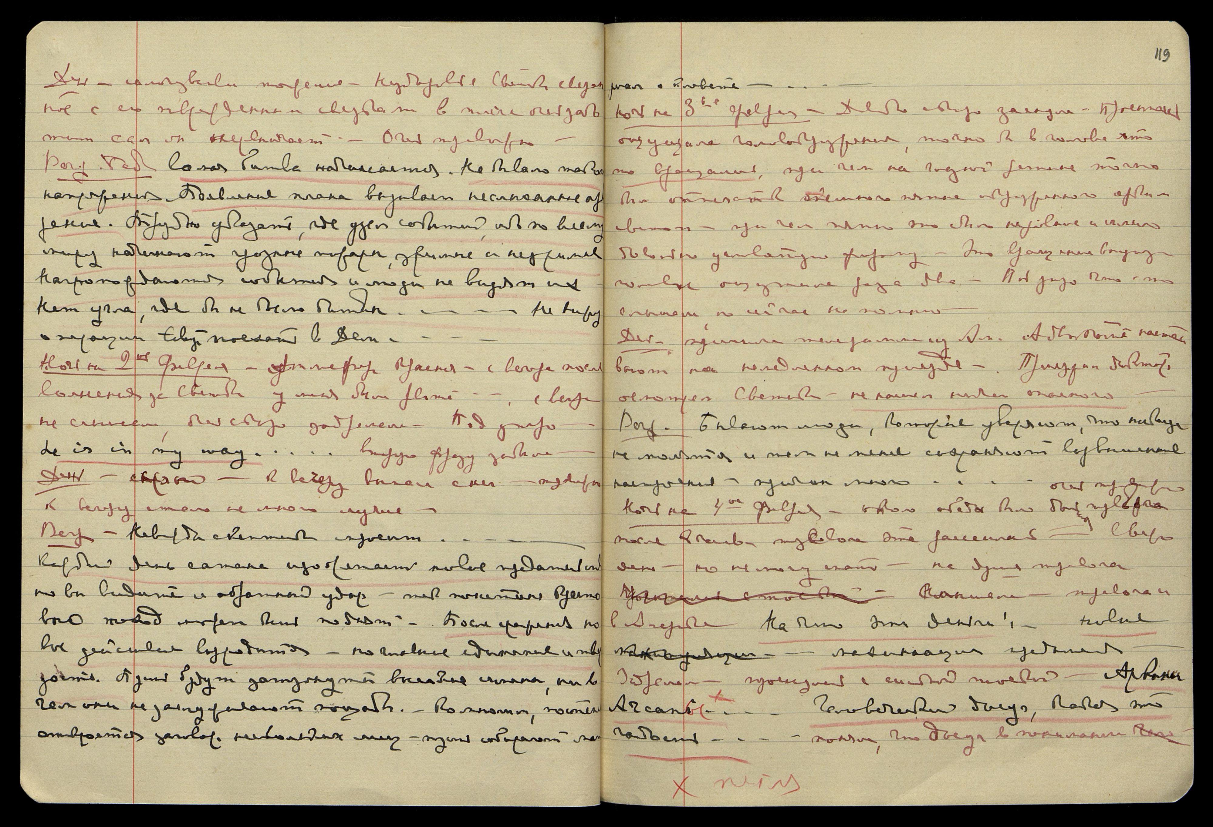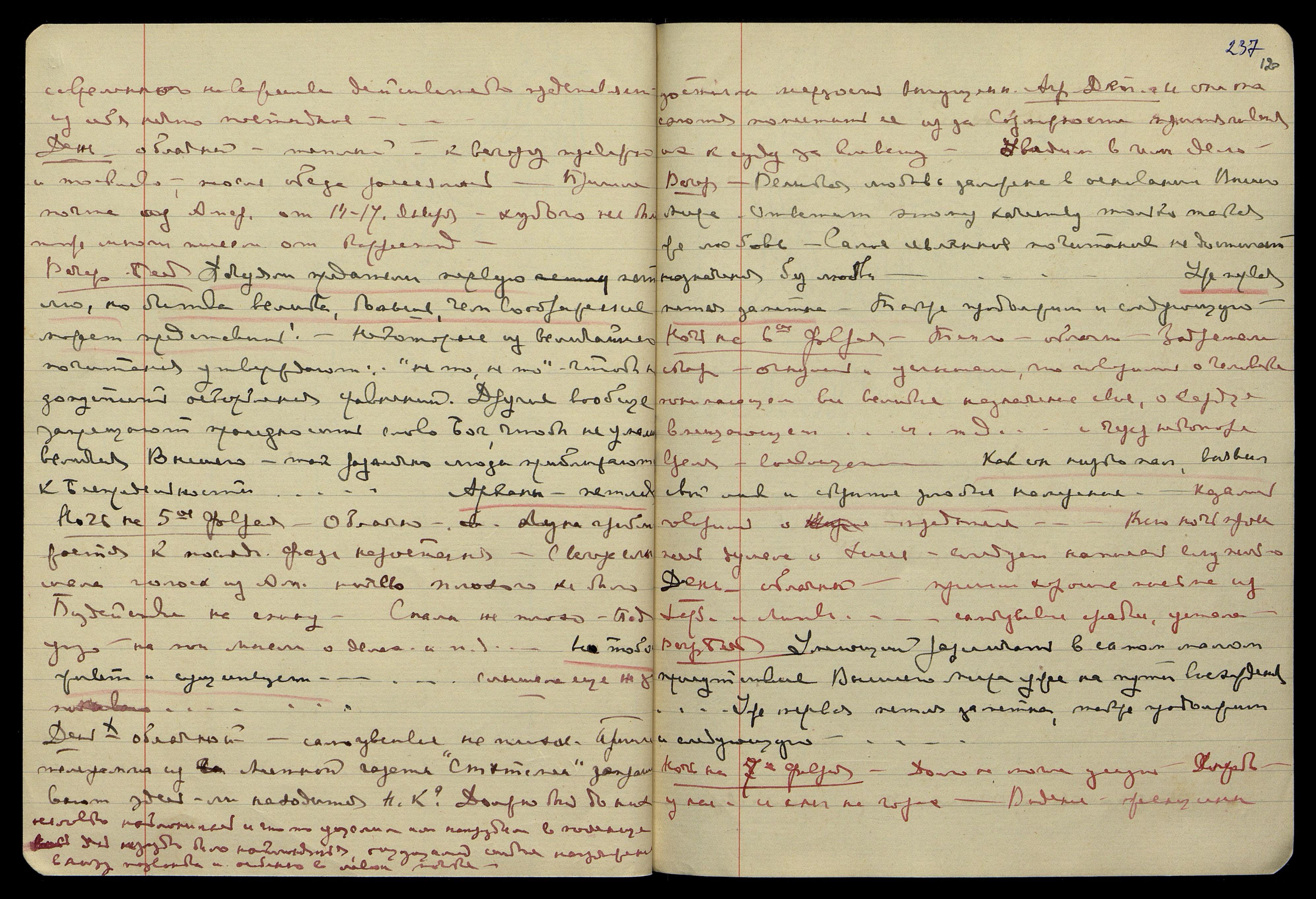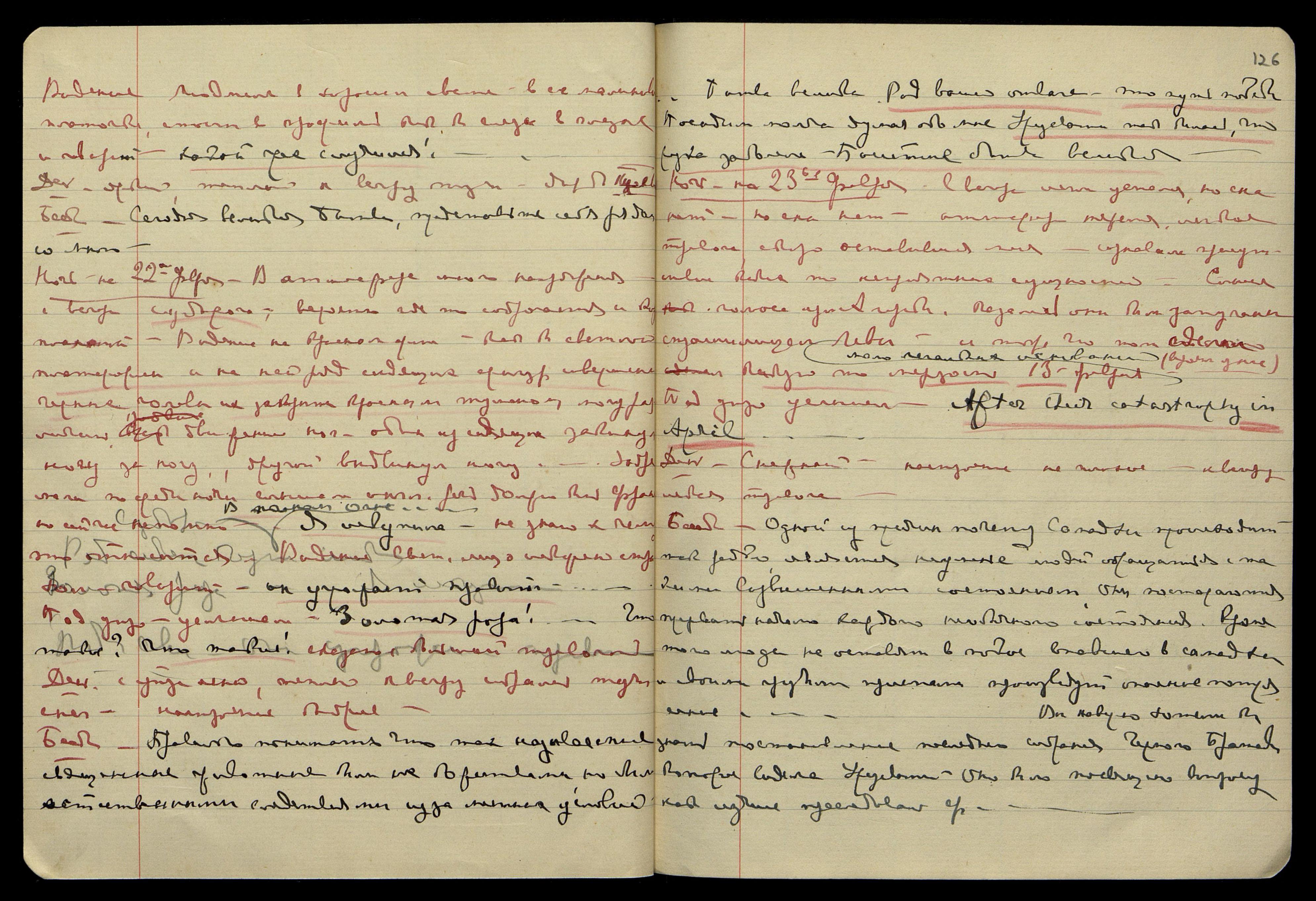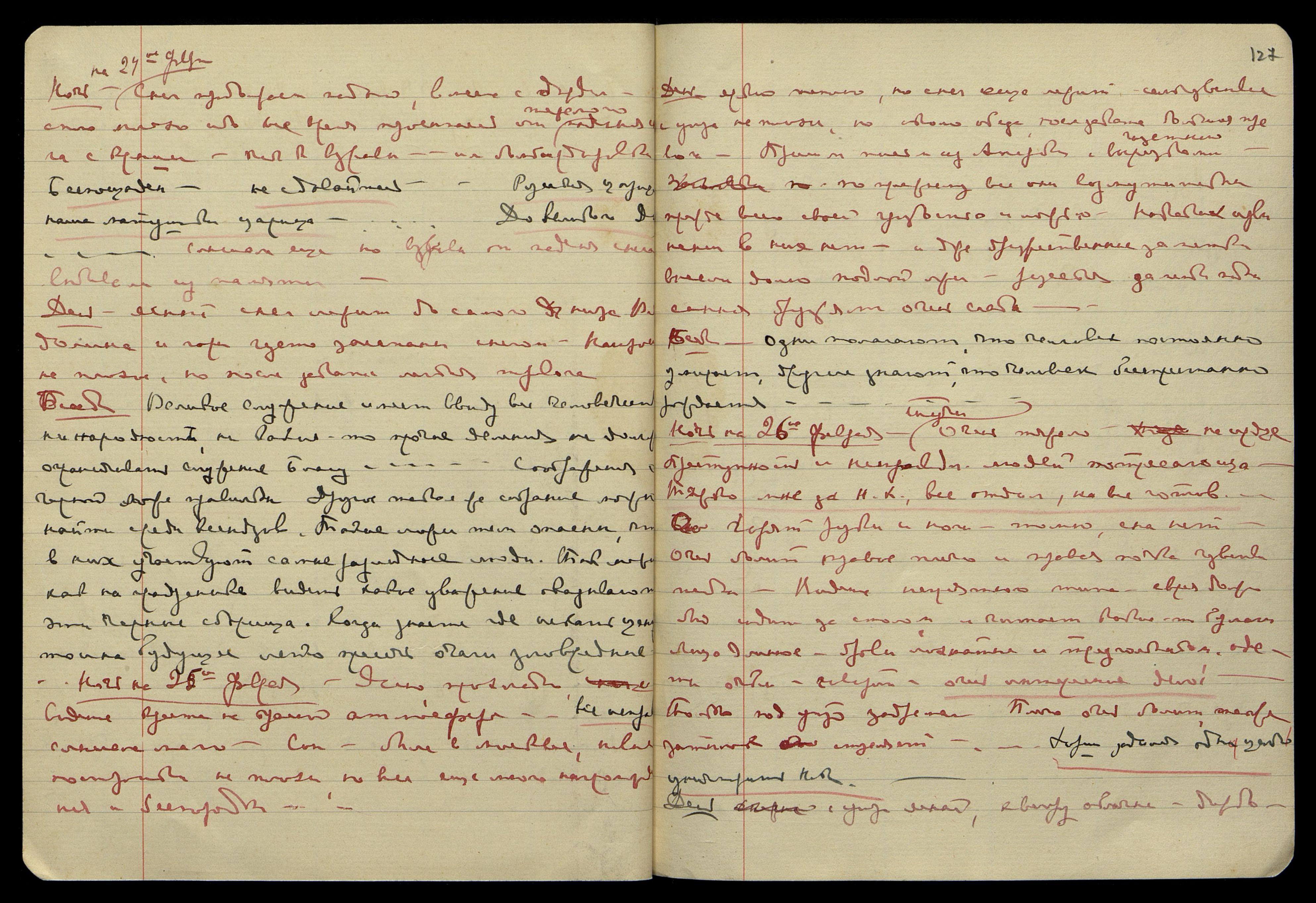 Ночь на 26-е февраля. Тучи. Очень тяжело на сердце. Преступность и несправедл[ивость] людей потрясающа. Тяжко мне за Н.К., всё отдал, на всё готов... Горят руки и ноги, томно, сна нет. Очень болит правое плечо и правая почка, чувство тоски. Видение неприятного типа, еврея, должно быть, сидит за столом и читает какие-то бумаги. Лицо длинное, брови мохнатые и треугольником, одеты очки, говорит: "Очень интересное дело!" Только под утро задремала. Плечо очень болит, также затылок стреляет. "Хорш задался одной целью − уничтожить Н.К."