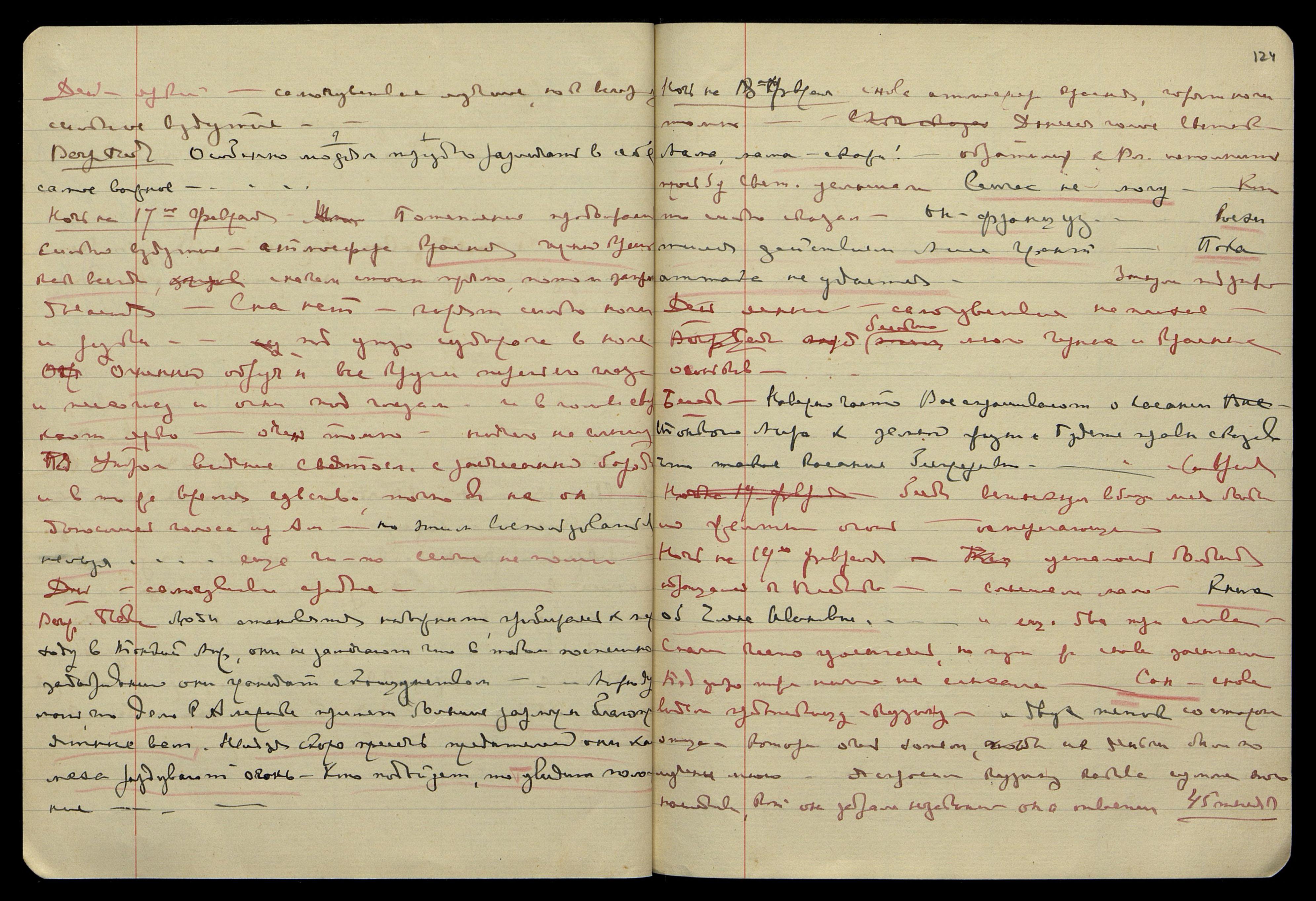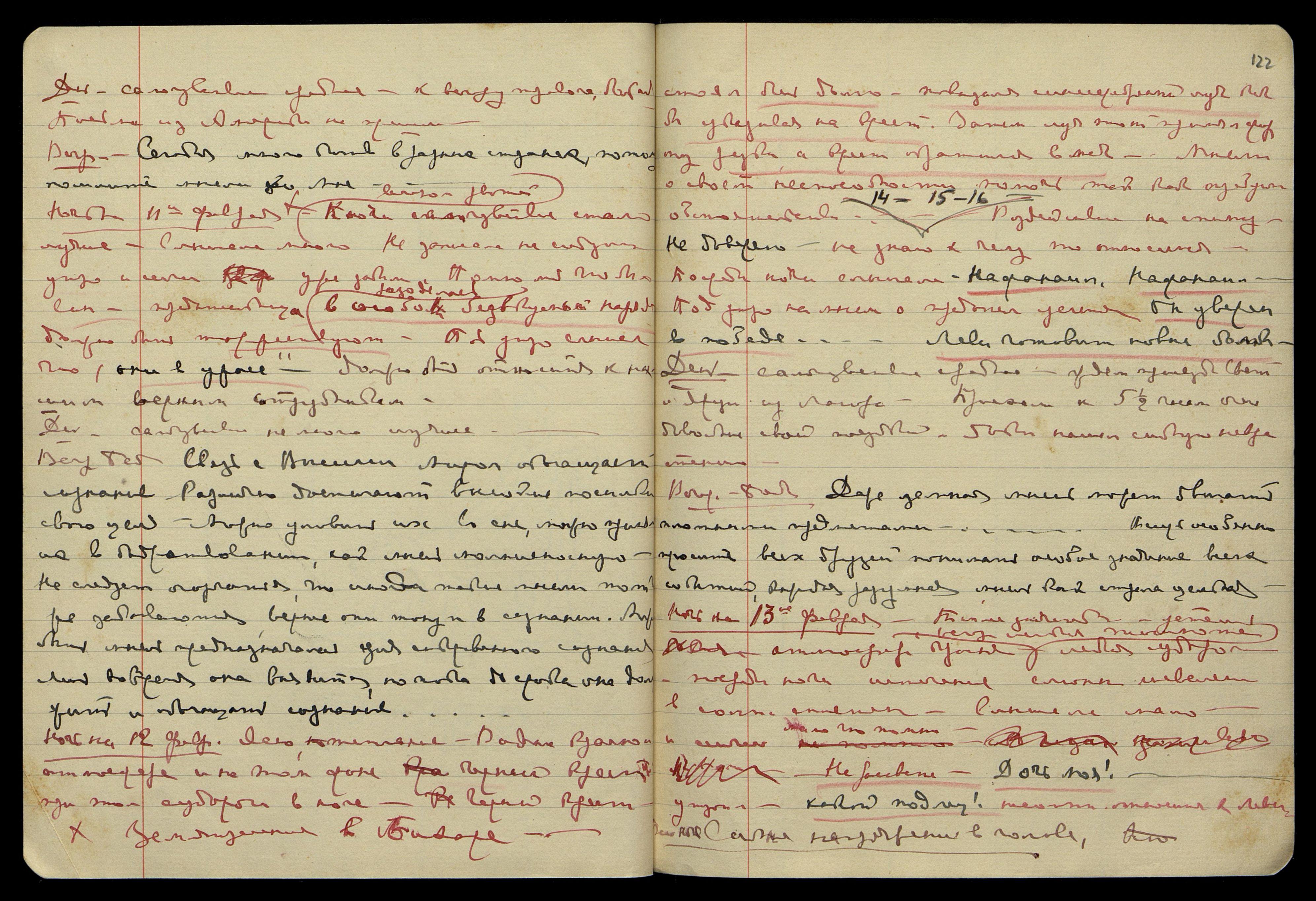 Ночь на 16-е февраля. Ясно, значительное потепление. С вечера довольно скоро уснула, ничего не слышала. Утром часов в шесть проснулась и начала вслушиваться. Донеслись голоса из Америки: "Научили и [слово неразборчиво] нет... Страшный скандал!.. All of them are most interesting... [англ.: Все они самые интересные...] Это является большим козырем... Телеграмму пишут. It ledged a great deal... [англ.: Это принесло много пользы...] на новый год... Указанные в мнимых Минутсах... Когда его первого хотели выселить... Светик... он с этим артикл'ом... это он смеет тронуть!! Ведь такие мерзавки... фотографии подчеркнут 35 раз... Я об этом не беспокоилась бы... Битва всё возрастает..." Стала вставать. Пришла телеграмма − судоговорение отсрочено на апрель.