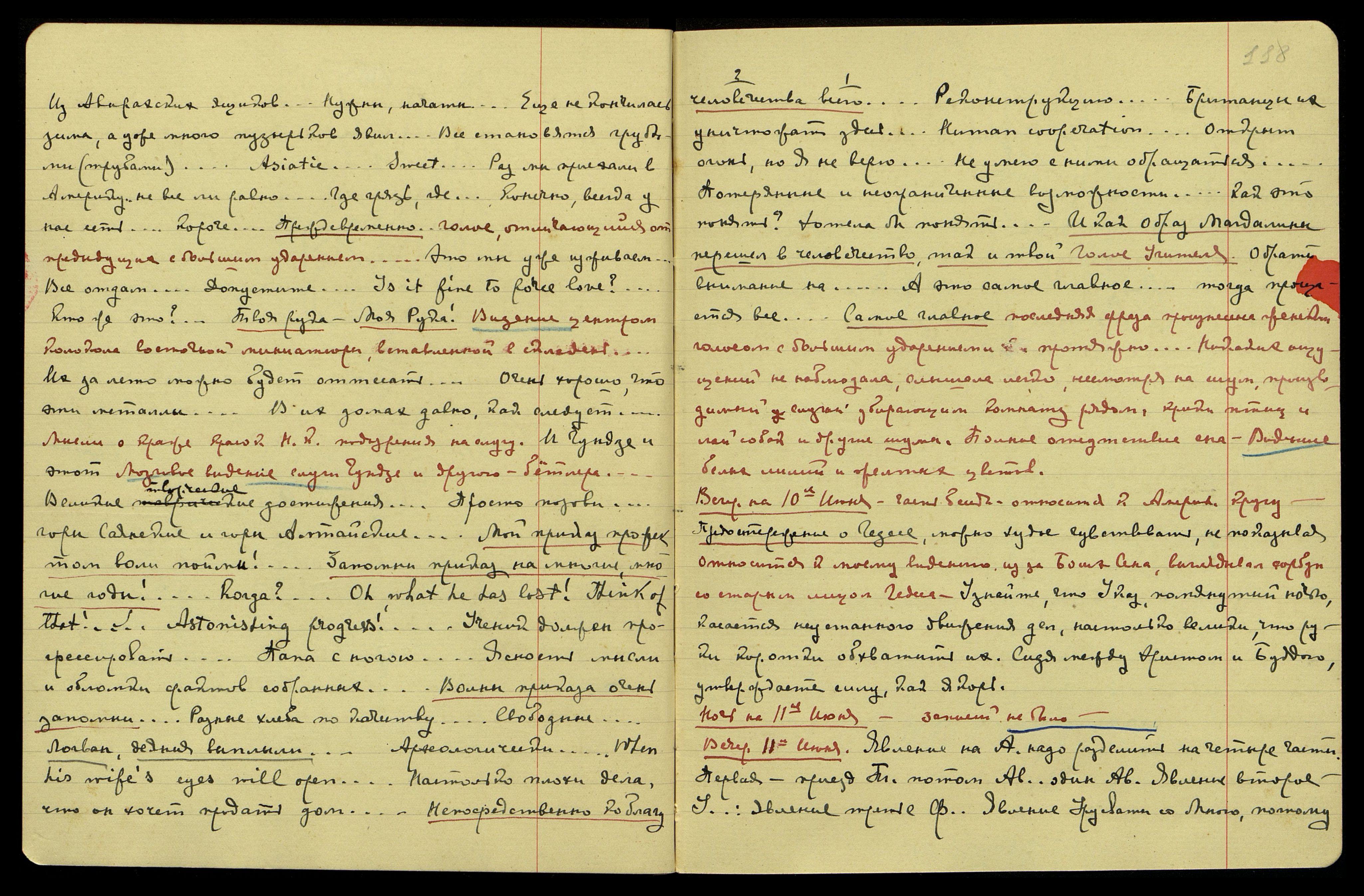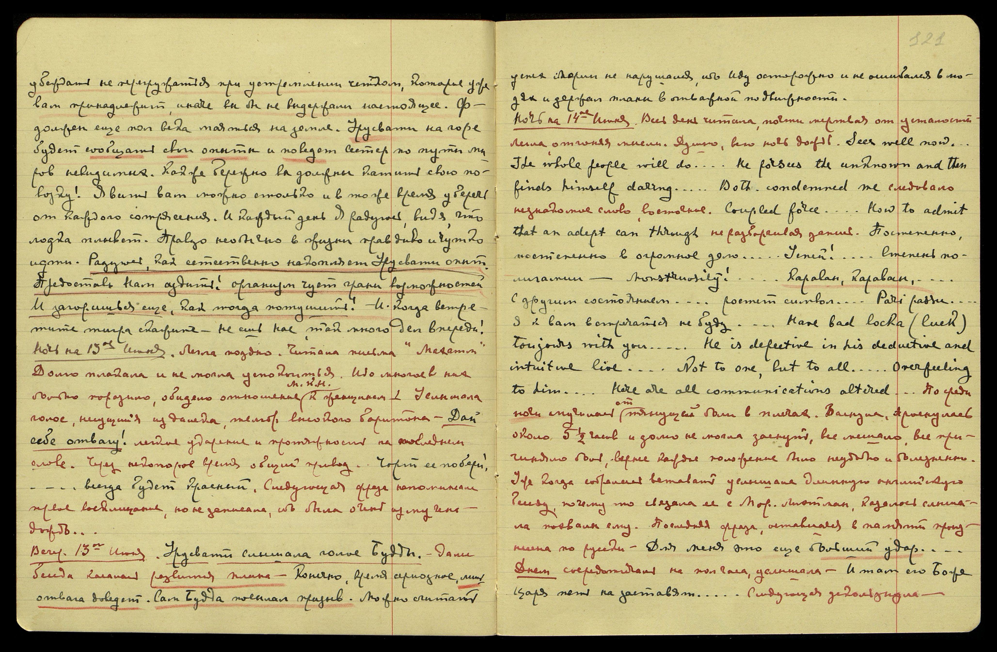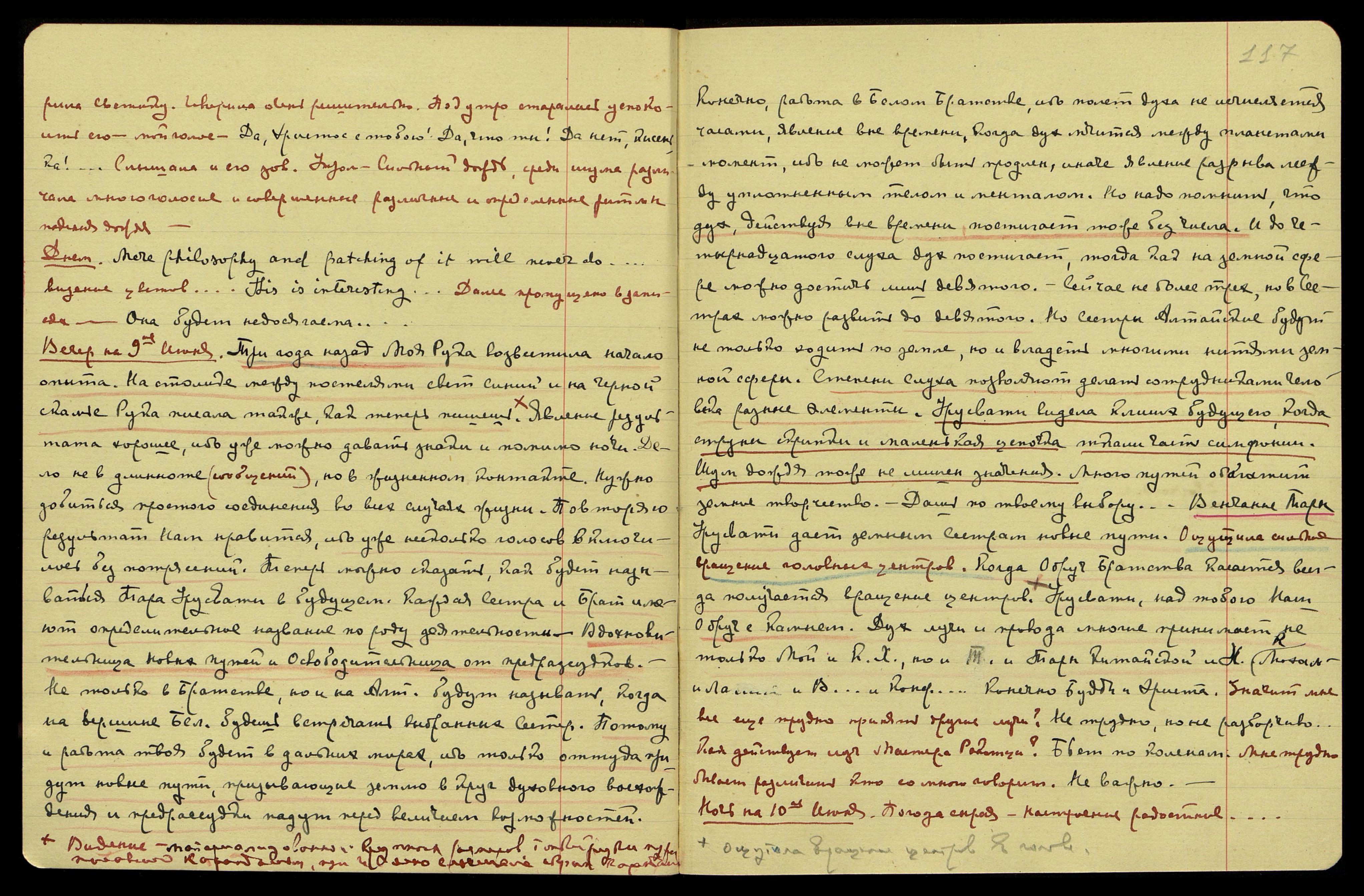Ночь на 14 июня. Весь день читала, почти мёртвая от усталости. Легла, отгоняя мысли. Душно, всю ночь дождь. "Sees will now... The whole people will do... He forsees the unknown and then finds himself daring... Both condemned me [англ.: Сейчас увидит... Весь народ подойдет... Он предвидит неизвестное, а затем находит в себе смелость... Оба осудили меня]", − следовало незнакомое слово, восточное. "Coupled force... How to admit that an adept can through [англ.: Сопряженная сила... Как признать, что адепт может через]", − неразборчивая запись. "Постепенно, постепенно в огромное дело... Успей!.. Степень полигамии − Monstrosity [англ.: чудовище]!.. Караван, караван... С другим состоянием... растет символ... Pari passu [латин.: с равным шагом, на равных]... Я к вам встречаться не буду... Have bad locka (luck) toujours with you... He is defective in his deductive and intuitwe live... Not to one? but to all... Over feeling to him... Here are all communications altered [англ.: Пусть с вами будет плохая [слово не переводится] (удача)... Он неполноценен в своем дедуктивном и интуитивном мышлении... Ни одному? но для всех... Над чувствами к нему... Здесь все коммуникации изменены]..." Посреди ночи мучилась от тянущей боли в плечах. Заснула, проснулась около 5 1/2 часов и долго не могла заснуть, всё мешало, всё причиняло боль, вернее, каждое положение было неудобно и болезненно. Уже когда собрались вставать, услышала длинную английскую беседу, почему-то связала её с Мор[исом] Лихтман, казалось, слышала похвалы ему. Последняя фраза, оставшаяся в памяти, произнесена по-русски: "Для меня это ещё больший удар..."