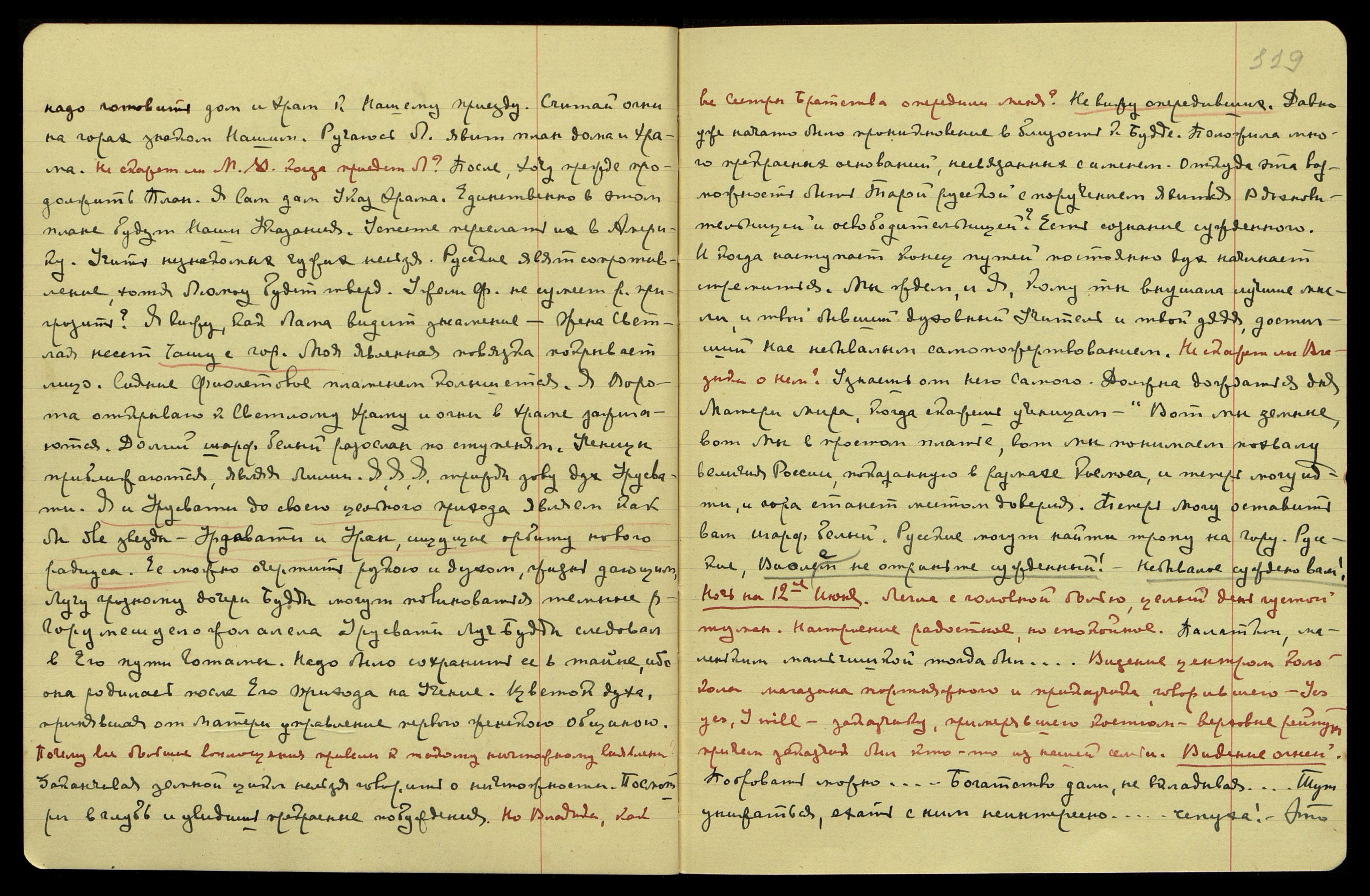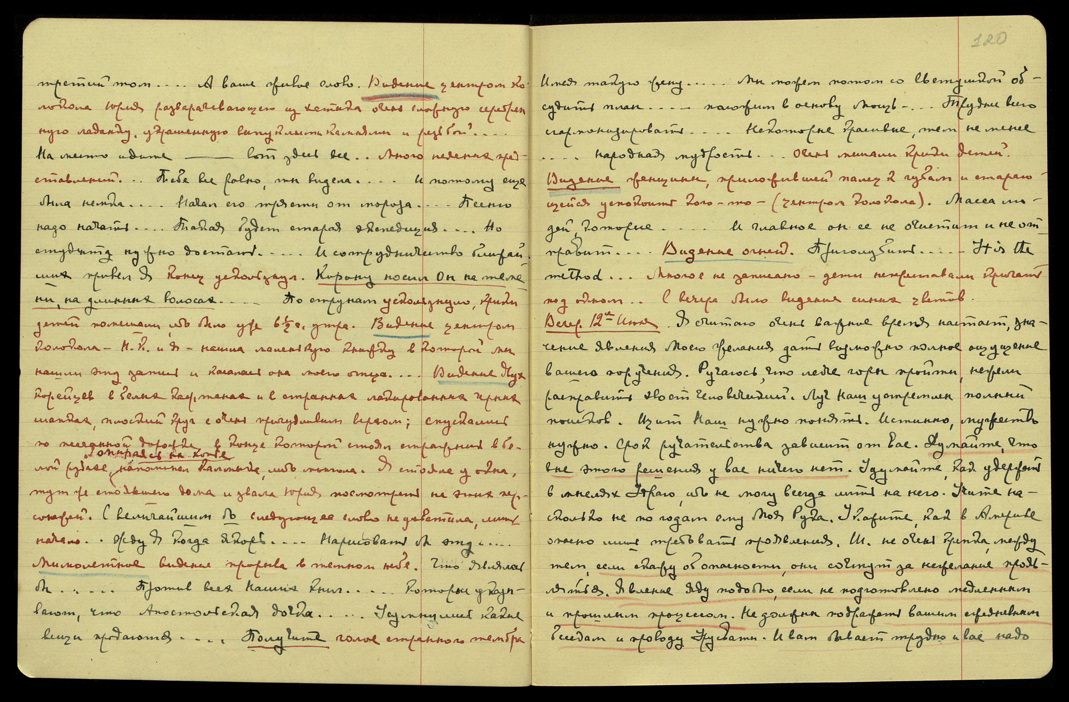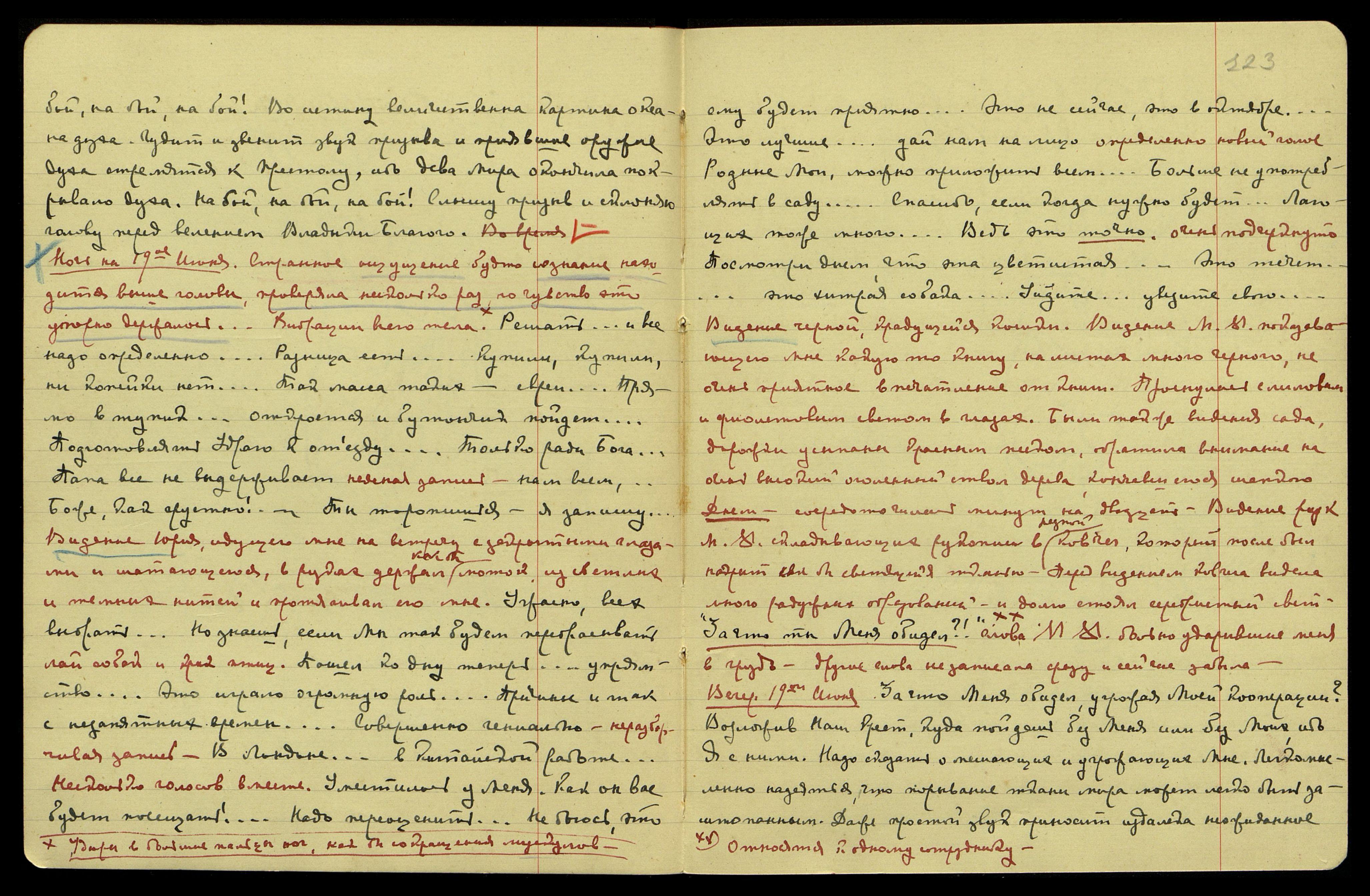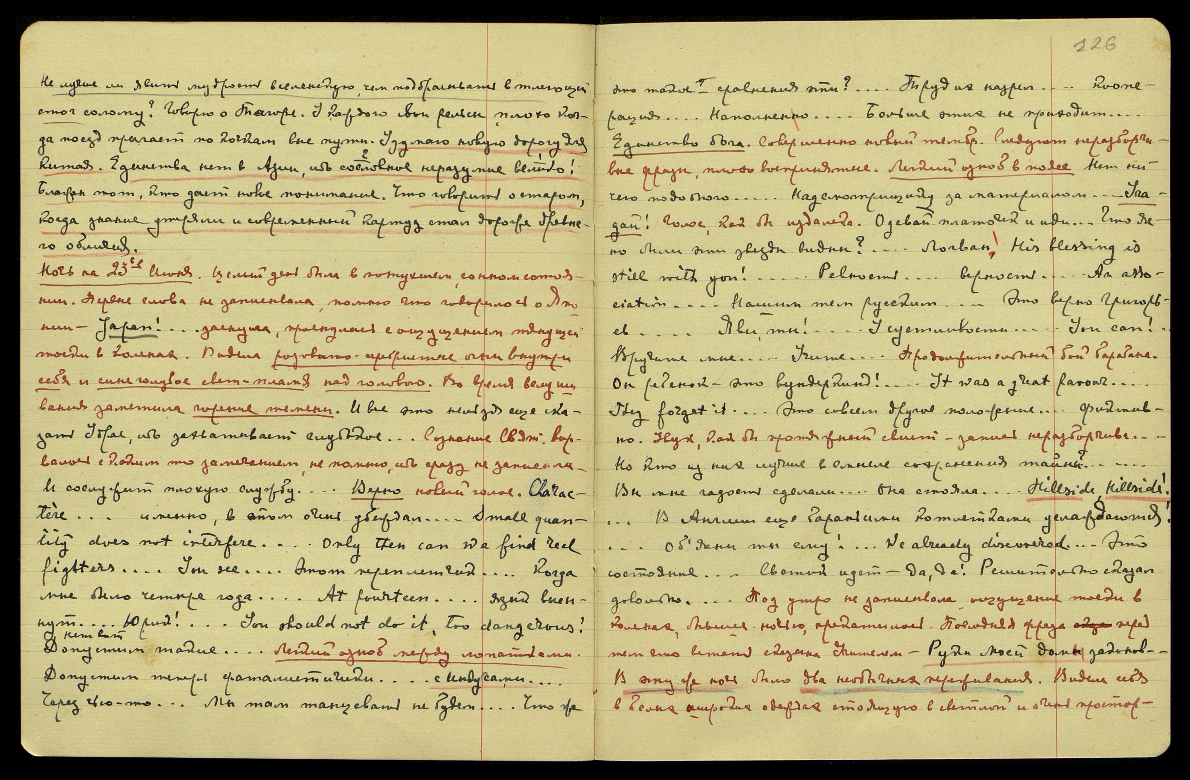 Ночь на 14 июня. Весь день читала, почти мёртвая от усталости. Легла, отгоняя мысли. Душно, всю ночь дождь. "Sees will now... The whole people will do... He forsees the unknown and then finds himself daring... Both condemned me [англ.: Сейчас увидит... Весь народ подойдет... Он предвидит неизвестное, а затем находит в себе смелость... Оба осудили меня]", − следовало незнакомое слово, восточное. "Coupled force... How to admit that an adept can through [англ.: Сопряженная сила... Как признать, что адепт может через]", − неразборчивая запись. "Постепенно, постепенно в огромное дело... Успей!.. Степень полигамии − Monstrosity [англ.: чудовище]!.. Караван, караван... С другим состоянием... растет символ... Pari passu [латин.: с равным шагом, на равных]... Я к вам встречаться не буду... Have bad locka (luck) toujours with you... He is defective in his deductive and intuitwe live... Not to one? but to all... Over feeling to him... Here are all communications altered [англ.: Пусть с вами будет плохая [слово не переводится] (удача)... Он неполноценен в своем дедуктивном и интуитивном мышлении... Ни одному? но для всех... Над чувствами к нему... Здесь все коммуникации изменены]..." Посреди ночи мучилась от тянущей боли в плечах. Заснула, проснулась около 5 1/2 часов и долго не могла заснуть, всё мешало, всё причиняло боль, вернее, каждое положение было неудобно и болезненно. Уже когда собрались вставать, услышала длинную английскую беседу, почему-то связала её с Мор[исом] Лихтман, казалось, слышала похвалы ему. Последняя фраза, оставшаяся в памяти, произнесена по-русски: "Для меня это ещё больший удар..."