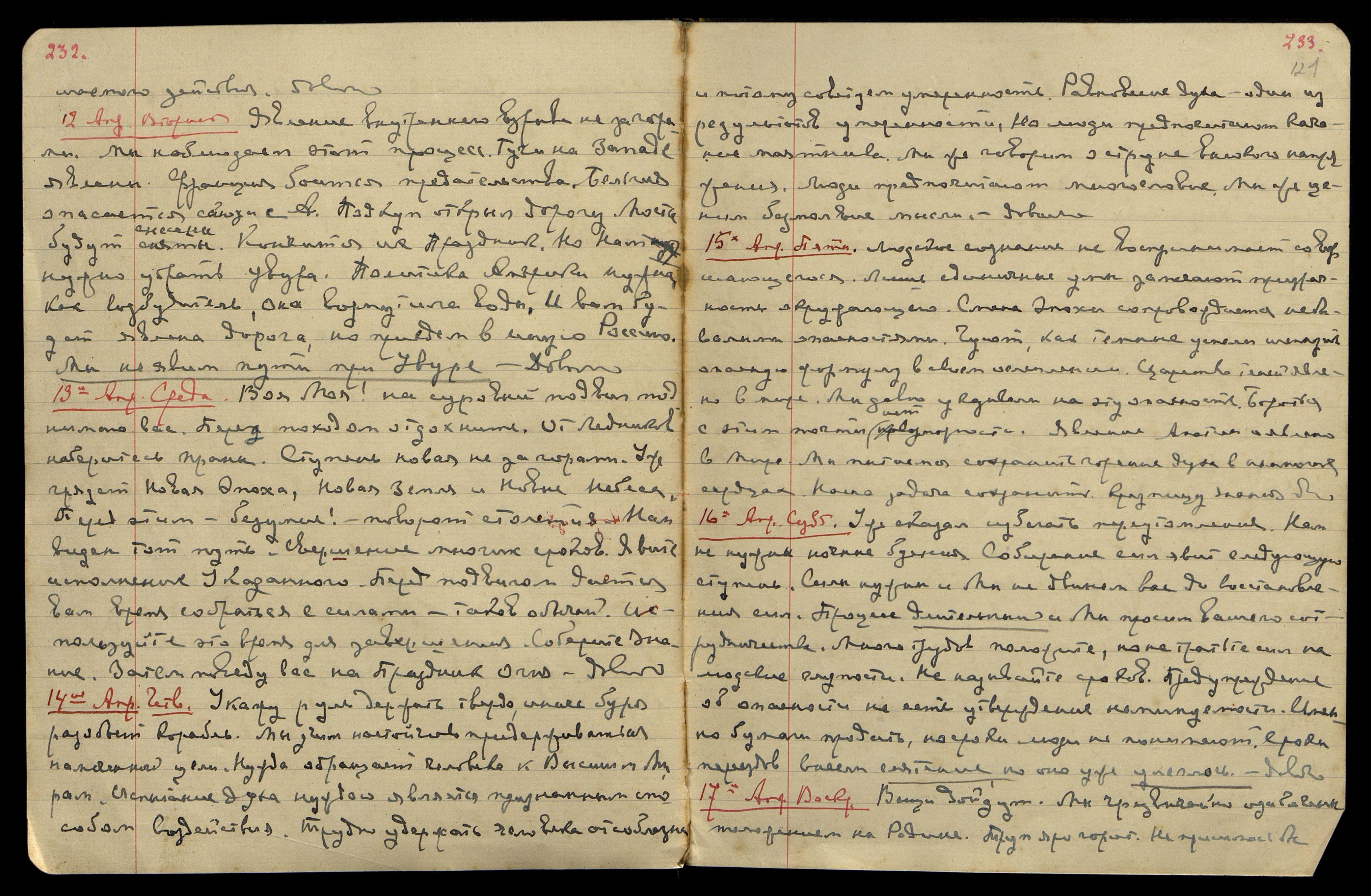 12 Апреля. Вторник. Явление внутреннего взрыва не за горами. Мы наблюдаем этот процесс. Тучи на Западе явлены. Франция боится предательства. Бельгия опасается союза с А[нглией]. Подкуп открыл дорогу. Мосты будут снесены. Кончится их Праздник. Но нам нужно убрать Увура. Политика Америки нужна как возбудитель, она возмутила воды. И вам будет явлена дорога, но придем в иную Россию. Мы не явим пути при Увуре. Довольно.