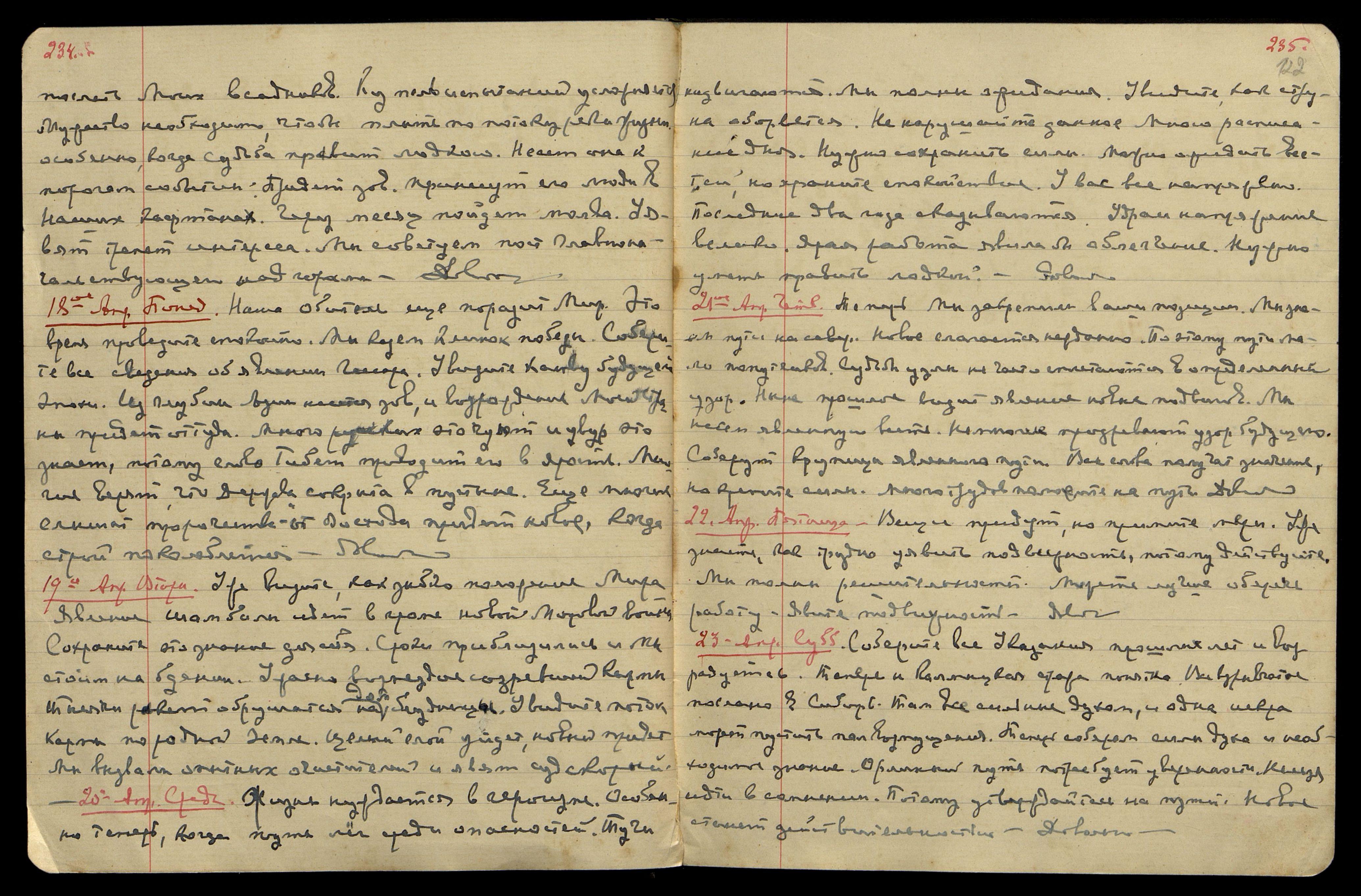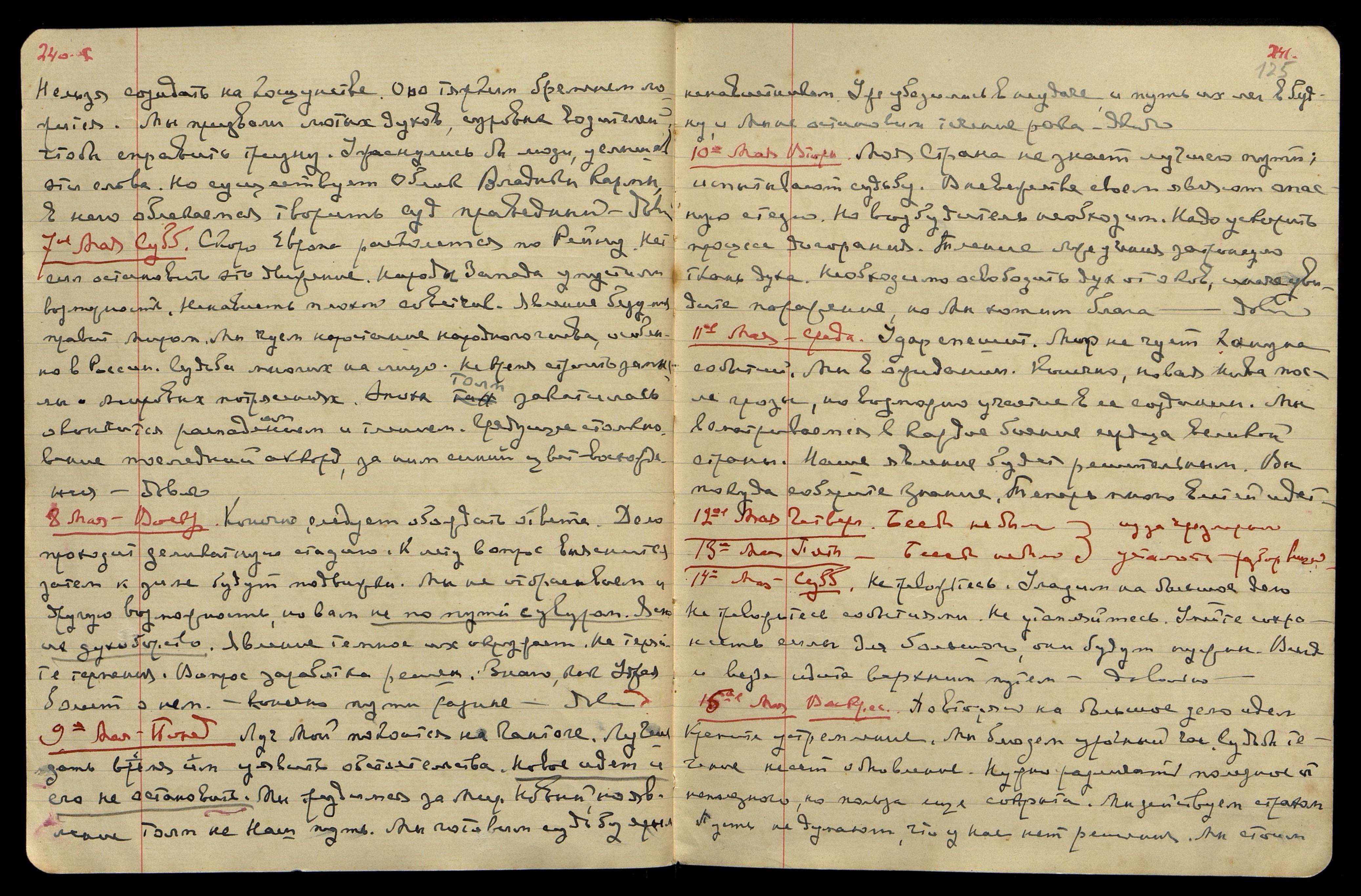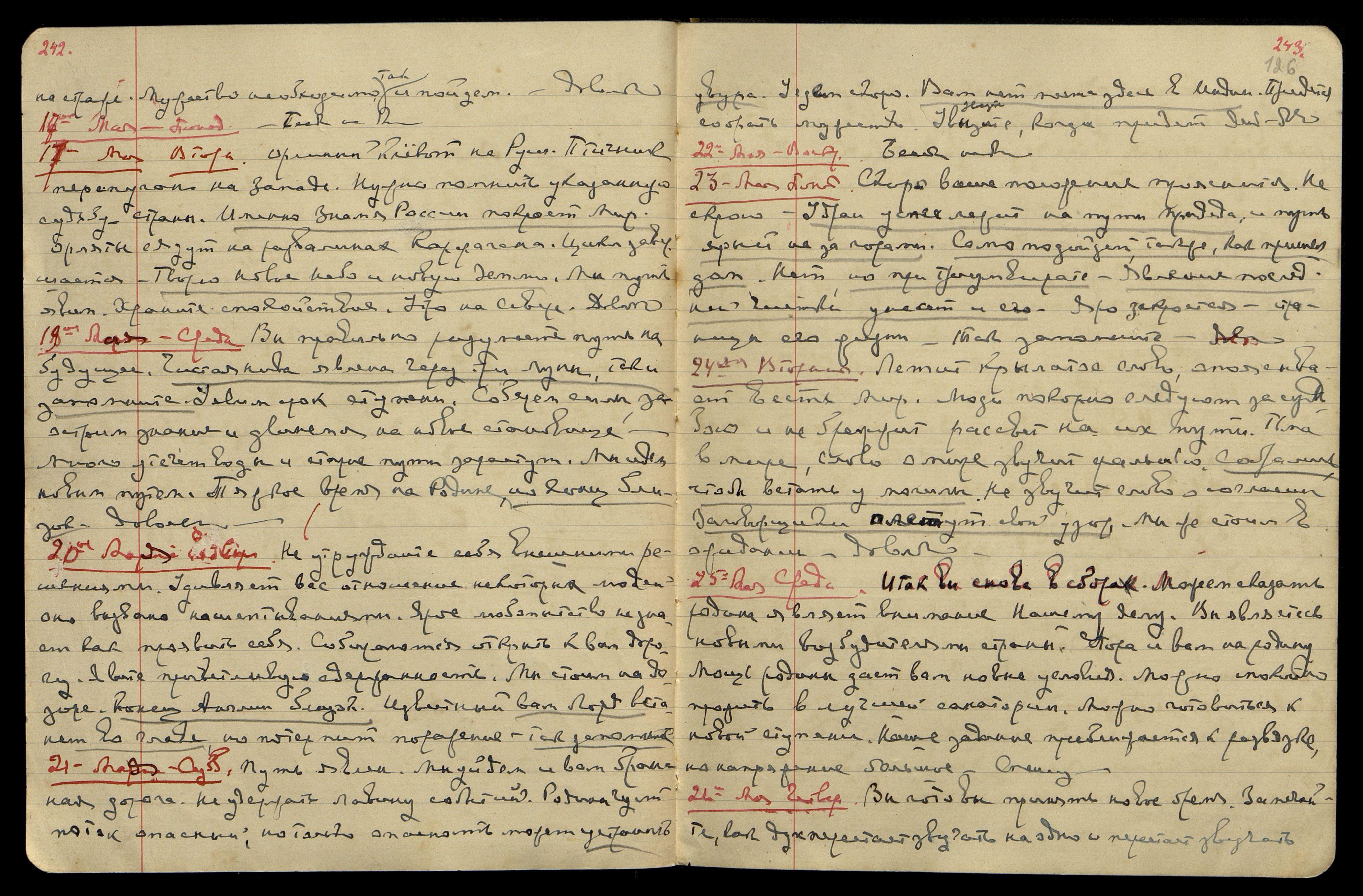 18-е мая. Среда. Вы правильно разумеете путь на будущее. Чистая нива явлена через три луны, так и запомните. Уявим срок ступени. Соберем силы, заострим знание и двинемся на новое становище. Много утечет воды, и старые пути зарастут. Мы идем новым путем. Тяжкое время на Родине, но конец близок. Довольно.