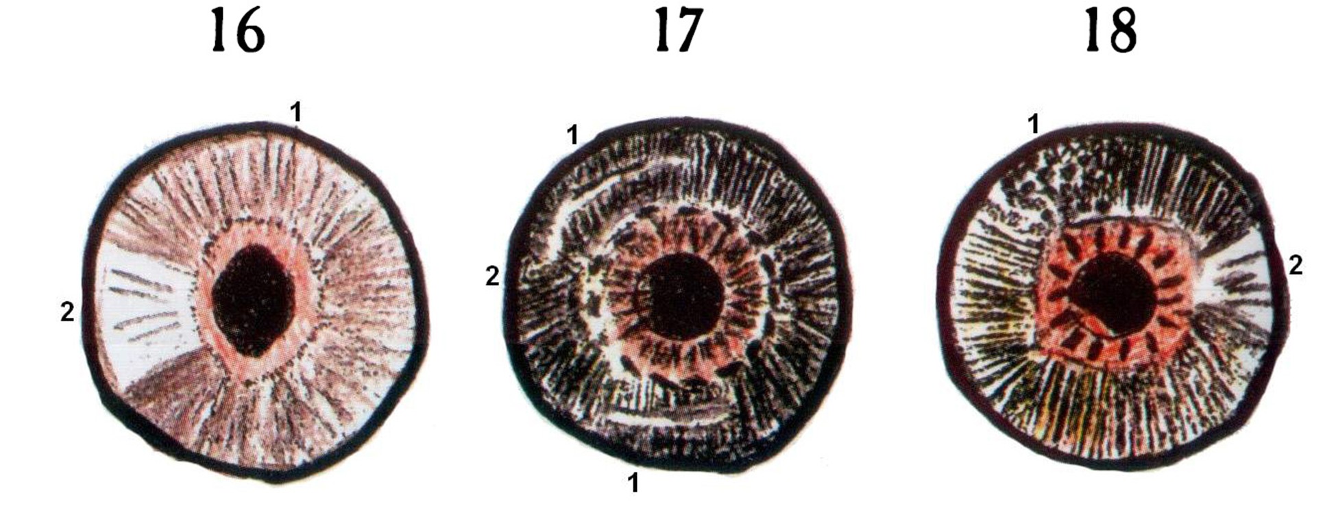 Теперь мы хотим повторить все, что мы обсуждали о цветах: равномерно окрашенные, коричневые или голубые радужки без точек или оттенков с плотными границами означают хорошее здоровье и жизненную силу. Радужная оболочка разного цвета или странной окраски означает плохую кровь, слабую жизненную силу, больные органы. Чем ровнее цвет,