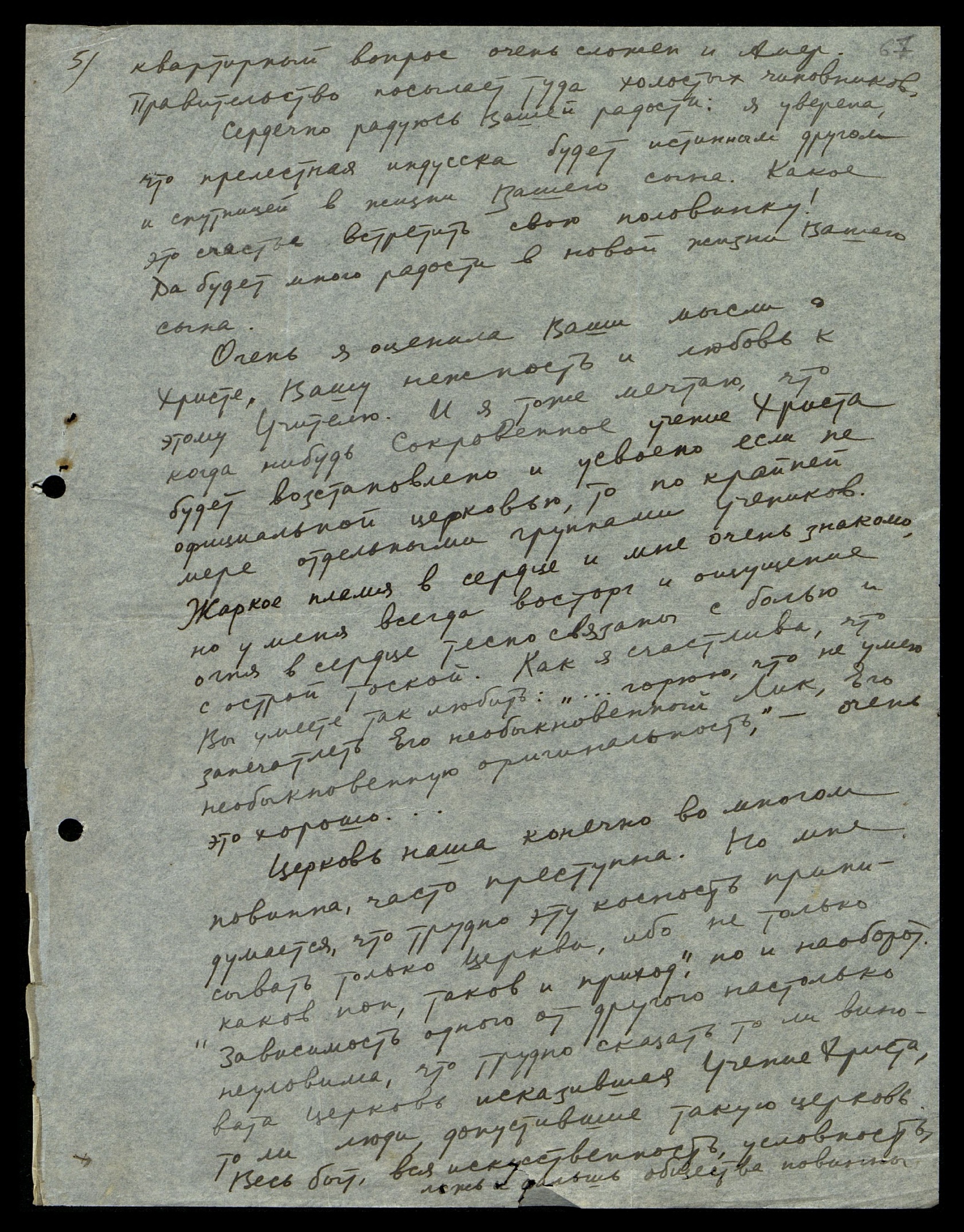 Церковь наша, конечно, во многом повинна, часто преступна. Но мне думается, что трудно эту косность приписывать только церкви, ибо не только "каков поп, таков и приход", но и наоборот. Зависимость одного от другого настолько неуловима, что трудно сказать — то ли виновата церковь, исказившая Учение Христа, то ли люди, допустившие такую церковь. Ведь быт, вся искусственность, условность, ложь и фальшь общества повинны