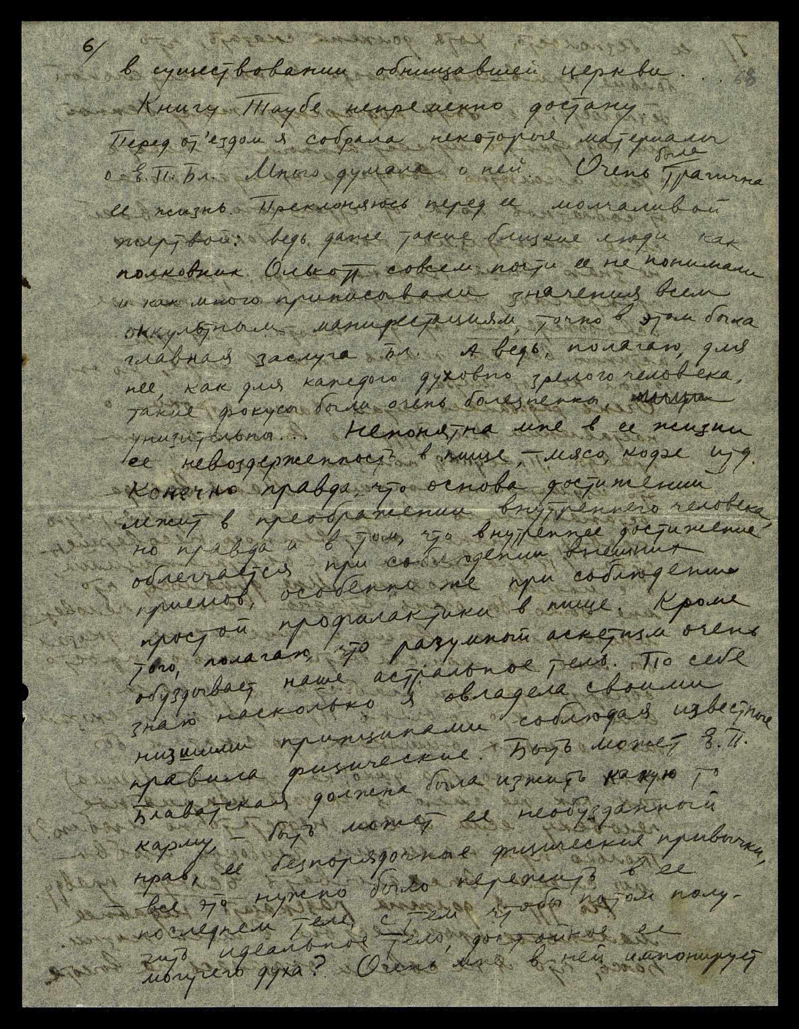 в существовании обнищавшей церкви... Книгу Таубе непременно достану. Перед отъездом я собрала некоторые материалы о Е.П. Бл[аватской]. Много думала о ней. Очень трагична её жизнь. Преклоняюсь перед её молчаливой жертвой: ведь даже такие близкие люди, как полковник Олькотт, совсем почти её не понимали и как много приписывали значения всем оккультным манифестациям, точно в этом была главная заслуга Бл[аватской]. А ведь, полагаю, для неё, как для каждого духовно зрелого человека, такие фокусы были очень болезненны, унизительны... Непонятна мне в её жизни её невоздержанность в пище — мясо, кофе и т[ак] д[алее]. Конечно, правда, что основа достижений лежит в преображении внутреннего человека, но правда и в том, что внутреннее достижение облегчается при соблюдении внешних приёмов, особенно же при соблюдении простой профилактики в пищё. Кроме того, полагаю, что разумный аскетизм очень обуздывает наше астральное тело. По себе знаю, насколько я овладела своими низшими принципами, соблюдая известные правила физические. Быть может, Е.П. Блаватская должна была изжить какую-то карму, быть может, её необузданный нрав, её беспорядочные физические привычки — всё это нужно было пережить в её последнем теле, с тем, чтобы потом получить идеальное тело, достойное её могучего духа? Очень мне в ней импонирует