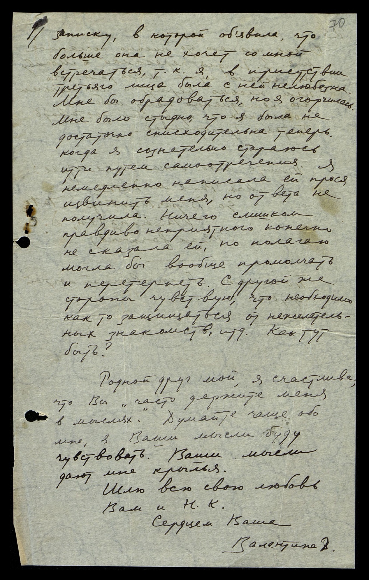 записку, в которой объявила, что больше она не хочет со мной встречаться, т[ак] к[ак] я в присутствии третьего лица была с ней нелюбезна. Мне бы обрадоваться, но я огорчилась. Мне было стыдно, что я была не достаточно снисходительна теперь, когда я сознательно стараюсь идти путём самоотречения. Я немедленно написала ей, прося извинить меня, но ответа не получила. Ничего слишком правдиво неприятного, конечно, не сказала ей, но полагаю, могла бы вообще промолчать и перетерпеть. С другой же стороны чувствую, что необходимо как-то защищаться от нежелательных знакомств и т[ак] д[алее]. Как тут быть?