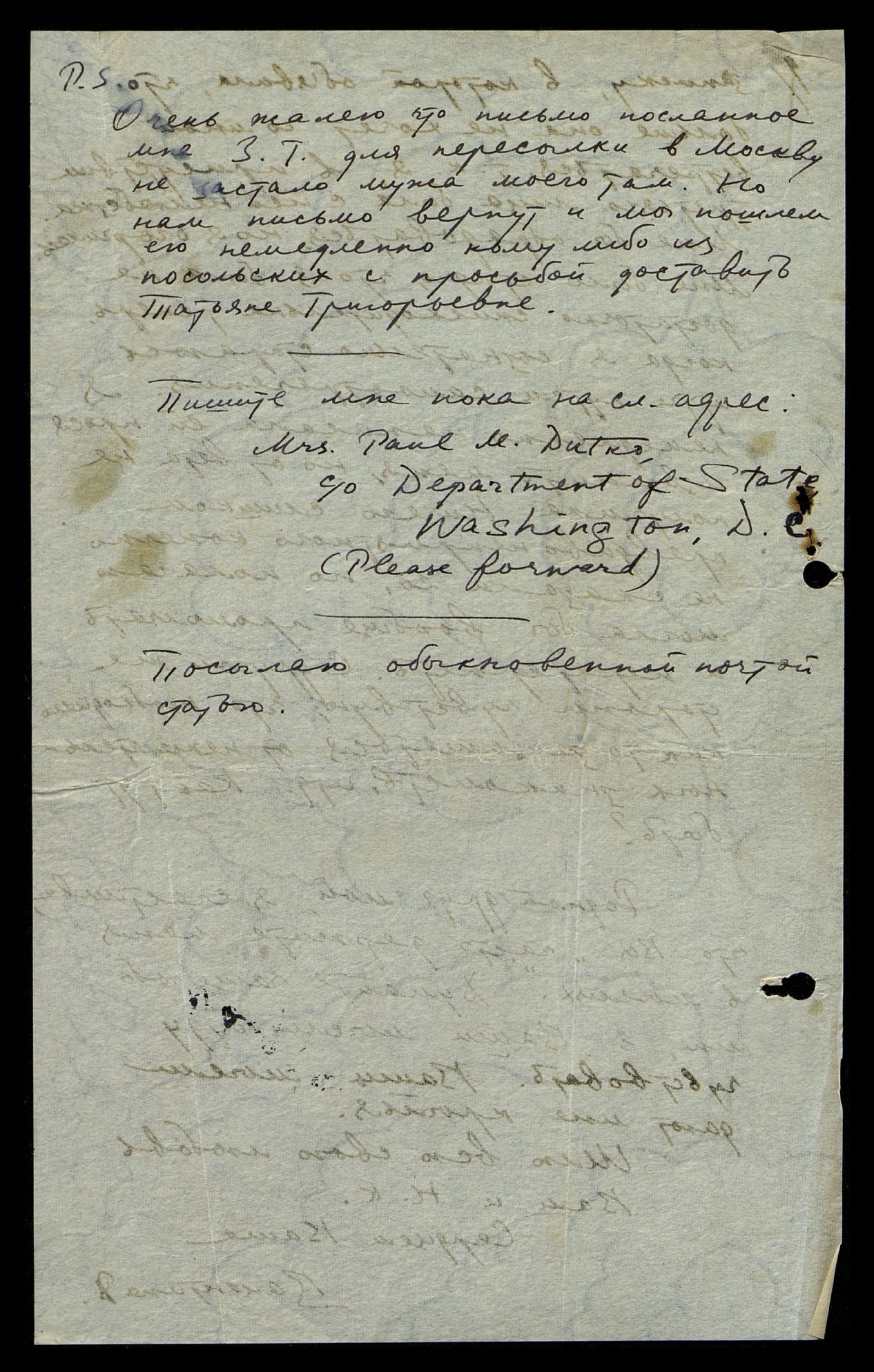 P.S. Очень жалею, что письмо, посланное мне З[инаидой] Г[ригорьевной] для пересылки в Москву не застало мужа моего там. Но нам письмо вернут, и мы пошлём его немедленно кому-либо из посольских с просьбой доставить Татьяне Григорьевне.