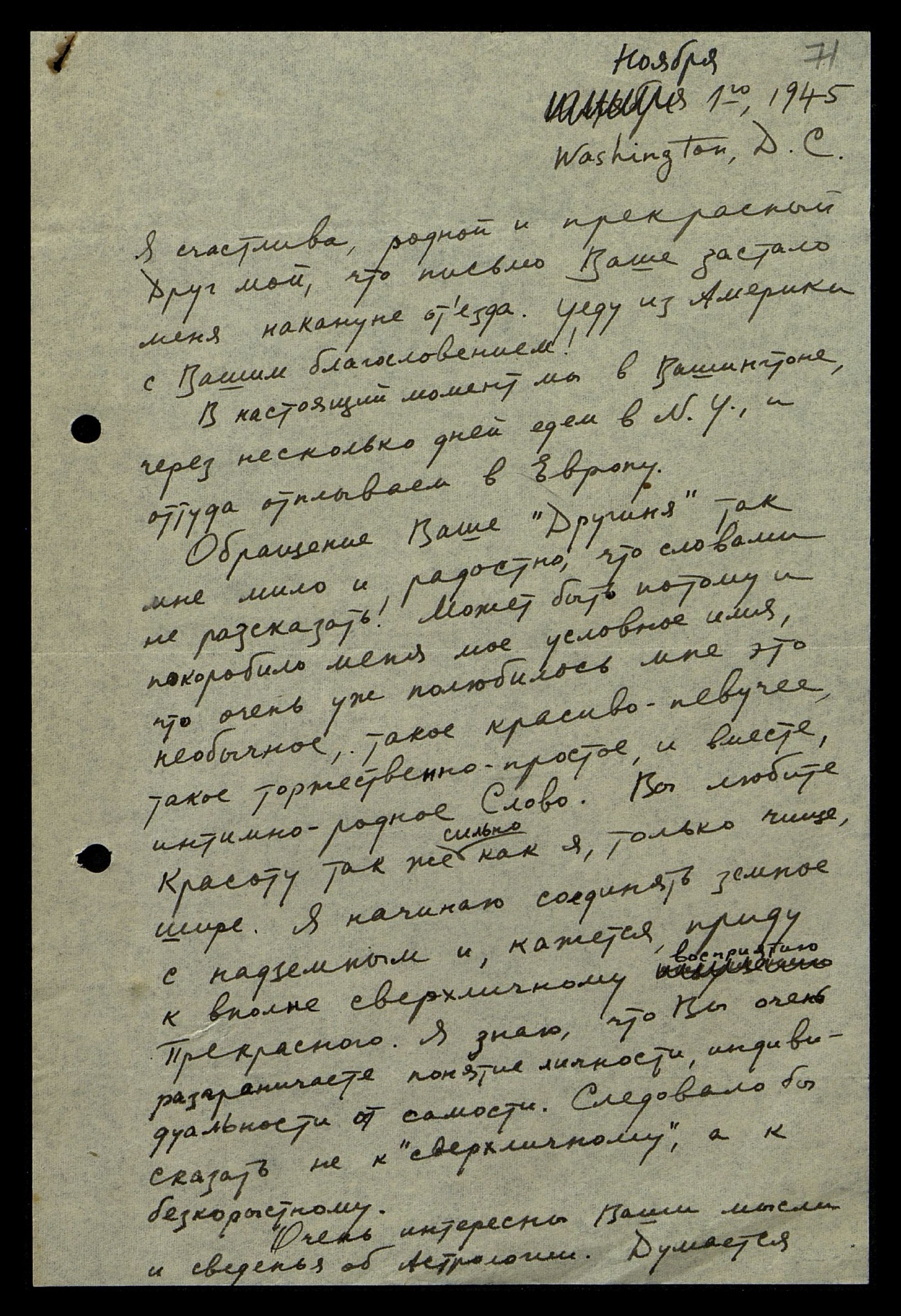 Я счастлива, родной и прекрасный Друг мой, что письмо Ваше застало меня накануне отъезда. Уеду из Америки с Вашим благословением! В настоящий момент мы в Вашингтоне, через несколько дней едем в N.Y. [англ.: Нью Йорк] и оттуда отплываем в Европу. Обращение Ваше "Другиня" так мне мило и радостно, что словами не рассказать! Может быть, потому и покоробило меня моё условное имя, что очень уж полюбилось мне это необычное, такое красиво-певучее, такое торжественно-простое, и вместе, интимно-родное Слово. Вы любите Красоту так же сильно, как я, только чище, шире. Я начинаю соединять земное с надземным и, кажется, прийду к вполне сверхличному восприятию Прекрасного. Я знаю, что Вы очень разграничиваете понятие личности, индивидуальности от самости. Следовало бы сказать не к "сверхличному", а к бескорыстному.