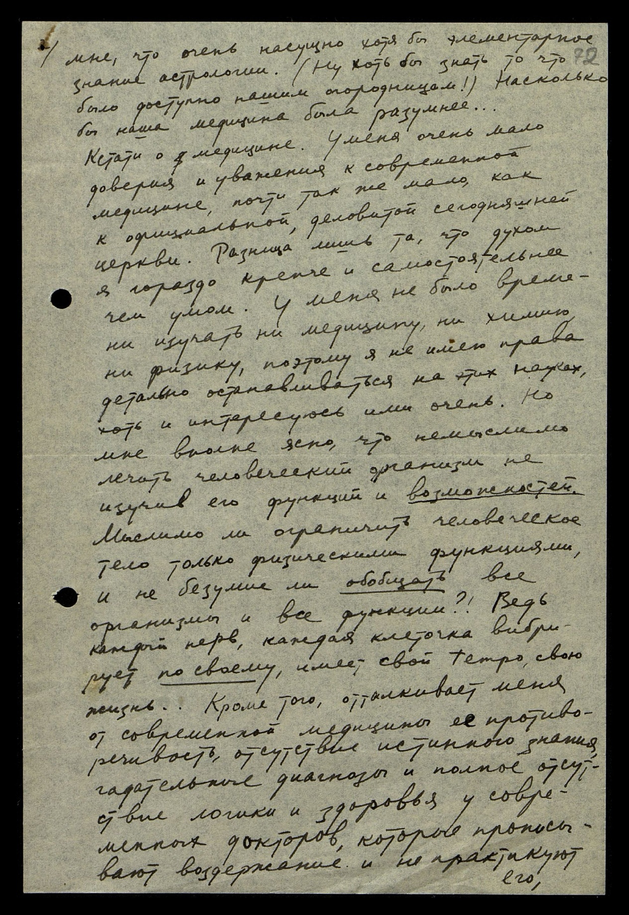 Кстати, о медицине. У меня очень мало доверия и уважения к современной медицине, почти так же мало, как к официальной, деловитой сегодняшней церкви. Разница лишь та, что духом я гораздо крепче и самостоятельнее, чем умом. У меня не было времени изучать ни медицину, ни химию, ни физику, поэтому я не имею права детально останавливаться на этих науках, хоть и интересуюсь ими очень. Но мне вполне ясно, что немыслимо лечить человеческий организм, не изучив его функций и возможностей. Мыслимо ли ограничить человеческое тело только физическими функциями и не безумие ли обобщать все организмы и все функции?! Ведь каждый нерв, каждая клеточка вибрирует по-своему, имеет свой tempo, свою жизнь... Кроме того, отталкивает меня от современной медицины её противоречивость, отсутствие истинного знания, гадательные диагнозы и полное отсутствие логики и здоровья у современных докторов, которые прописывают воздержание и не практикуют его,