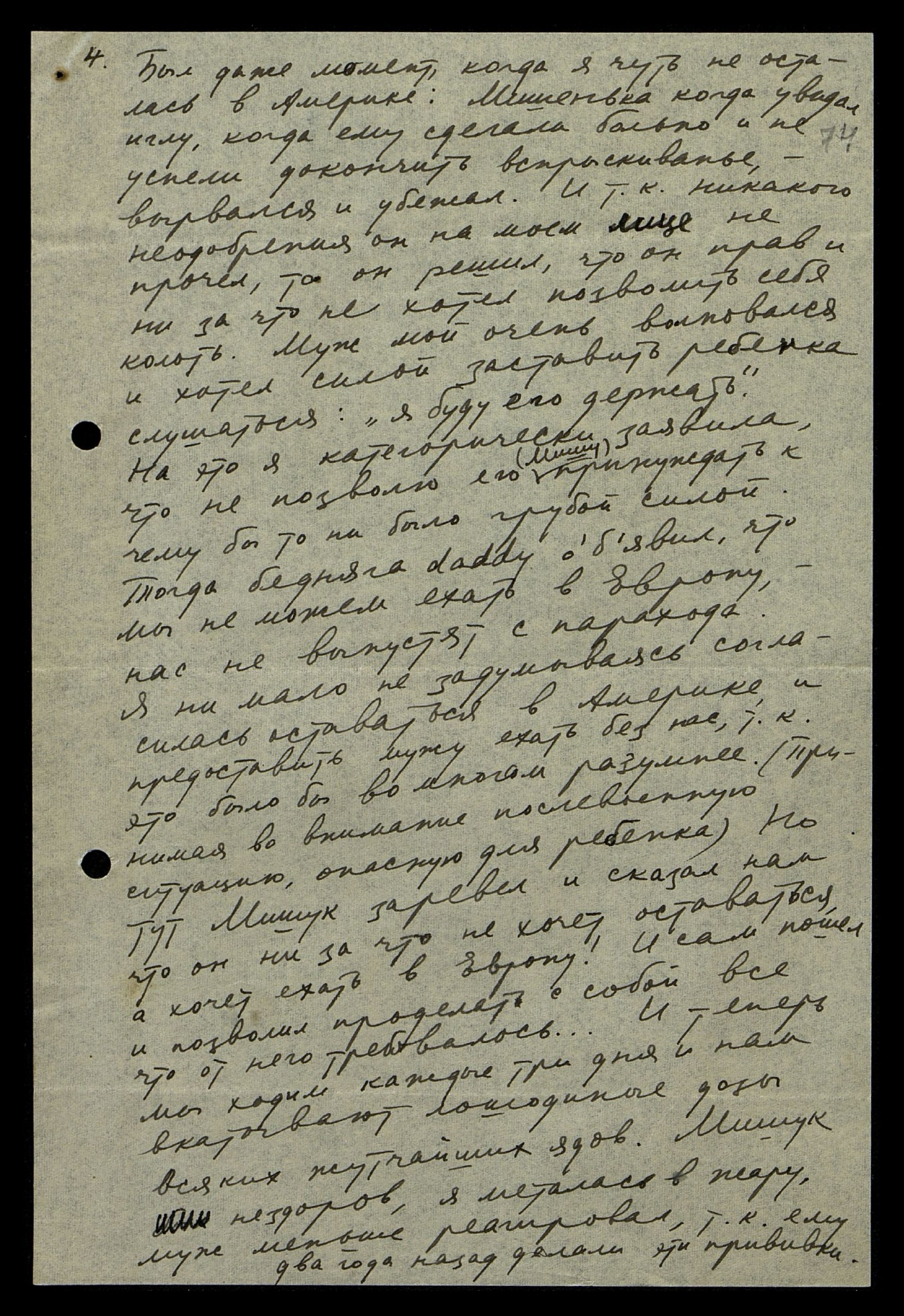 Был даже момент, когда я чуть не осталась в Америке: Мишенька, когда увидал иглу, когда ему сделали больно и не успели докончить вспрыскивание, вырвался и убежал. И т[ак] к[ак] никакого неодобрения он на моём лице не прочёл, то он решил, что он прав и ни за что не хотел позволить себя колоть. Муж мой очень волновался и хотел силой заставить ребенка слушаться: "Я буду его держать". На это я категорически заявила, что не позволю его (Мишу) принуждать к чему бы то ни было грубой силой. Тогда бедняга daddy объявил, что мы не можем ехать в Европу, нас не выпустят с парохода. Я ни мало не задумываясь согласилась оставаться в Америке и предоставить мужу ехать без нас, т[ак] к[ак] это было бы во многом разумнее. (Принимая во внимание послевоенную ситуацию, опасную для ребенка). Но тут Мишук заревел и сказал нам, что он ни за что не хочет оставаться, а хочет ехать в Европу! И сам пошёл и позволил проделать с собой всё, что от него требовалось... И теперь мы ходим каждые три дня и нам вкатывают лошадиные дозы всяких жутчайших ядов. Мишук нездоров, я металась в жару, муж меньше реагировал, т[ак] к[ак] ему два года назад делали эти прививки.