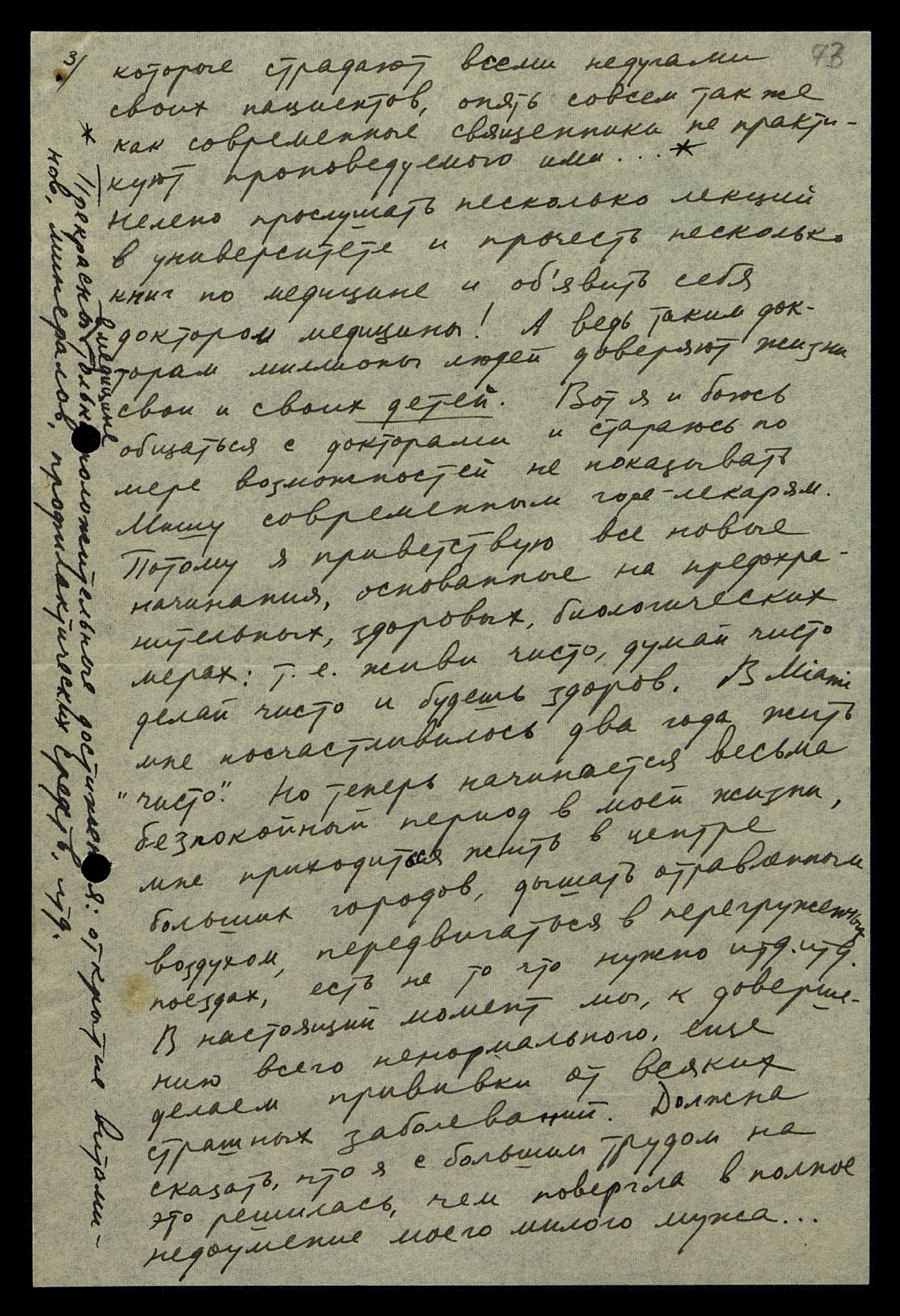 Нелепо прослушать несколько лекций в университете и прочесть несколько книг по медицине и объявить себя доктором медицины! А ведь таким докторам миллионы людей доверяют жизни свои и своих детей. Вот я и боюсь общаться с докторами и стараюсь по мере возможностей не показывать Мишу современным горе-лекарям. Потому я приветствую все новые начинания, основанные на предохранительных, здоровых, биологических мерах, т[о] е[сть] живи чисто, думай чисто, делай чисто и будешь здоров. В Miami мне посчастливилось два года жить "чисто". Но теперь начинается весьма беспокойный период в моей жизни, мне приходится жить в центре больших городов, дышать отравленным воздухом, передвигаться в перегруженных поездах, есть не то, что нужно и т[ак] д[алее] и т[ак] д[алее]. В настоящий момент мы, к довершению всего ненормального, ещё делаем прививки от всяких страшных заболеваний. Должна сказать, что я с большим трудом на это решилась, чем повергла в полное недоумение моего милого мужа...