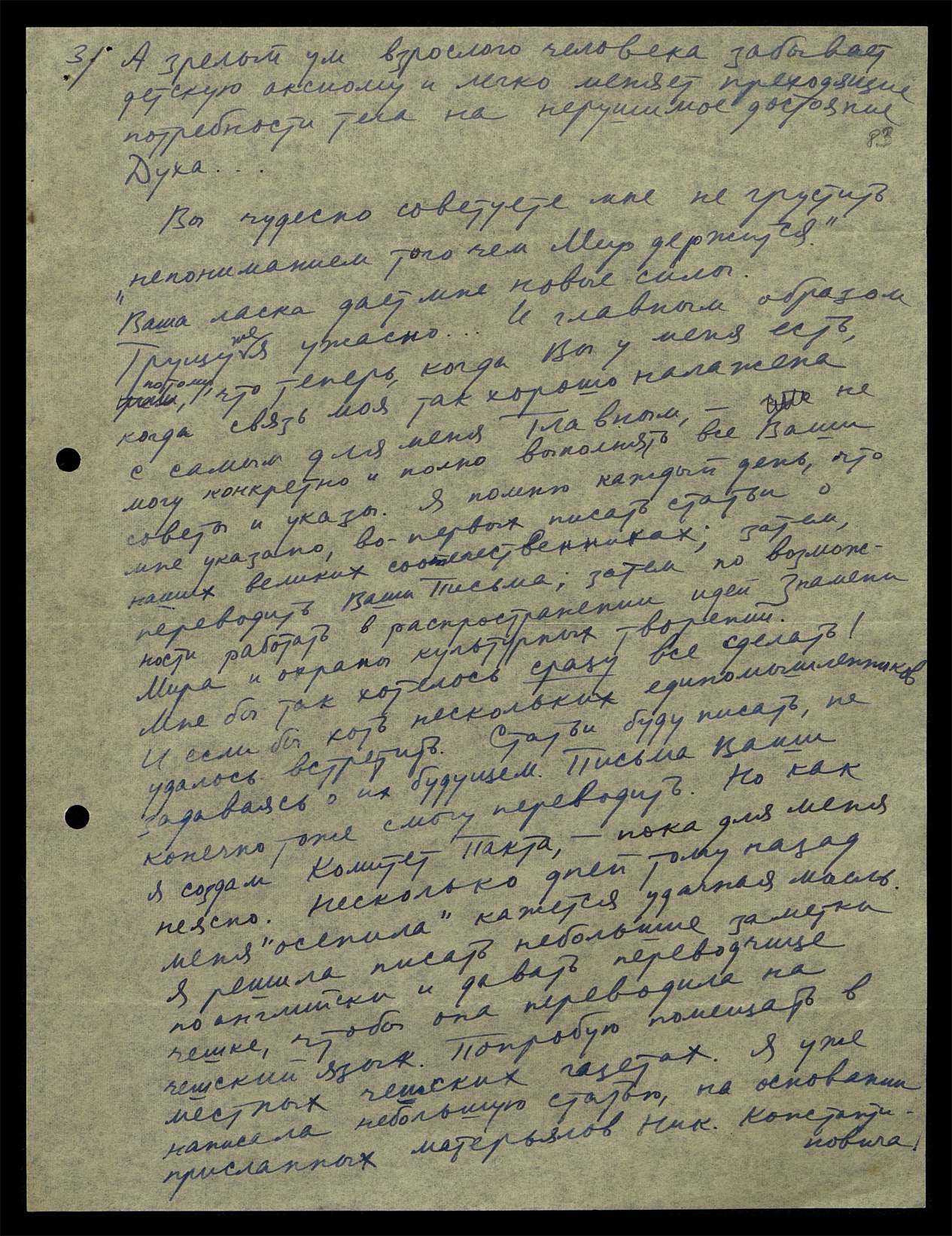Вы чудесно советуете мне не грустить "непониманием того, чем Мир держится". Ваша ласка дает мне новые силы. Грущу же я ужасно... И главным образом потому, что теперь, когда Вы у меня есть, когда связь моя так хорошо налажена с самым для меня Главным, не могу конкретно и полно выполнять все Ваши советы и указы. Я помню каждый день, что мне указано, во-первых, писать статьи о наших великих соотечественниках, затем переводить Ваши Письма, затем, по возможности работать в распространении идей Знамени Мира и охраны культурных творений. Мне бы так хотелось сразу все сделать! Если бы хоть нескольких единомышленников удалось встретить. Статьи буду писать, не задаваясь об их будущем. Письма Ваши, конечно, тоже смогу переводить. Но как я создам Комитет Пакта, пока для меня неясно. Несколько дней тому назад меня "осенила", кажется, удачная мысль. Я решила писать небольшие заметки по-английски и давать переводчице чешке, чтобы она переводила на чешский язык. Попробую помещать в местных чешских газетах. Я уже написала небольшую статью, на основании присланных материалов Николая Константиновича.