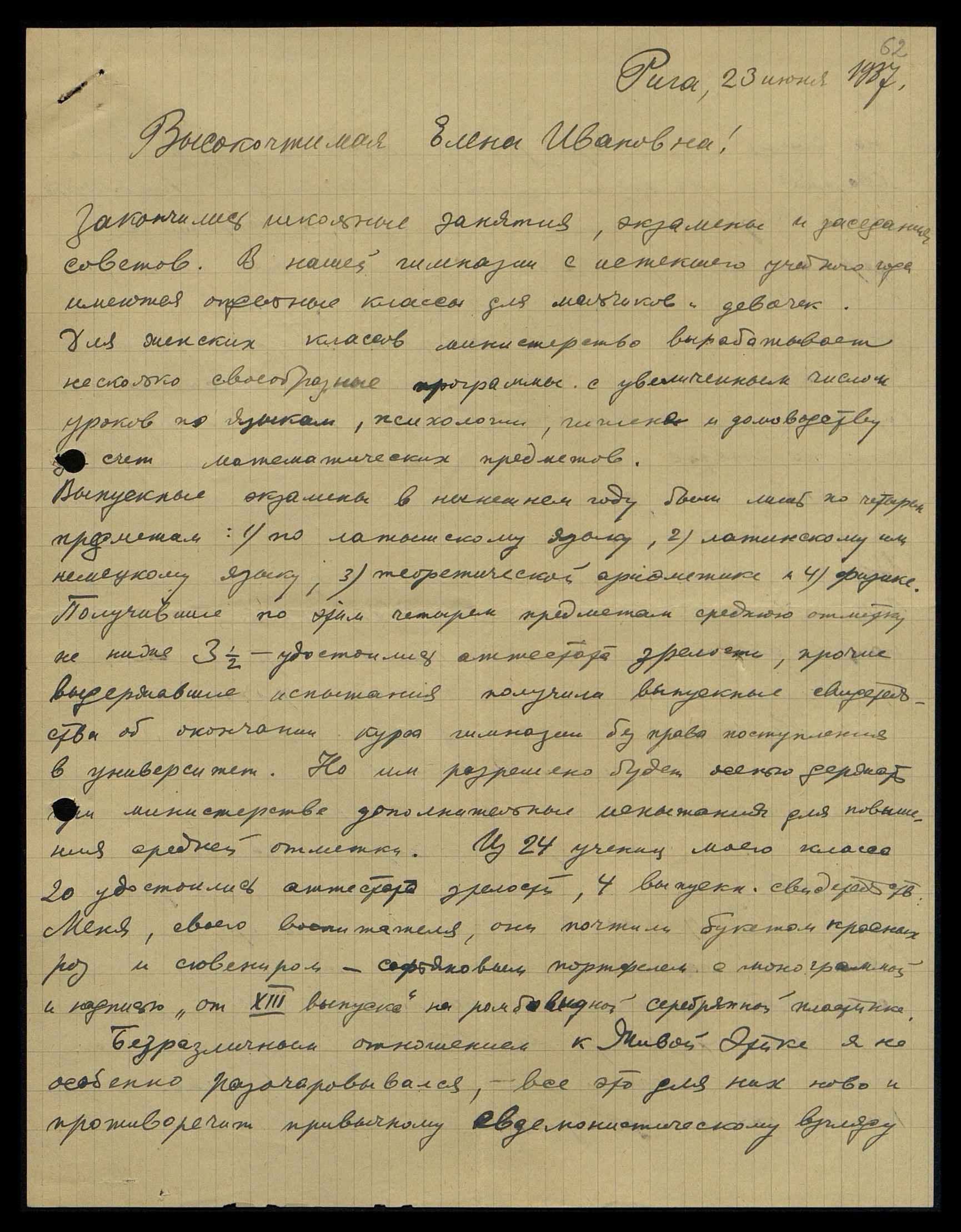 Выпускные экзамены в нынешнем году были лишь по четырём предметам: 1) по латышскому языку, 2) латинскому и немецкому языку, 3) теоретической арифметике и 4) физике. Получившие по этим четырём предметам среднюю отметку не ниже 3,5 удостоились аттестата зрелости, прочие выдержавшие испытание получили выпускные свидетельства об окончании курса гимназии без права поступления в университет. Но им разрешено будет осенью держать при министерстве дополнительные испытания для повышения средней отметки. Из 24 учениц моего класса 20 удостоились аттестата зрелости, 4 - выпускных свидетельств. Меня, своего воспитателя, они почтили букетом красных роз и сувениром - сафьяновым портфелем с монограммой и подписью "От XIII выпуска" на ромбовидной серебряной пластинке.