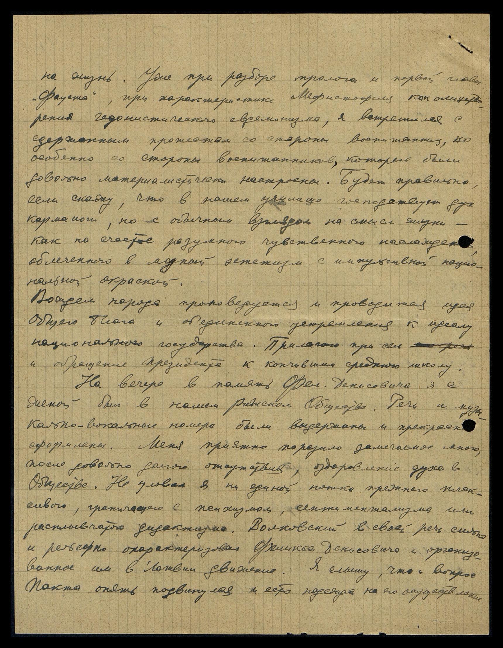 На вечере в память о Феликсе Денисовиче [Лукине] я с женой был в нашем Рижском Обществе. Речь и музыкально-вокальные номера были выдержаны и прекрасно оформлены. Меня приятно поразило замеченное мною, после довольно долгого отсутствия, оздоровление духа в Обществе. Не уловил я ни единой нотки прежнего плаксивого, граничащего с психизмом сентиментализма или расплывчатого дидактизма. Волковский в своей речи сильно и рельефно охарактеризовал Феликса Денисовича и организованное им в Латвии движение. Я слышу, что и вопрос Пакта опять подвинулся, и есть надежда на его осуществление